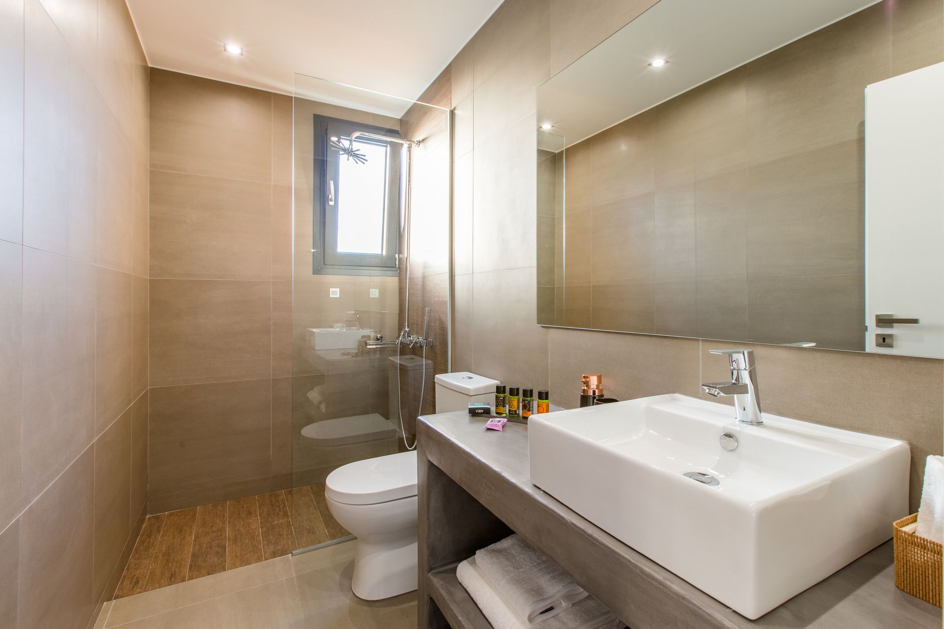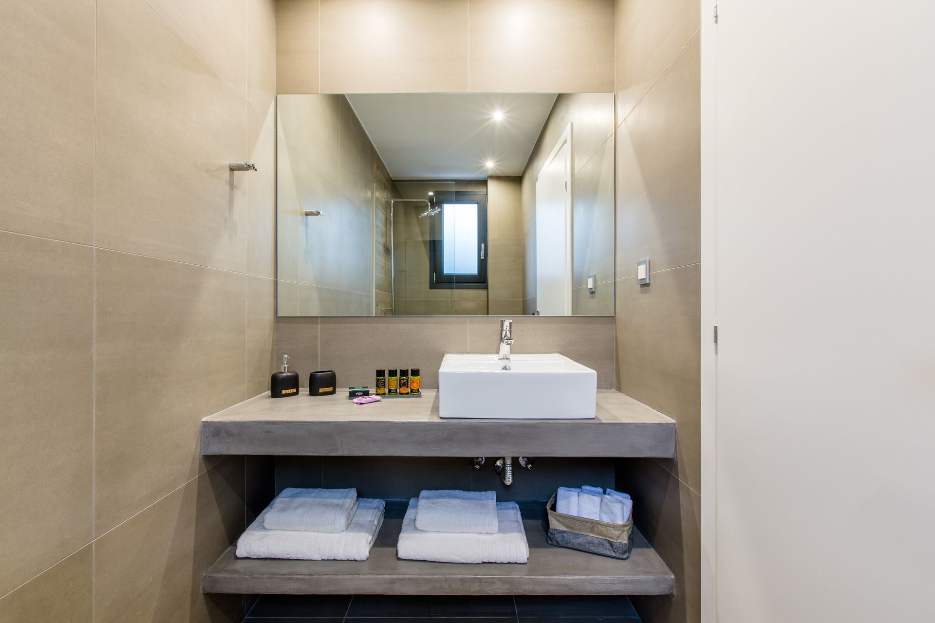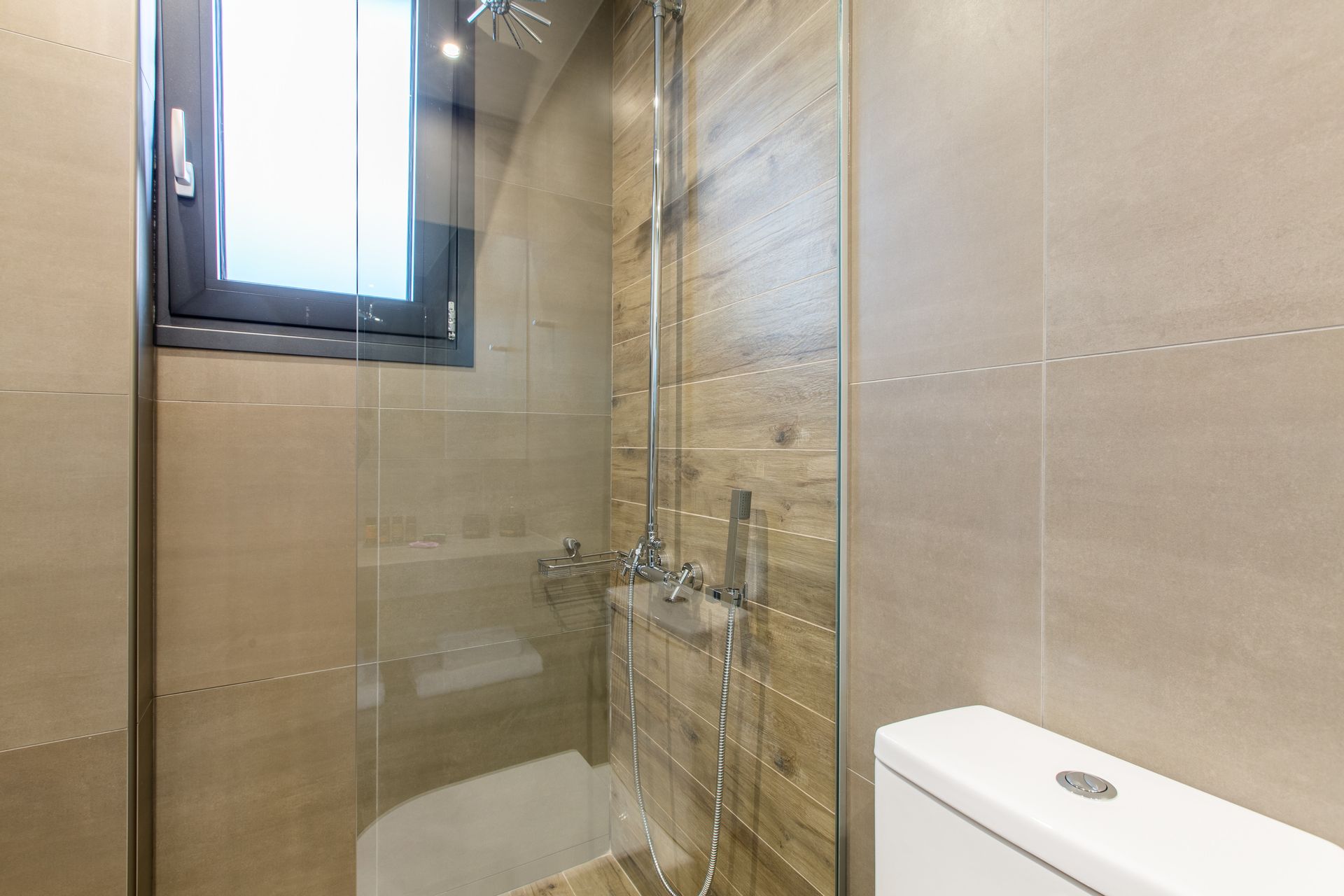 Villa Magda consists of six bedrooms, with double-sized beds and their own smart TV, and five bathrooms. On the first level, there are three bedrooms with en-suite bathrooms and at the second level, there are the rest three bedrooms and two bathrooms. In the same level, there is also the living room with a flat 50’’ satellite TV and a large corner sofa, where 2 more persons can sleep, the dining room with seating for 8 persons and the fully equipped kitchen with an extra dining table and a bar with stools where 8 more persons can sit. In the kitchen, a guest can find a fridge-refrigerator, oven, dishwasher, coffee machine, toaster, kettle, microwave, dishes & utensils. This level has direct access to the pool and the main terrace where you can enjoy sunbathing in the comfortable sun loungers.