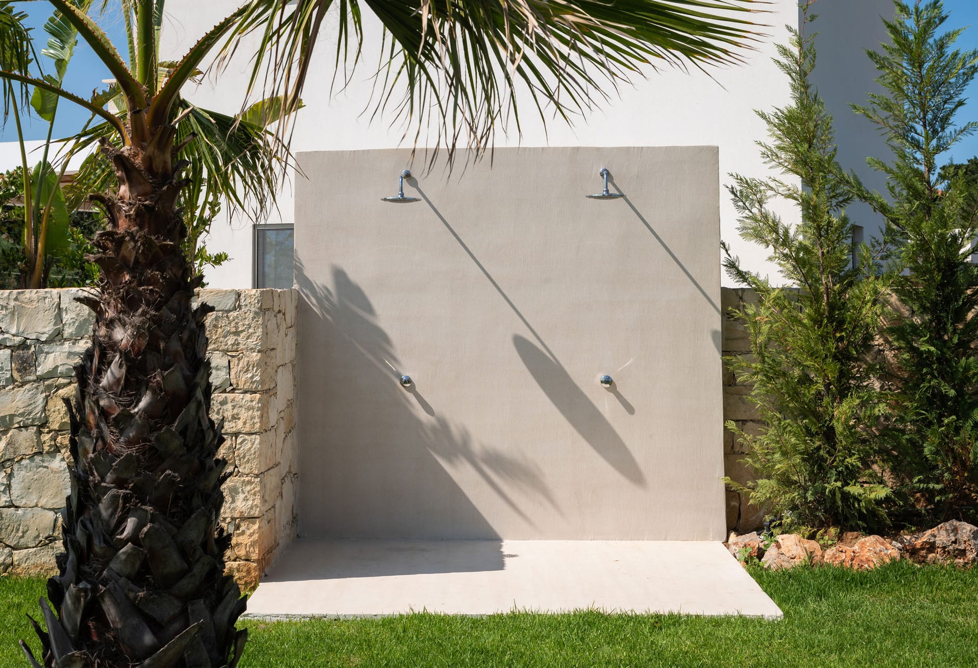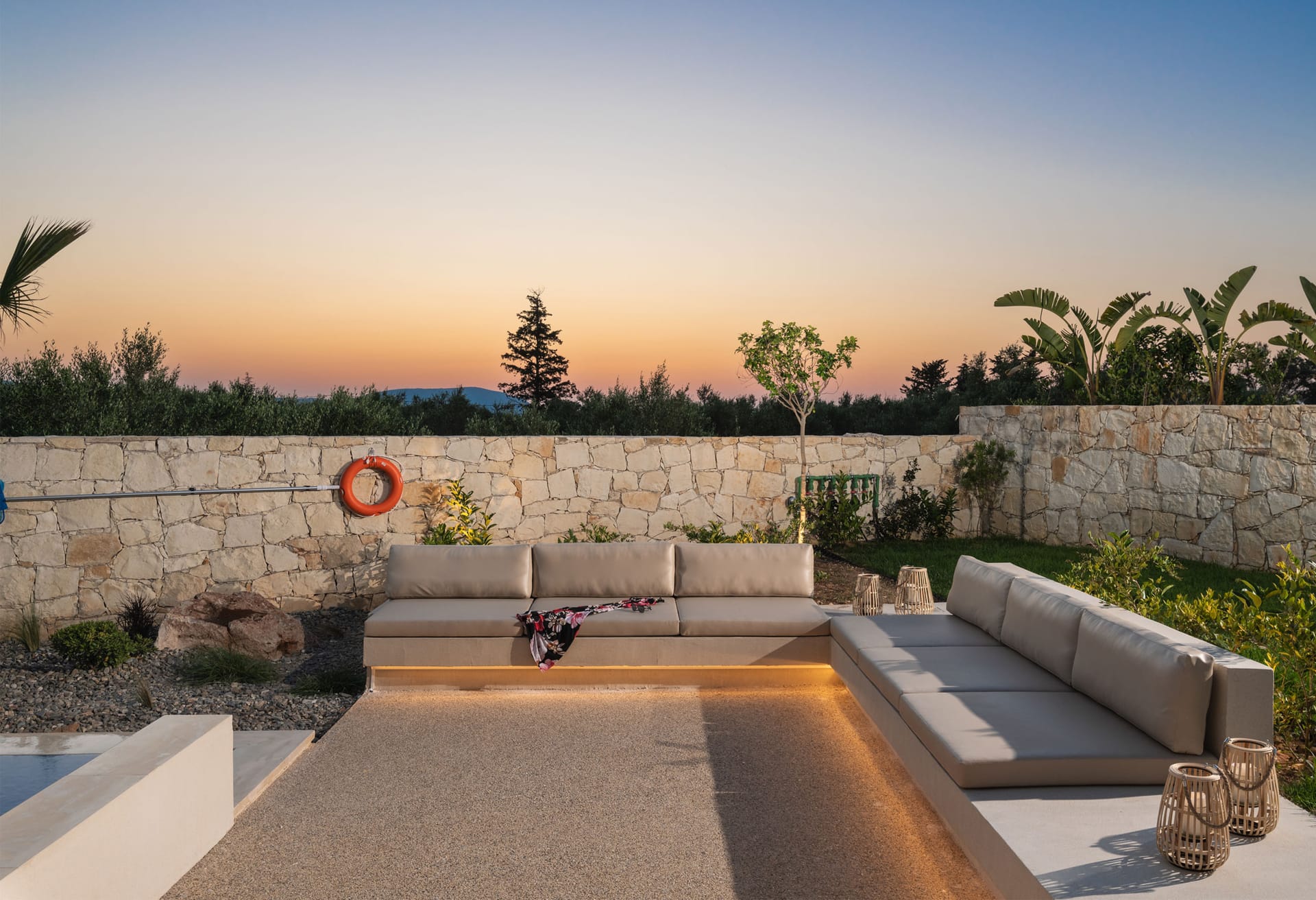 In the exterior areas of the villa you can enjoy a dip and moments of coolness in the private pool, relax on the comfortable sunbeds or enjoy the luxury of the bed in the water under the Mediterranean sun. The BBQ area is the perfect place to show off your culinary talent or invite the villa chef to create delicious dishes for you to enjoy in the covered outdoor dining area. The entertainment continues in the garden, where endless hours of play and fun await. Here you can challenge your loved ones to a friendly game of table tennis while the kids enjoy the trampoline.