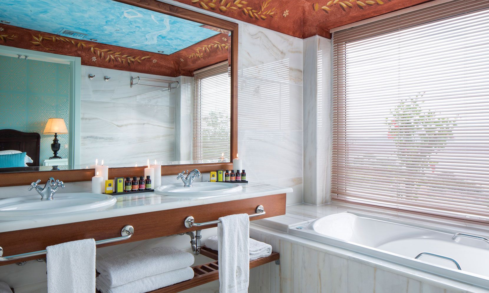The meticulously appointed living spaces include a luxurious master bedroom with en suite bathroom and two twin bedrooms with shared bathroom, all flooded with natural light that awakens the senses. Soak up their inspiring atmosphere enhanced by warm or vibrant colors, fine textiles and elegant pieces of furniture and succumb to the luxurious feel of the impressive trompe l’oeil hand-painted ceilings and marble touches in the vast bathrooms.