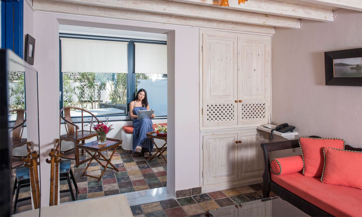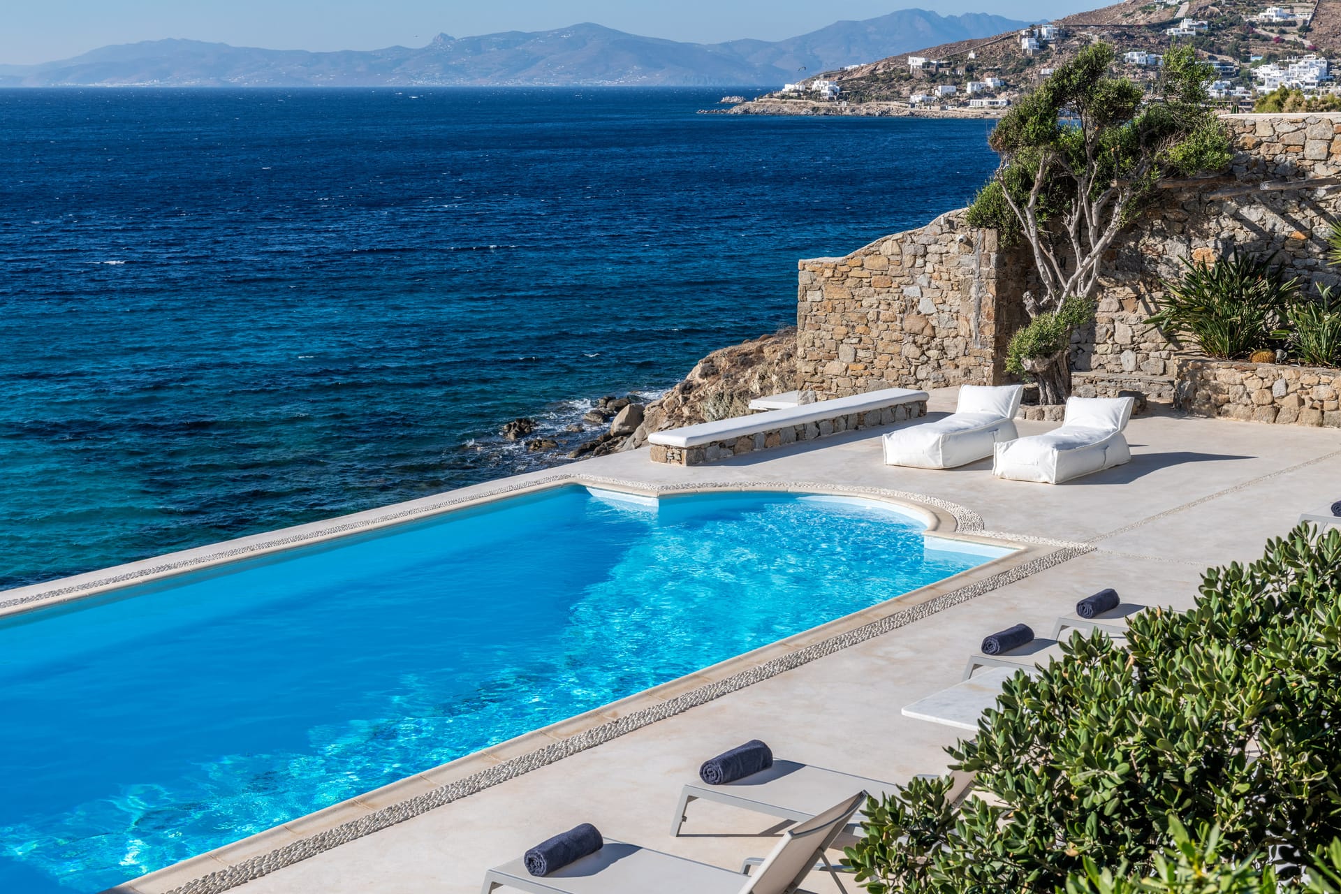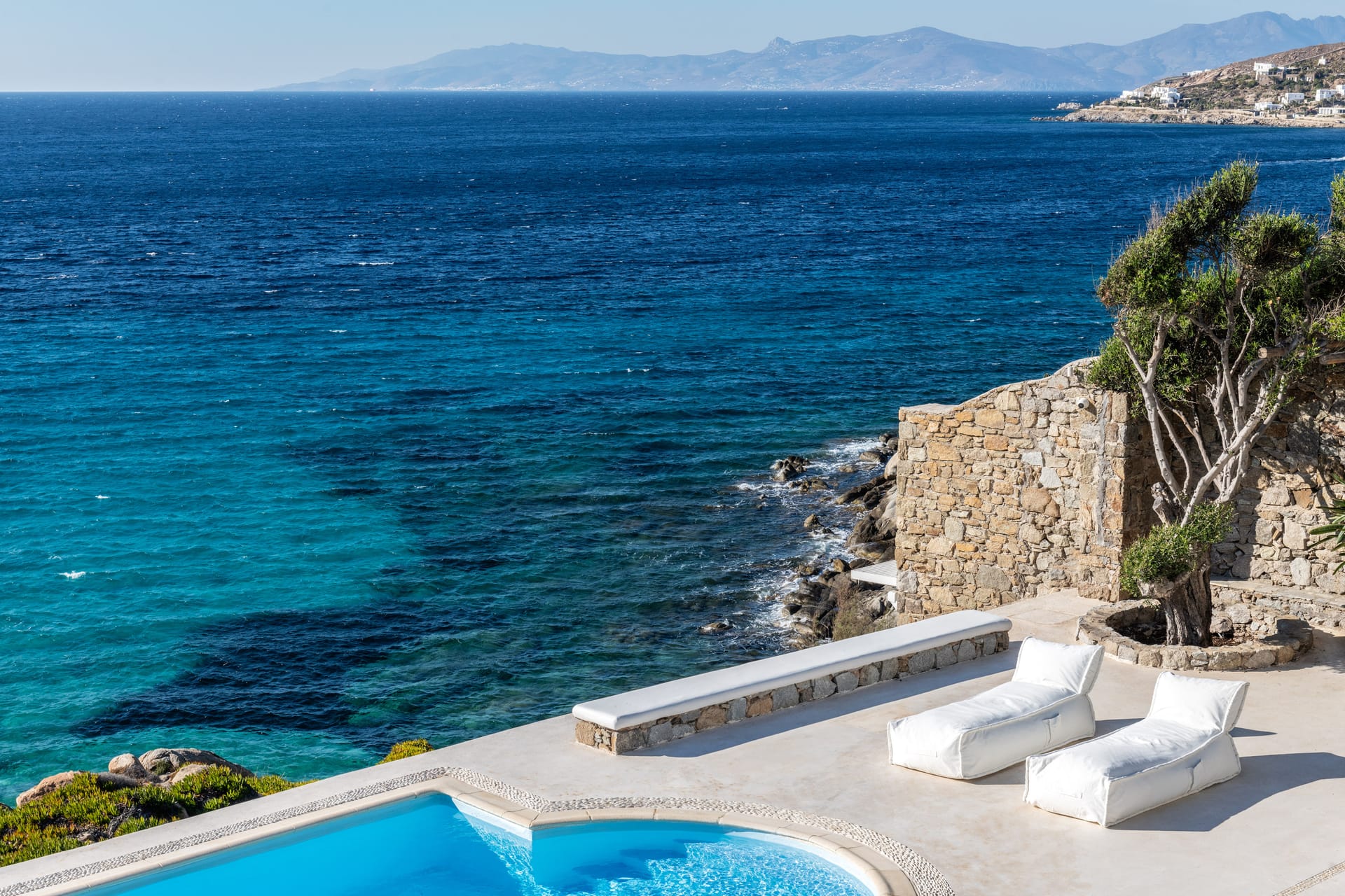 Outside there are a private yard and a balcony, overlooking the Aegean Sea and the most famous sunset, with a dining area for 10 persons, to enjoy alfresco dining. Also, there is a private outdoor heated hydro massage spa (for 5 persons) and two communal use swimming and sunbathing pools, which combined with the perfect sea view, will keep you there the whole day. The luxury combined with the ultimate privacy offers you an unforgettable stay and a unique experience.
