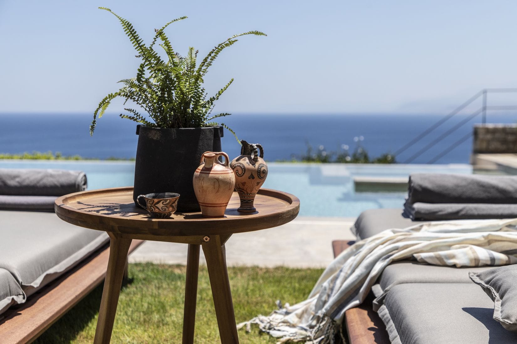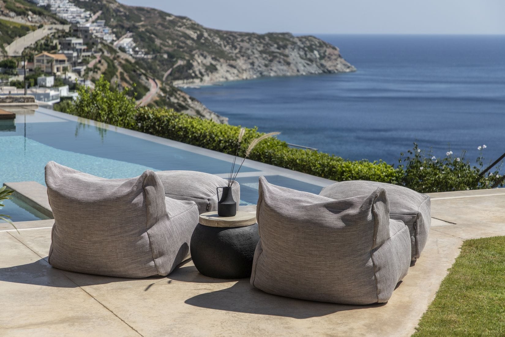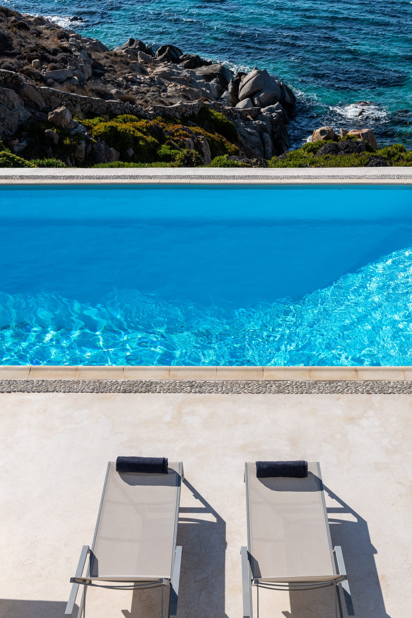 Outside there are a private yard and a balcony, overlooking the Aegean Sea and the most famous sunset, with a dining area for 10 persons, to enjoy alfresco dining. Also, there is a private outdoor heated hydro massage spa (for 5 persons) and two communal use swimming and sunbathing pools, which combined with the perfect sea view, will keep you there the whole day. The luxury combined with the ultimate privacy offers you an unforgettable stay and a unique experience.