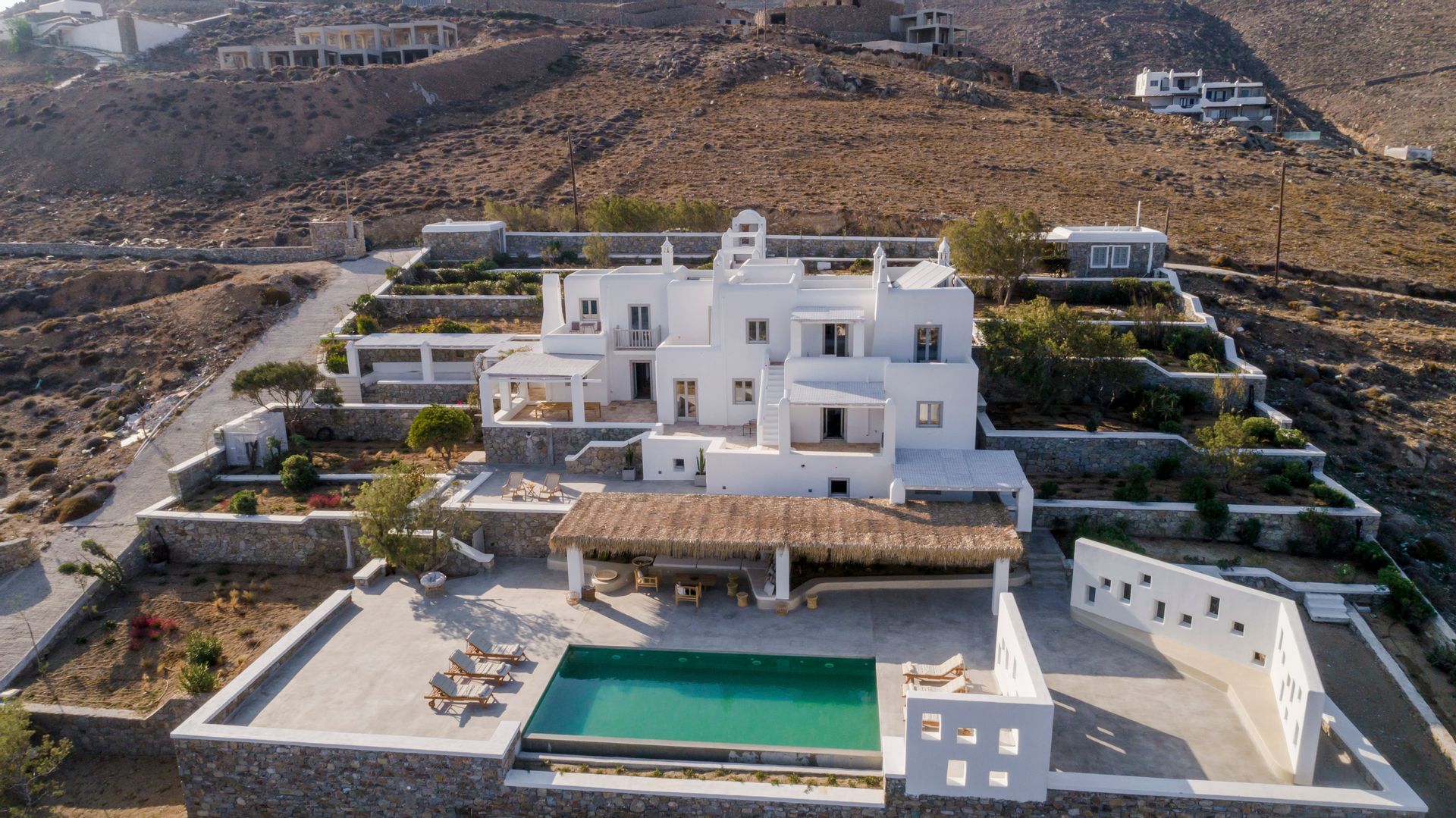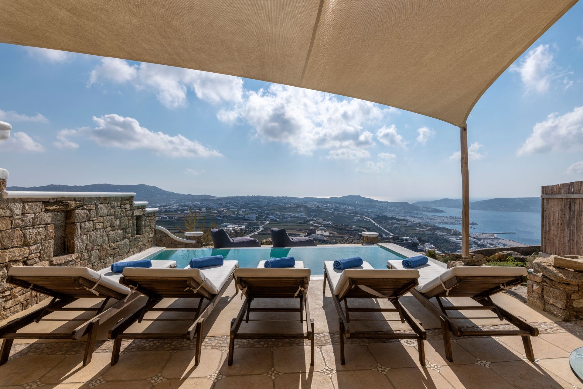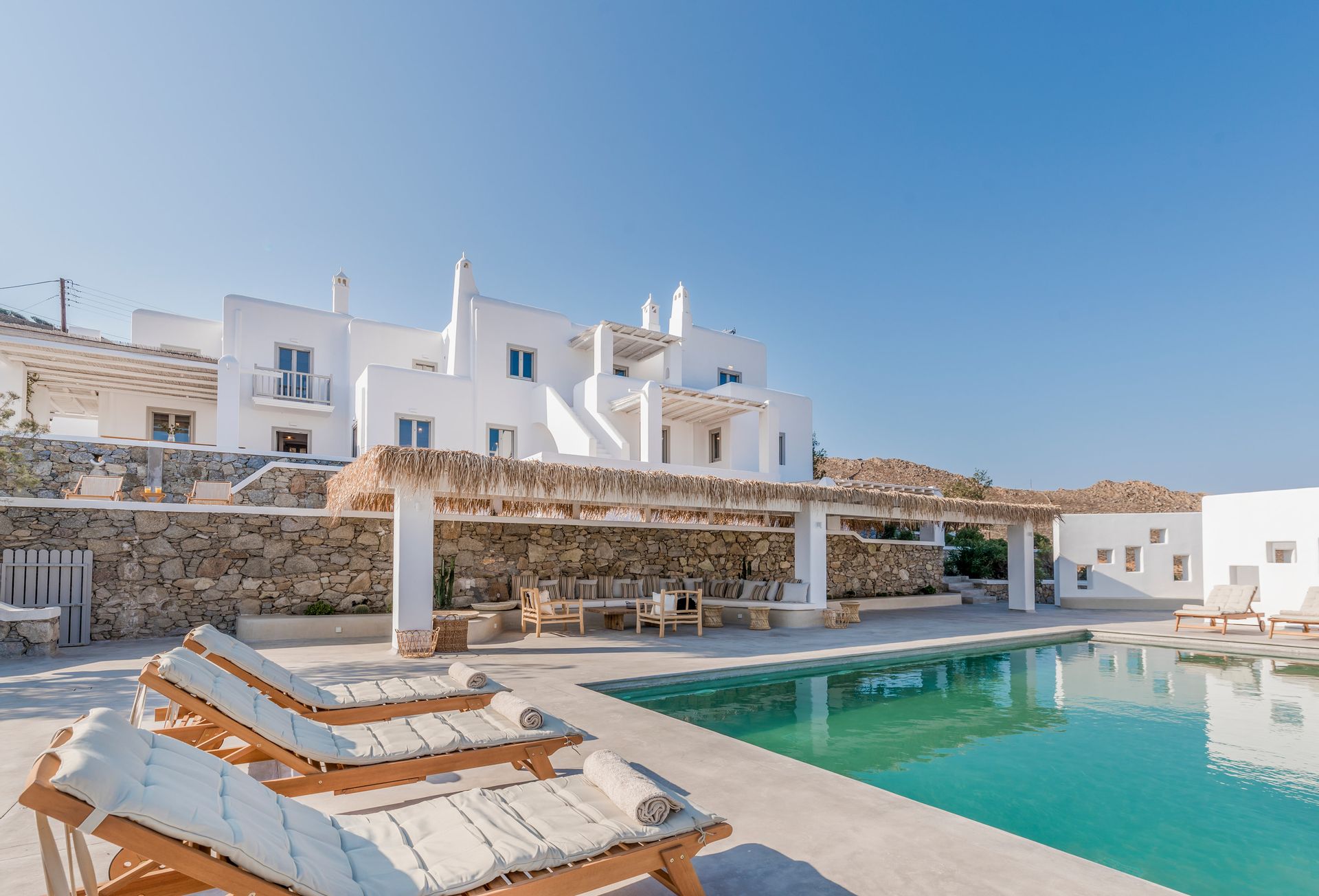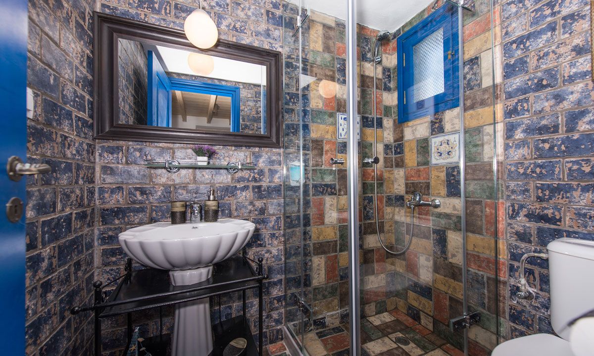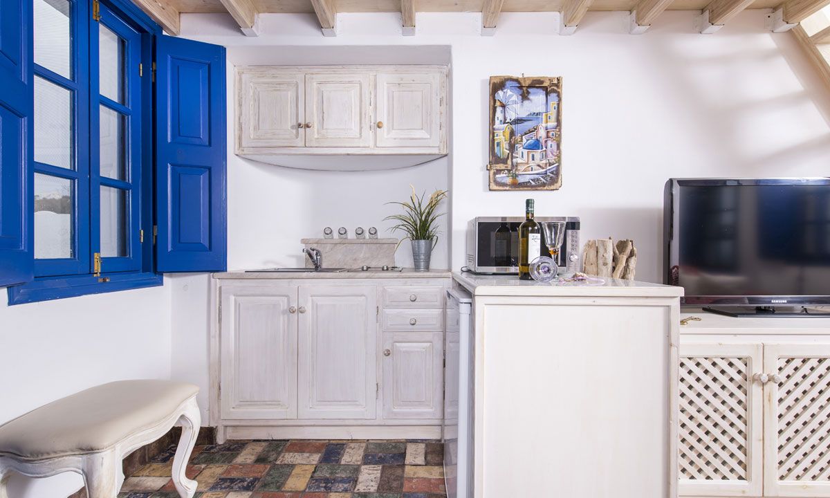Outside there are a private yard and a balcony, overlooking the Aegean Sea and the most famous sunset, with a dining area for 6 persons to enjoy alfresco dining. In addition, there are an outdoor private heated hydro massage spa (for 5 persons) and two communal use swimming and sunbathing pools, which combined with the perfect sea view, will keep you there the whole day. The luxury combined with the ultimate privacy offers an unforgettable stay and a unique experience.