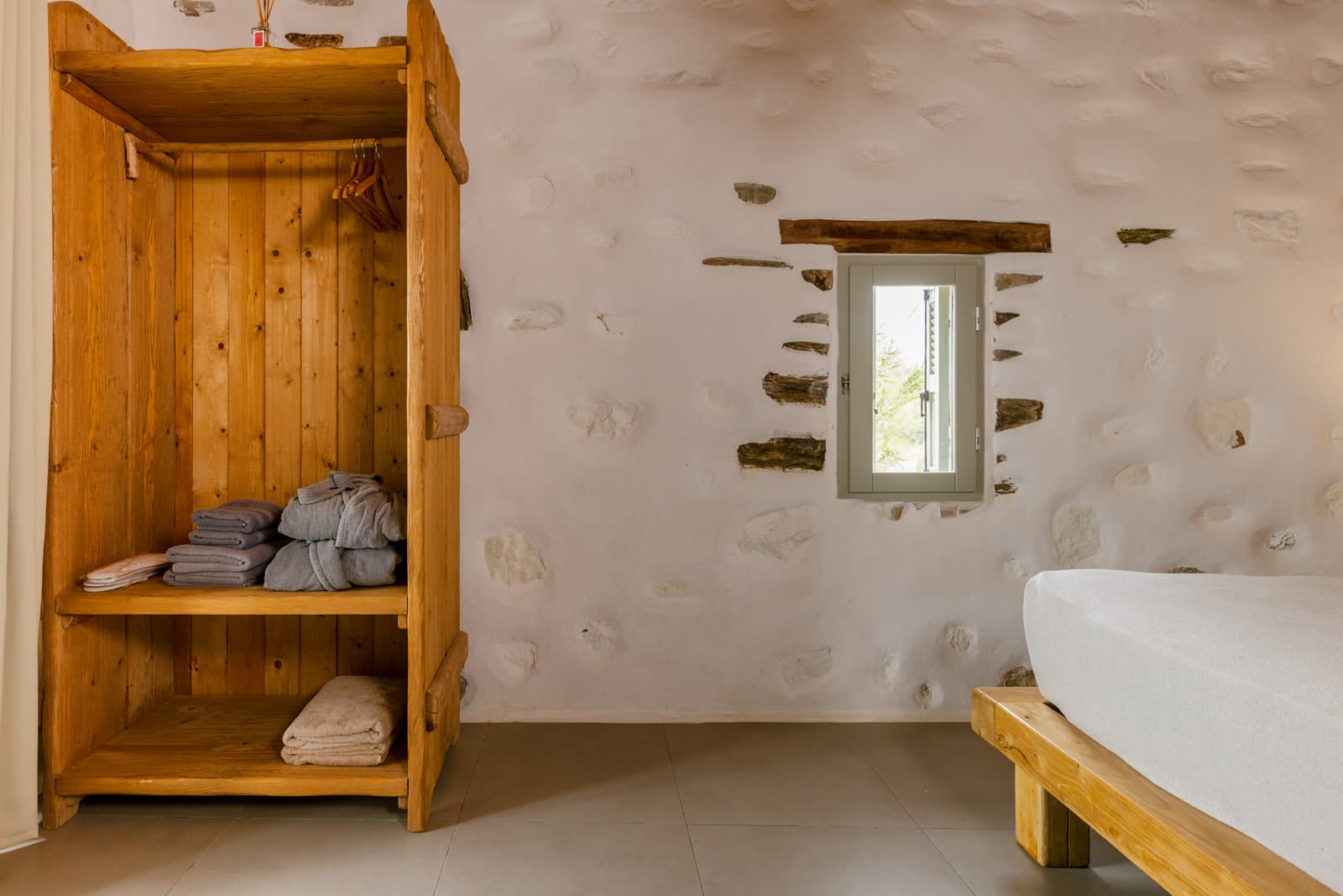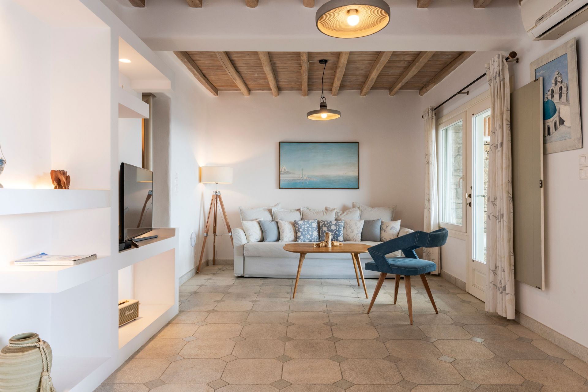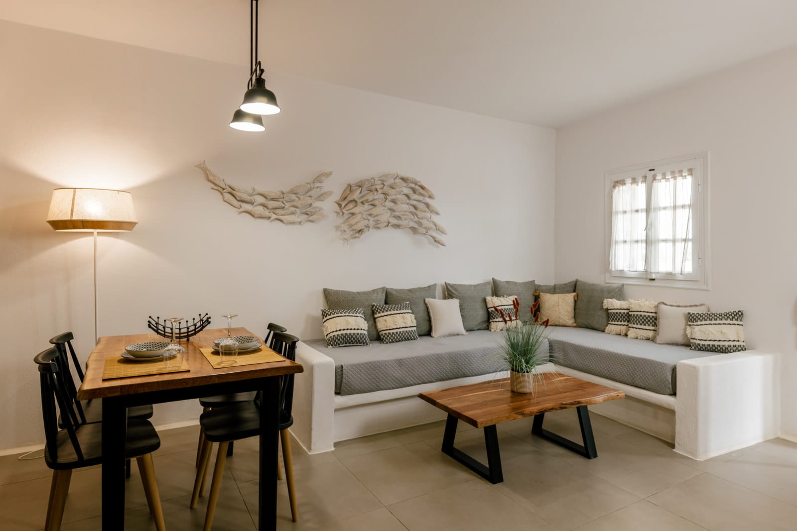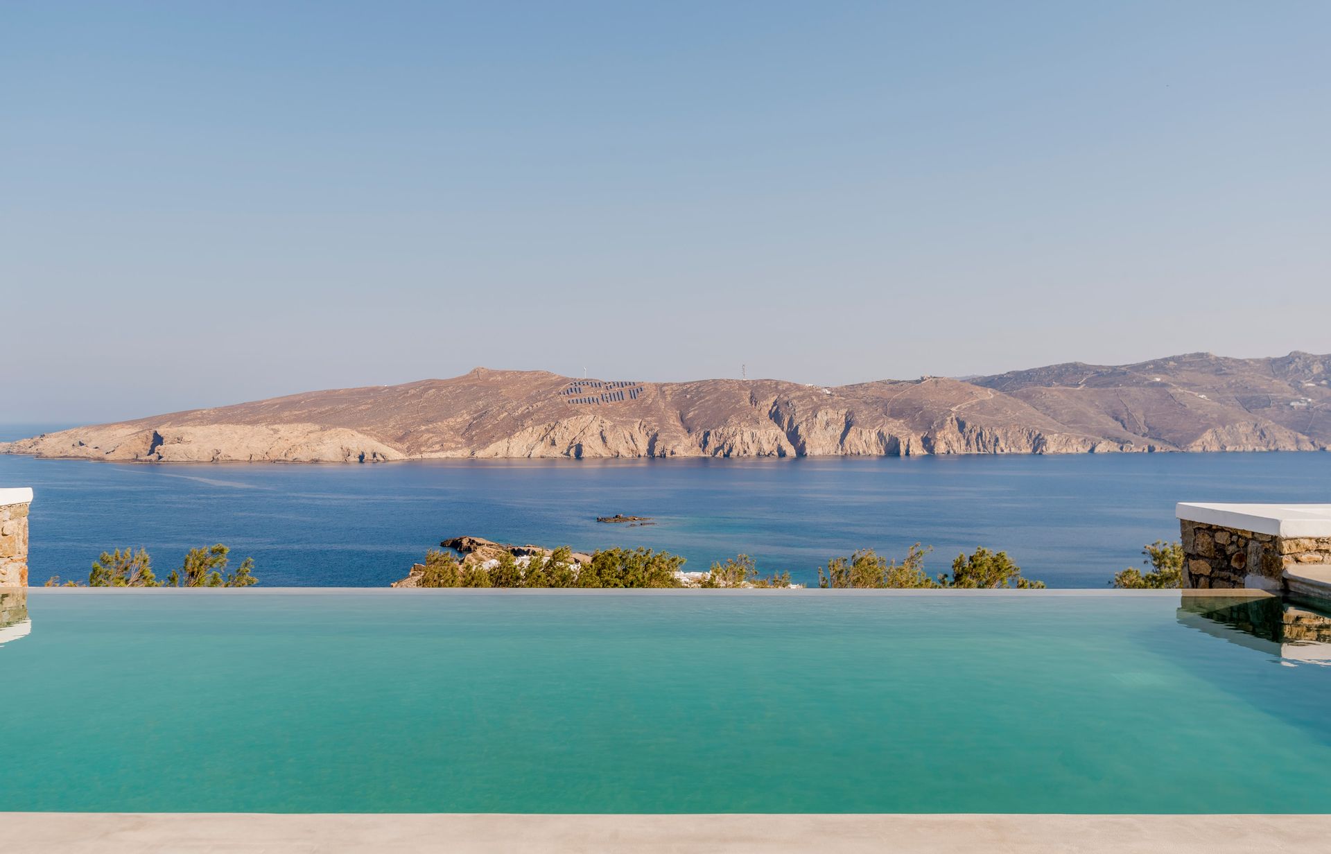 Outside there are a private yard and a balcony, overlooking the Aegean Sea and the most famous sunset, with a dining area for 6 persons to enjoy alfresco dining. In addition, there are an outdoor private heated hydro massage spa (for 5 persons) and two communal use swimming and sunbathing pools, which combined with the perfect sea view, will keep you there the whole day. The luxury combined with the ultimate privacy offers an unforgettable stay and a unique experience.
