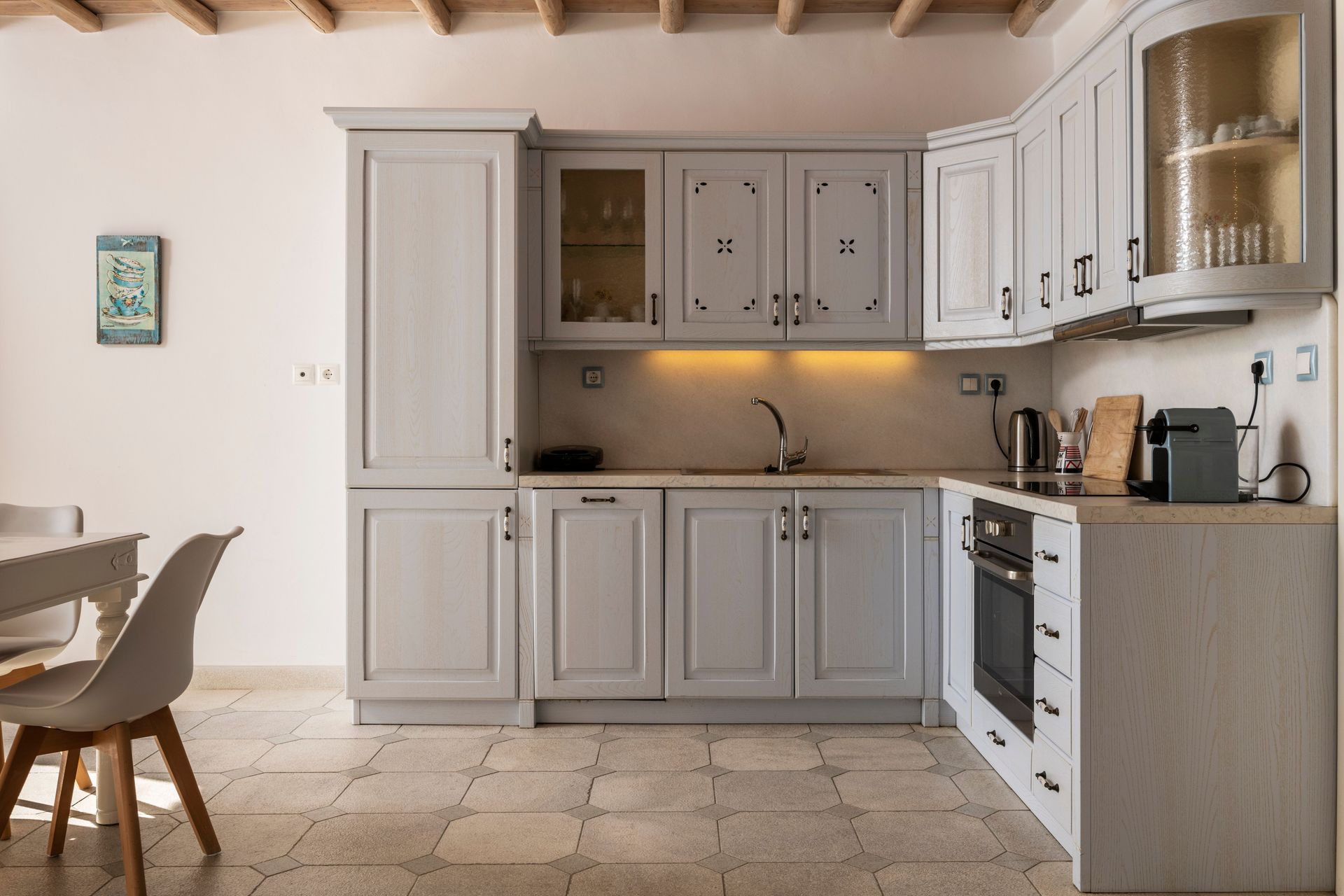 There is a full equipped kitchen with blender, electric Grill, electric Stove, refrigerator, toaster, nespresso and filter coffee maker, boiler, dishes, cooking utensils, pantry items and other modern facilities as well as a kitchenette. Also, there is one extra comfort dining room for 6 persons.
