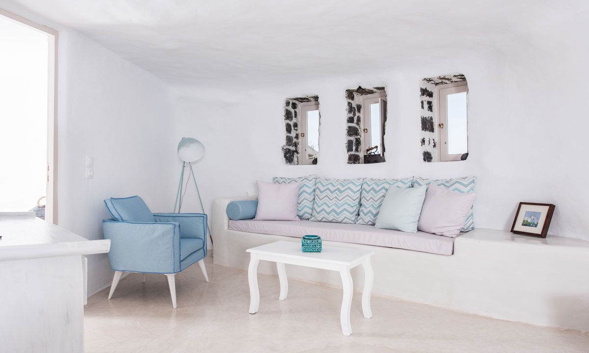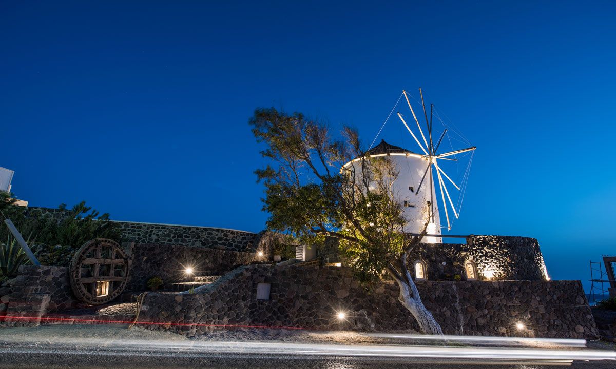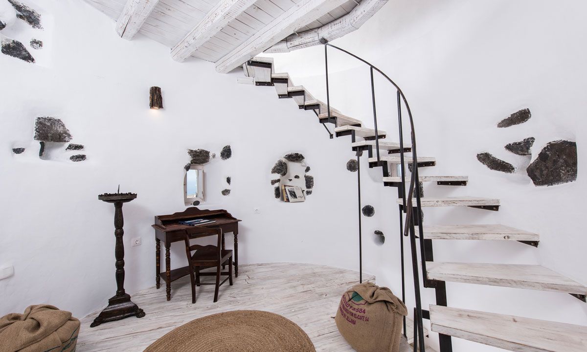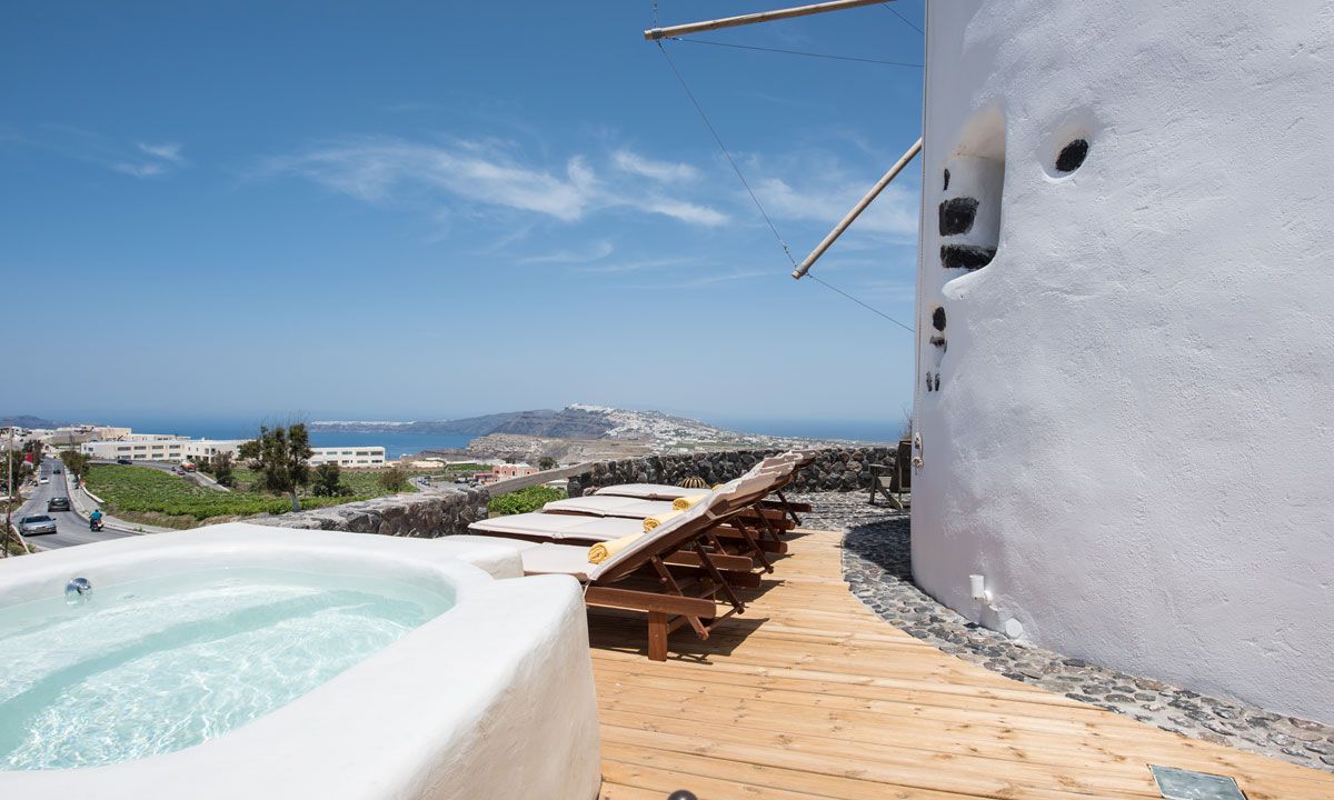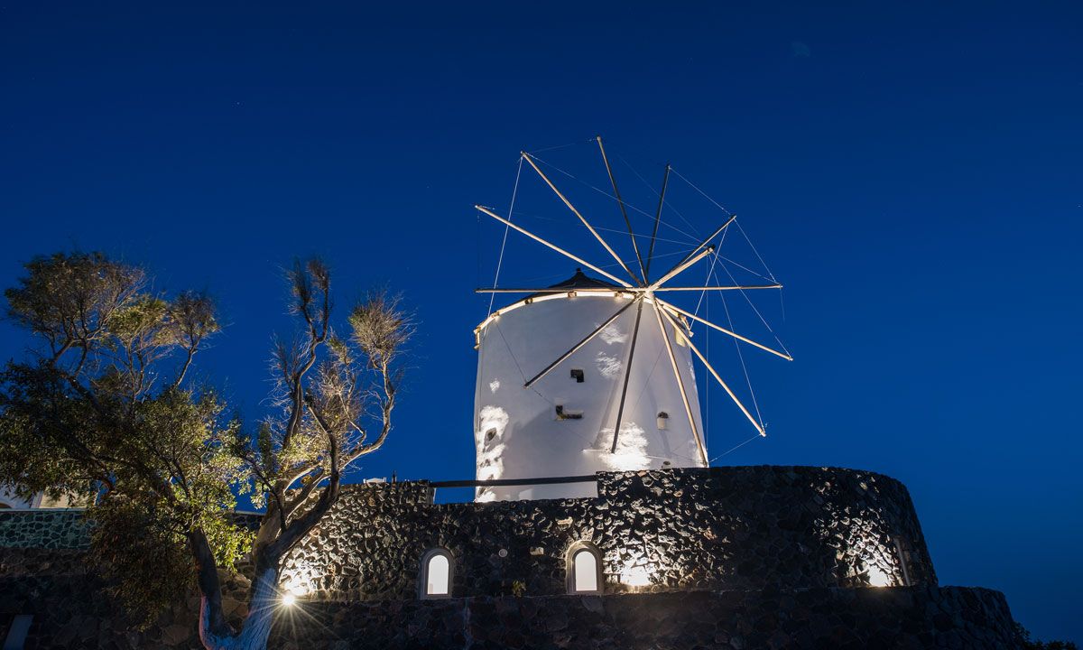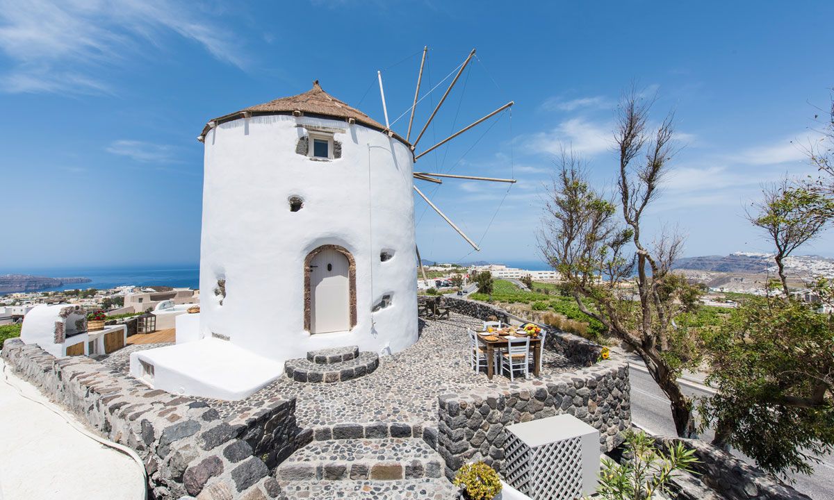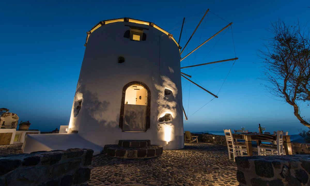 Nestled in the picturesque medieval village of Pyrgos, the three storey imposing Villa Krista Windmill gazes in admiration at the Aegean Sea, the villages and Santorini's famous Caldera. The Windmill has 120 sq. meters interior areas and is decorated with a composition of traditional and modern vintage style.
