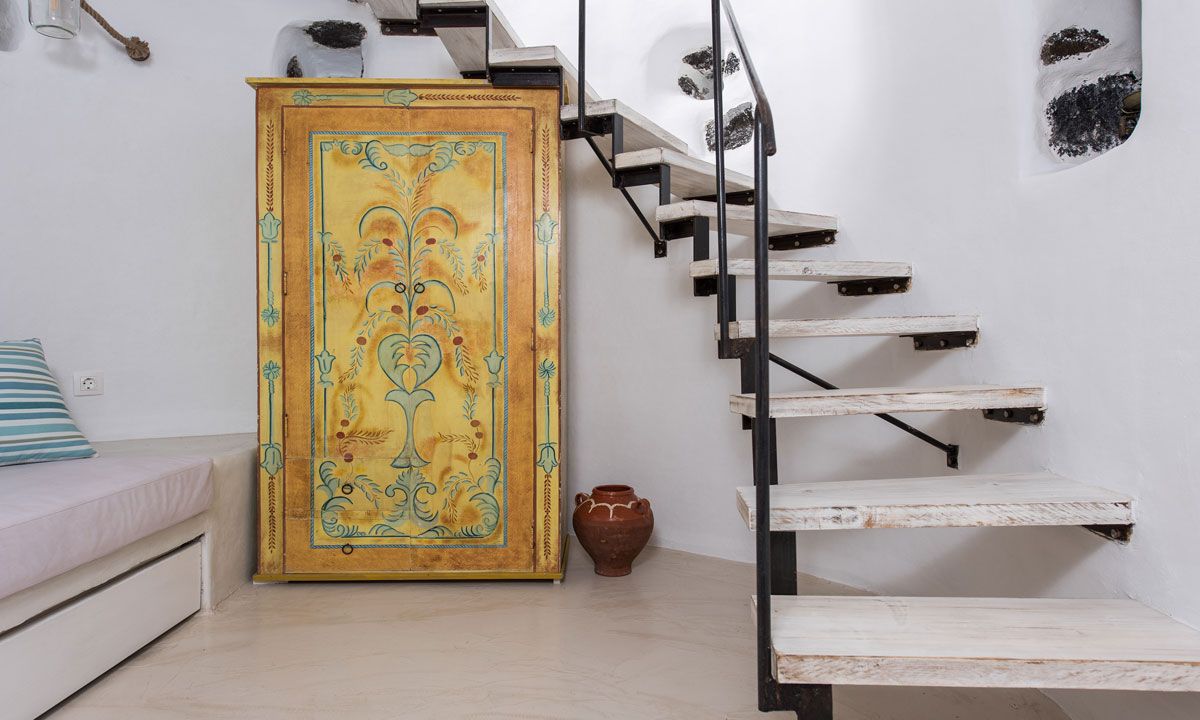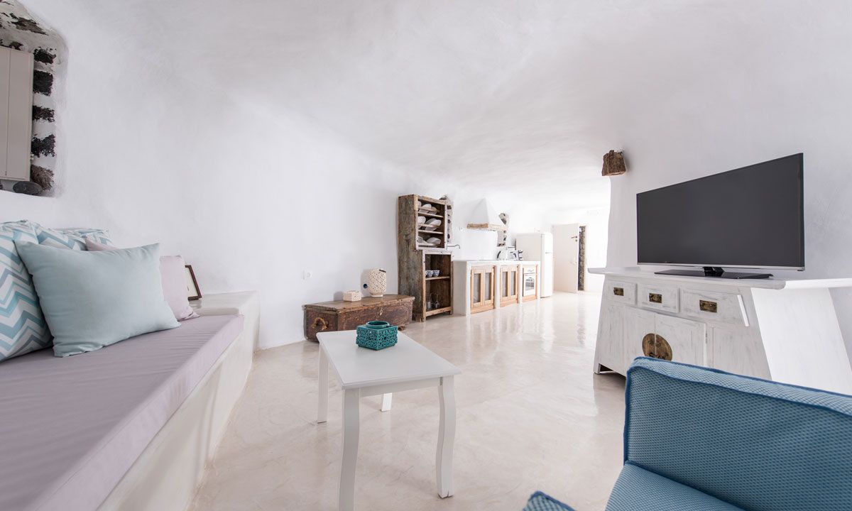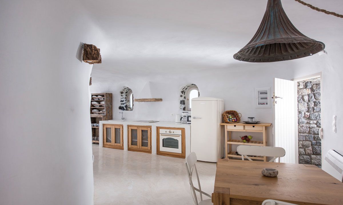 Leaving in an authentic windmill is a unique experience. The three split levels property has two entrances. Entering from the main entrance, one features a bureau with an armchair, a mini bar and a collection of Greek wines. The upper floor has a bedroom with a double bed, a TV and a 360o view. The second entrance features the lower floor which offers a small living room that could be used as a double bedroom, a bathroom, an additional bedroom with a double bed and an ensuite toilet, a spacious living room with an open plan fully equipped kitchen and a dining area.