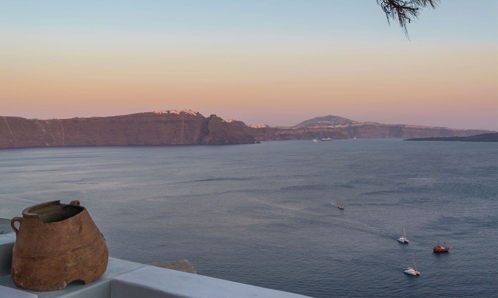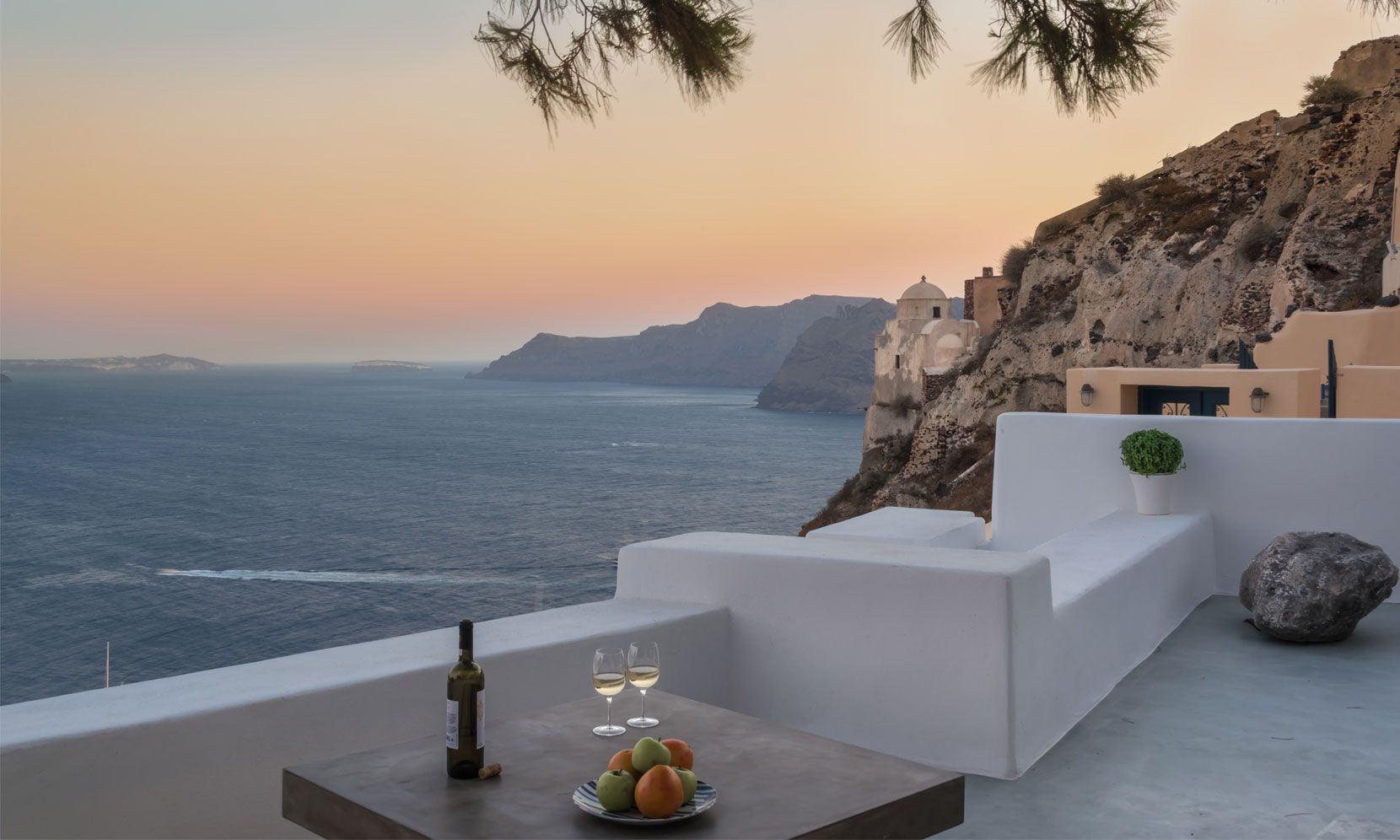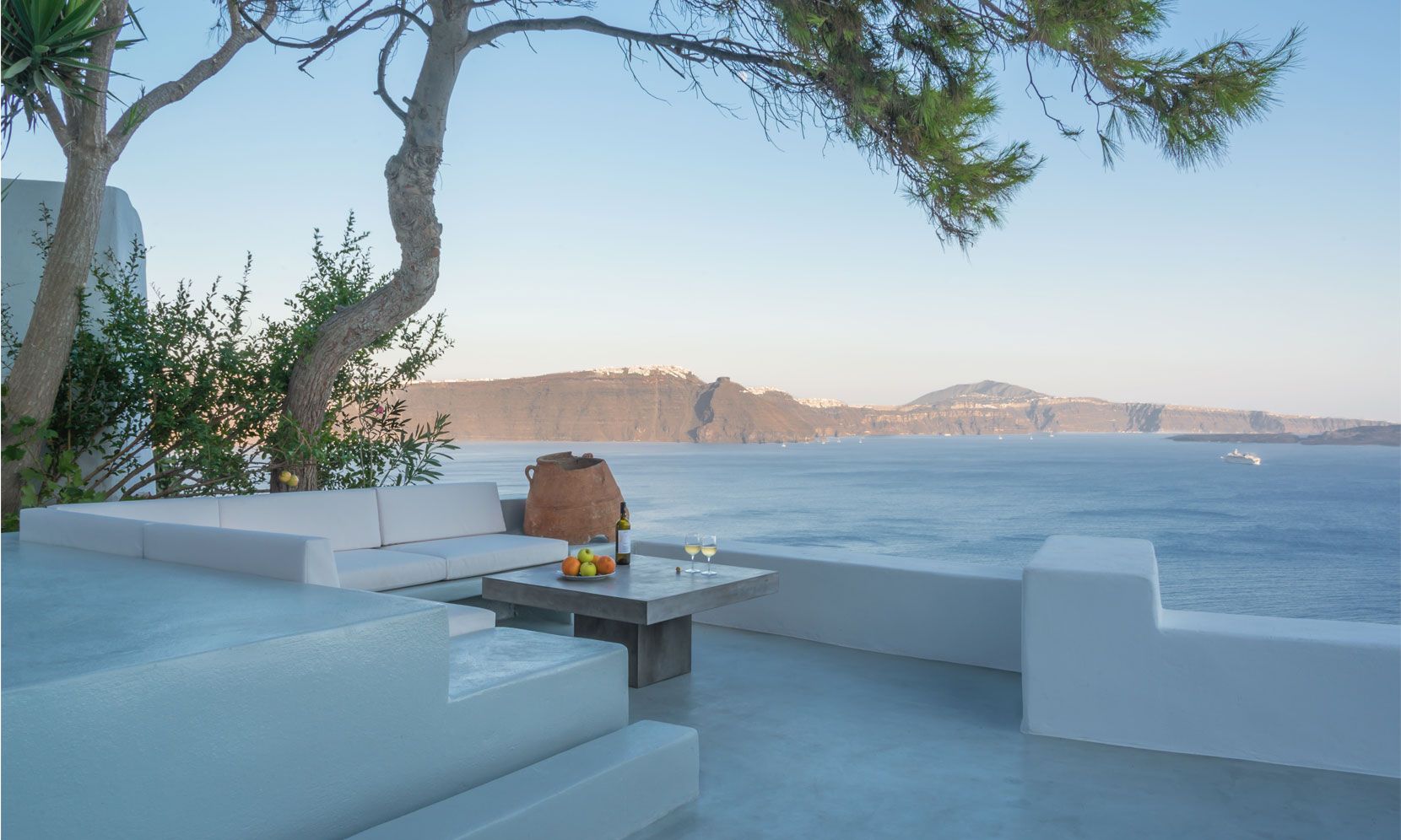 The standout feature of Villa Palma as you come in the large private wooden gate is the pool and stylish stone-built sofa and coffee table under the natural shade of an old indigenous local pine tree. The pool extends out, so you have the volcano view and one end is under an original feature stone arch for sunshade and total privacy. A stylish well-designed outdoor private platform over the Aegean Sea and Santorini caldera.