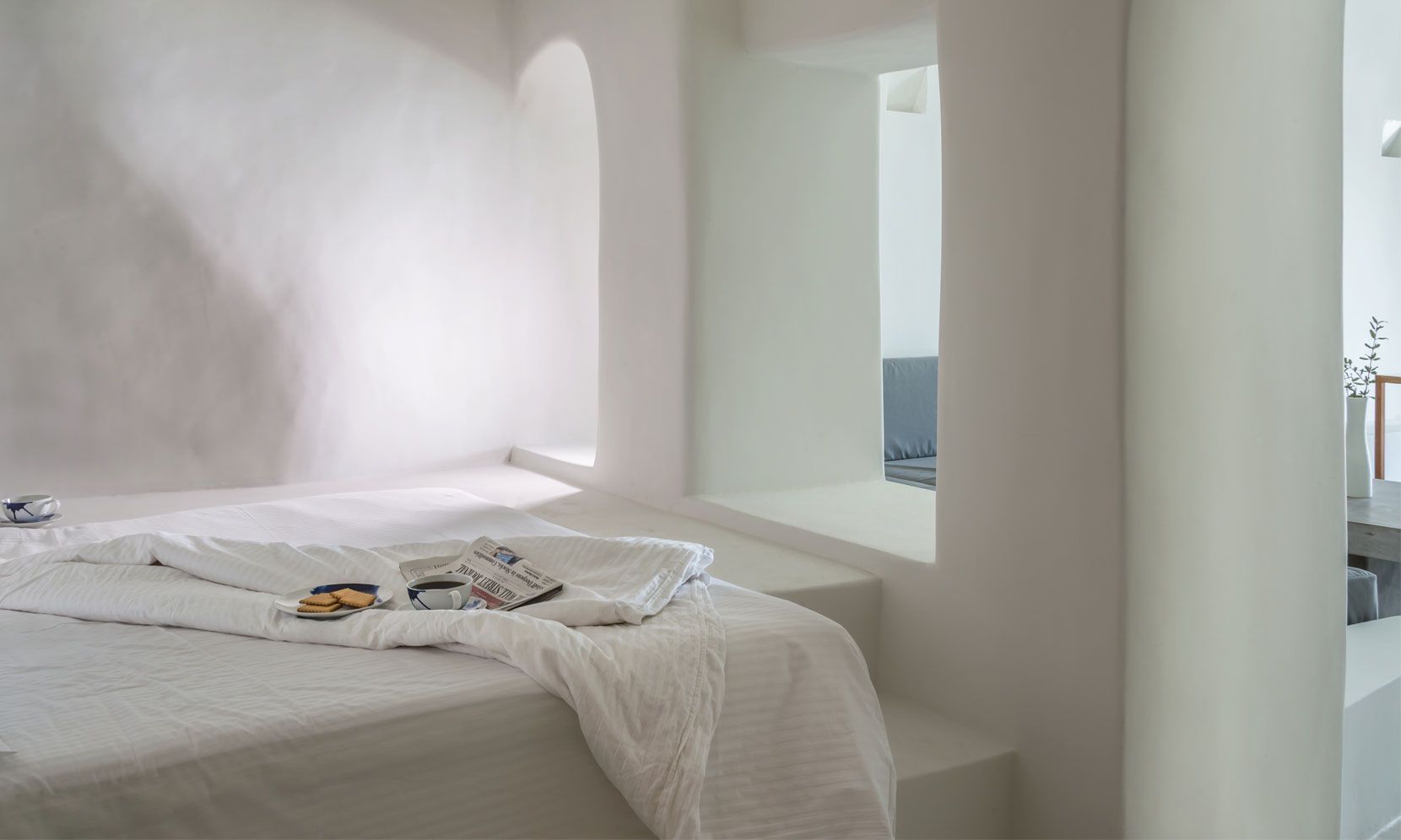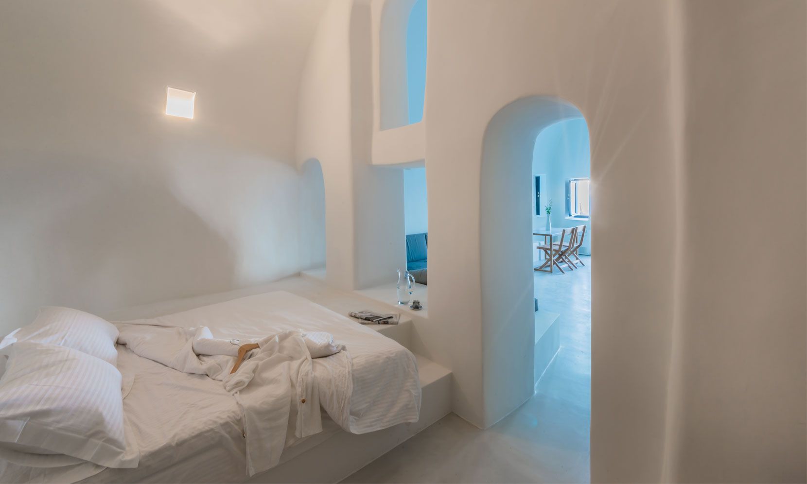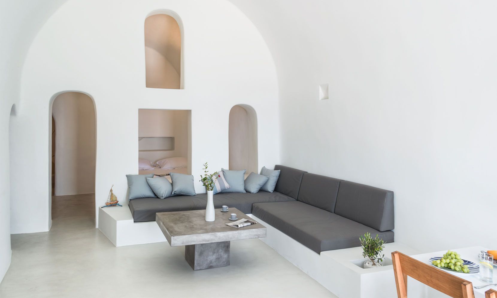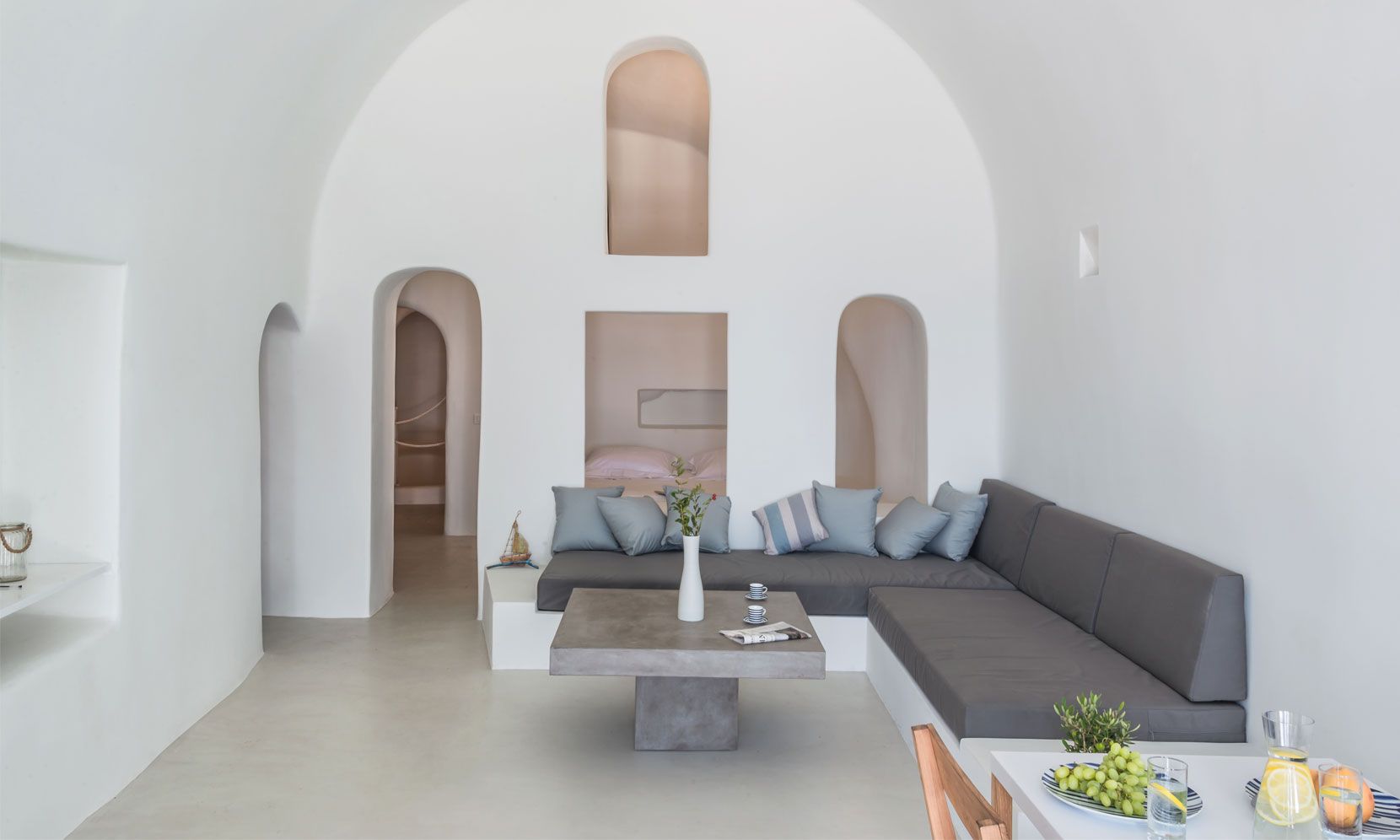 Santorini Villa Palma is a high-standard canava renovation, the vaulted ceilings and arches are restored to smooth white lines, with sunlight flooding through skylight windows. The designer furniture and the local stone floors complete this cool open plan living space. The master bedroom is open plan design, and there is an en-suite bathroom with walk-in rain shower and the bedroom faces out to the front of the canava, so you can lie in bed and look at the stars. The living room has large day bed sofas that can be used for children or friends.