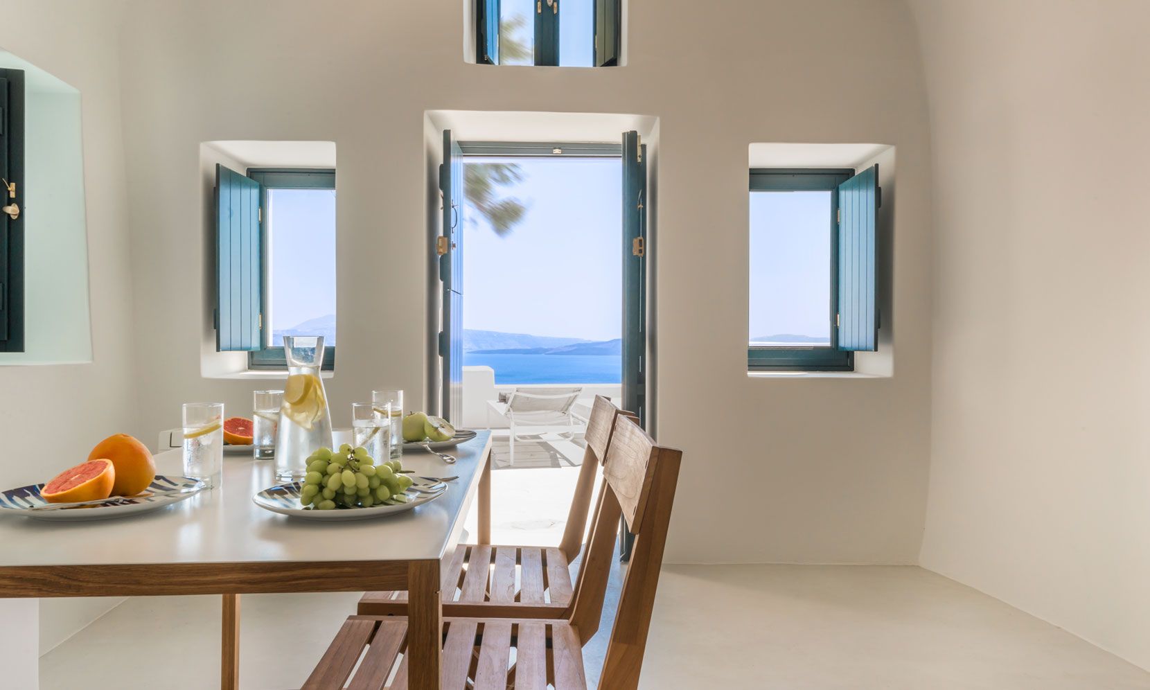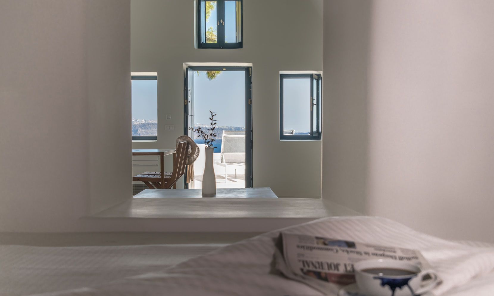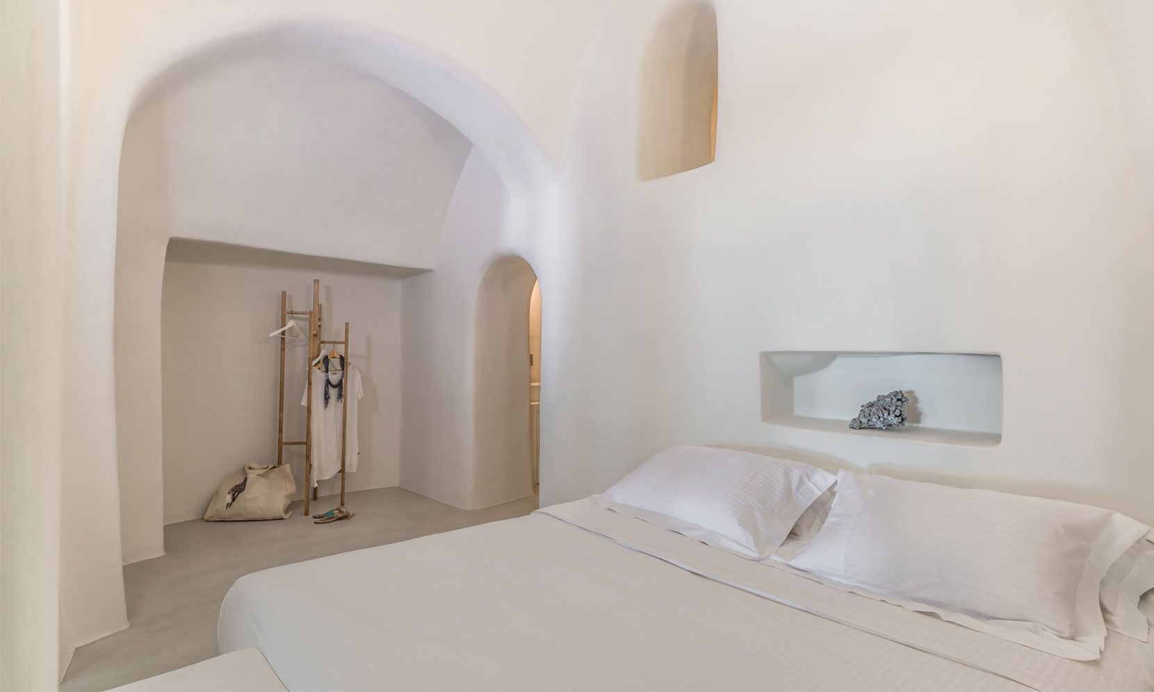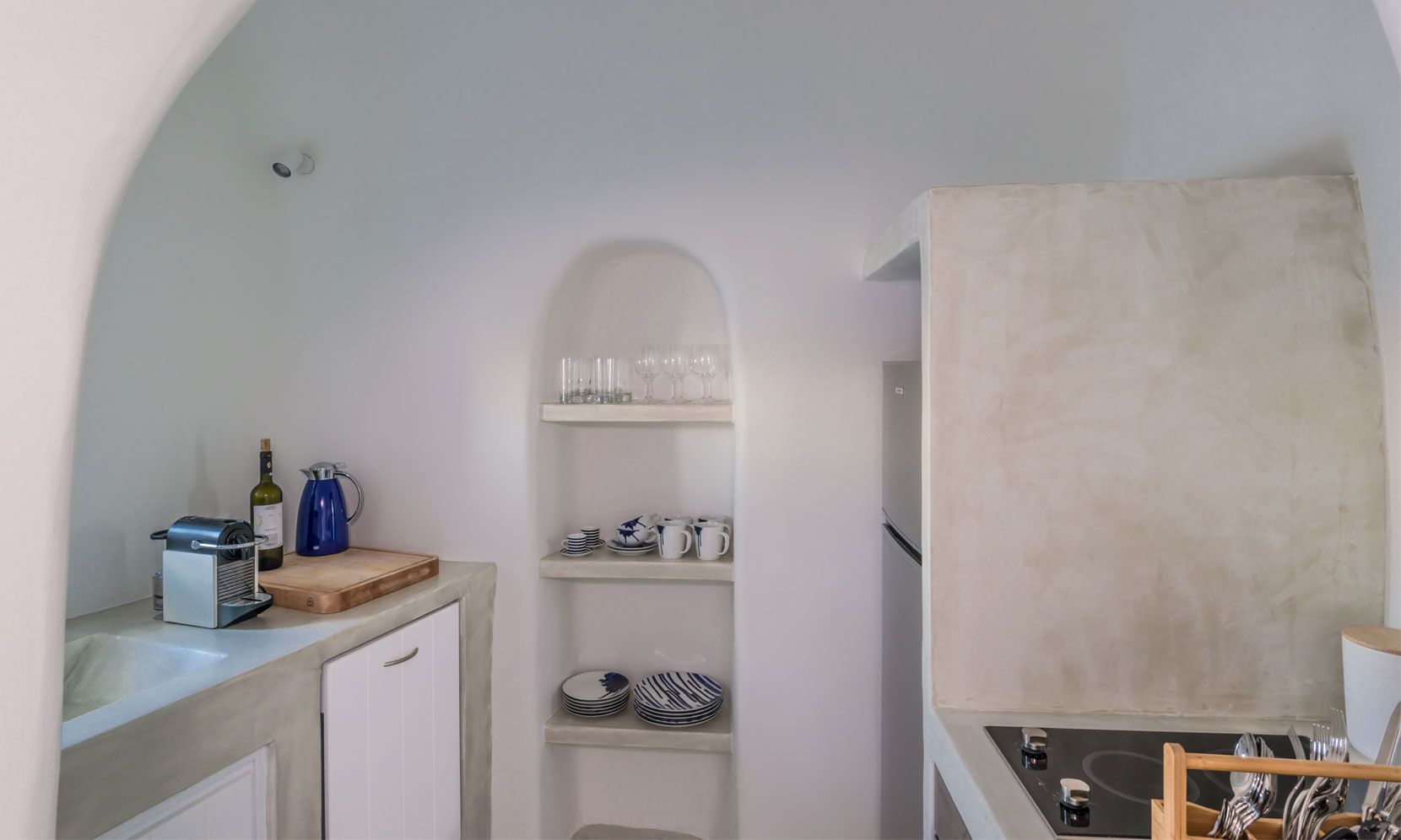 Santorini Villa Palma is a high-standard canava renovation, the vaulted ceilings and arches are restored to smooth white lines, with sunlight flooding through skylight windows. The designer furniture and the local stone floors complete this cool open plan living space. The master bedroom is open plan design, and there is an en-suite bathroom with walk-in rain shower and the bedroom faces out to the front of the canava, so you can lie in bed and look at the stars. The living room has large day bed sofas that can be used for children or friends.