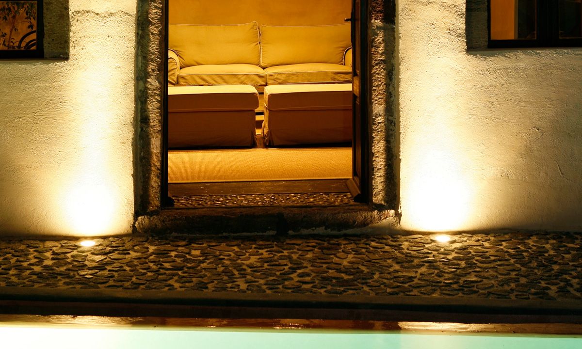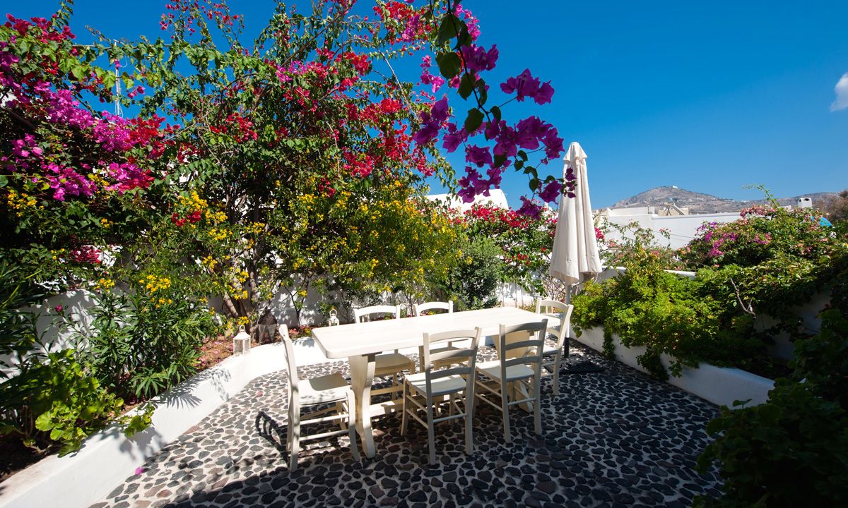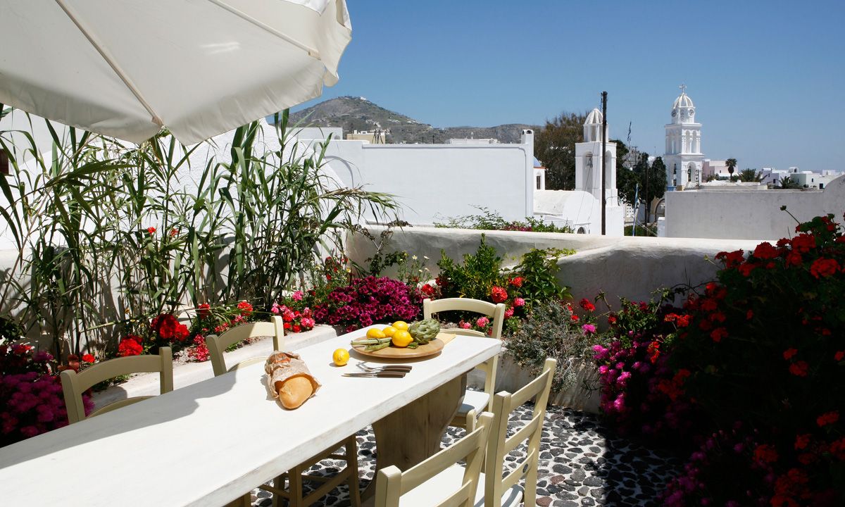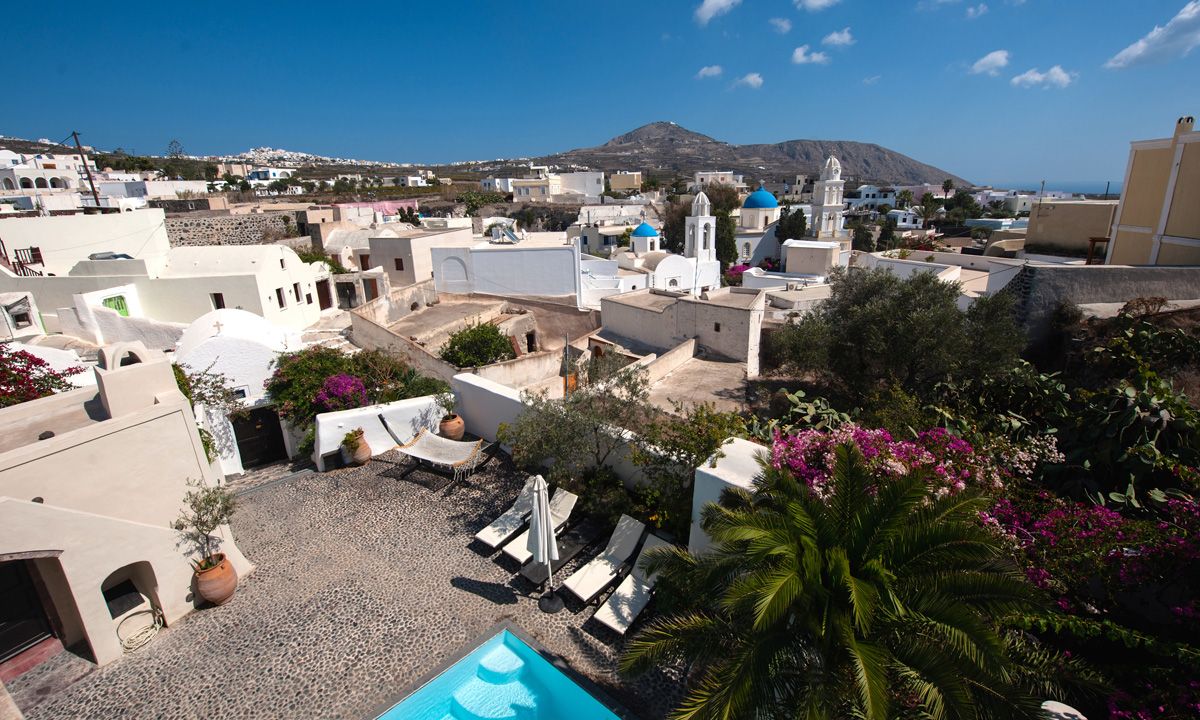 The villa is situated just a short stroll from the central village square in Santorini with its pretty churches and picturesque Venetian bell towers. The village, with its winding cobbled pathways, is free of traffic. Access to the house is through imposing large wooden entrance gates into a secluded and very pretty private courtyard, with garden and a beautiful Moroccan-style swimming pool. There is also a smaller courtyard where the guests can enjoy dining «al fresco» under the Santorini skies whilst absorbing the village atmosphere almost within arms reach.