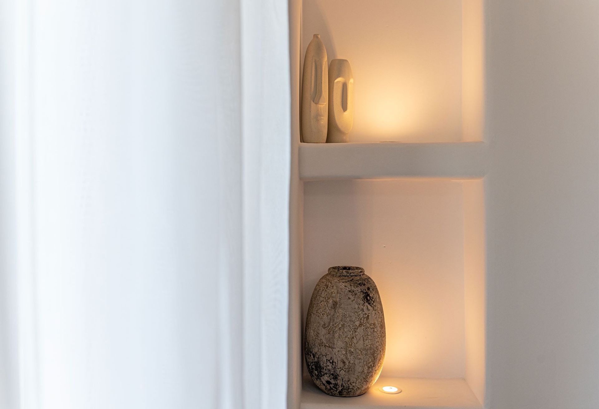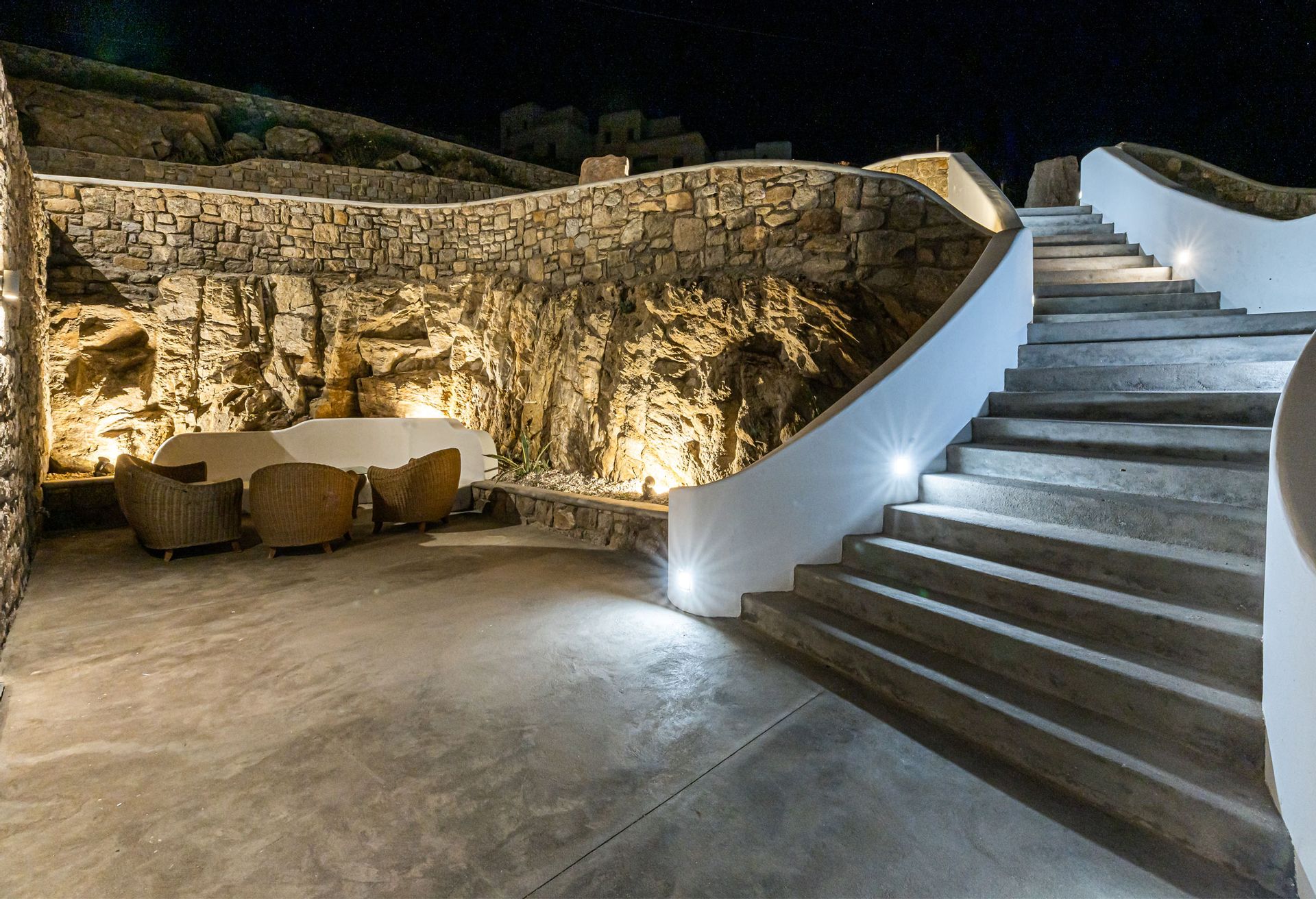 A hillside hideaway in a secluded nearly rural area although close to the town, where you can relax after a long day at the magnificent beaches of the island or a long night in the vivid nightlife. Carved on a hill, 50 m from the coast, in an extraordinary setting framed by beautiful countryside, it blends uniquely in the rocky topography of its hillside, prime and unspoiled, setting.