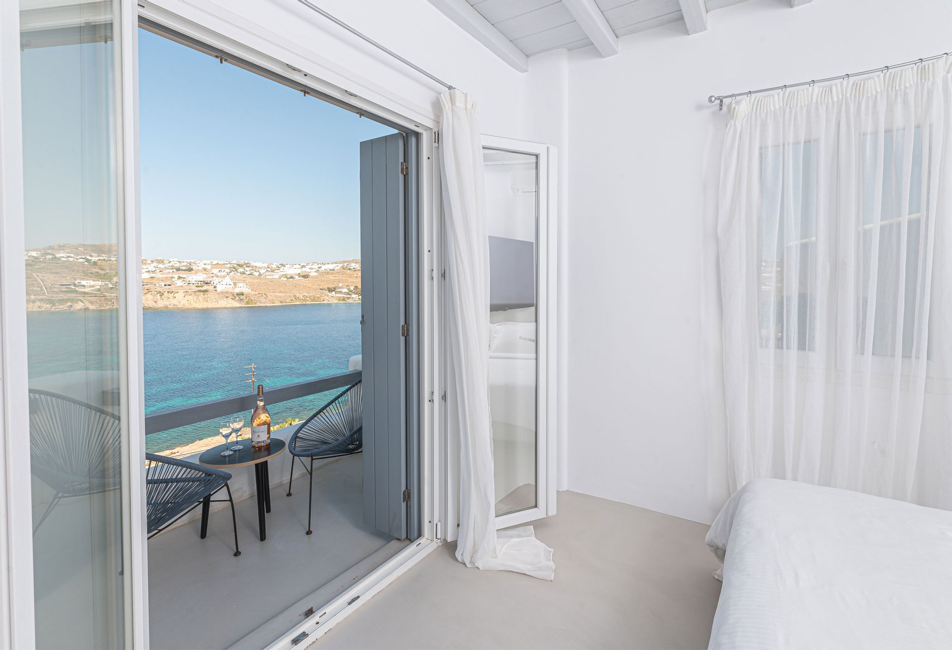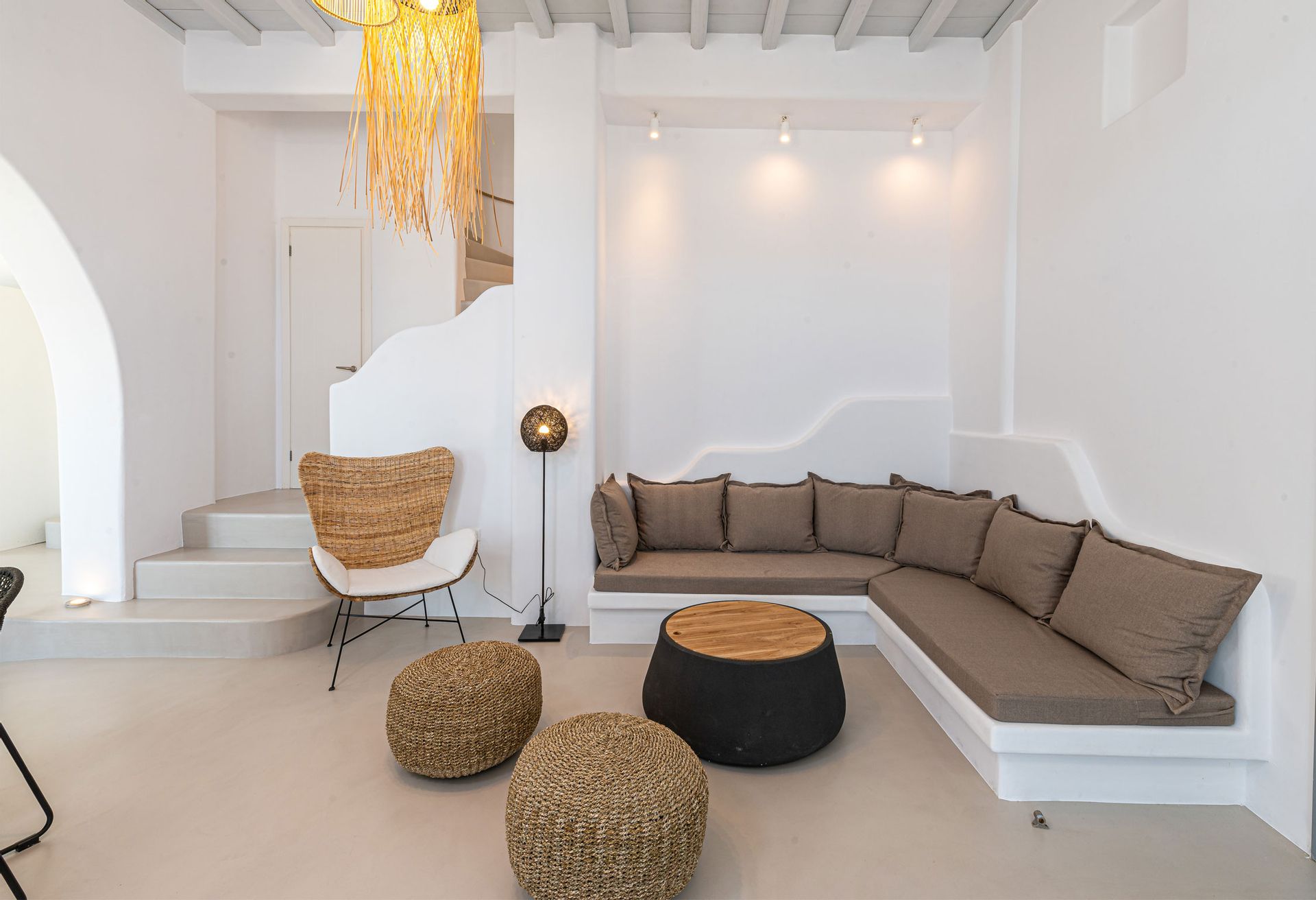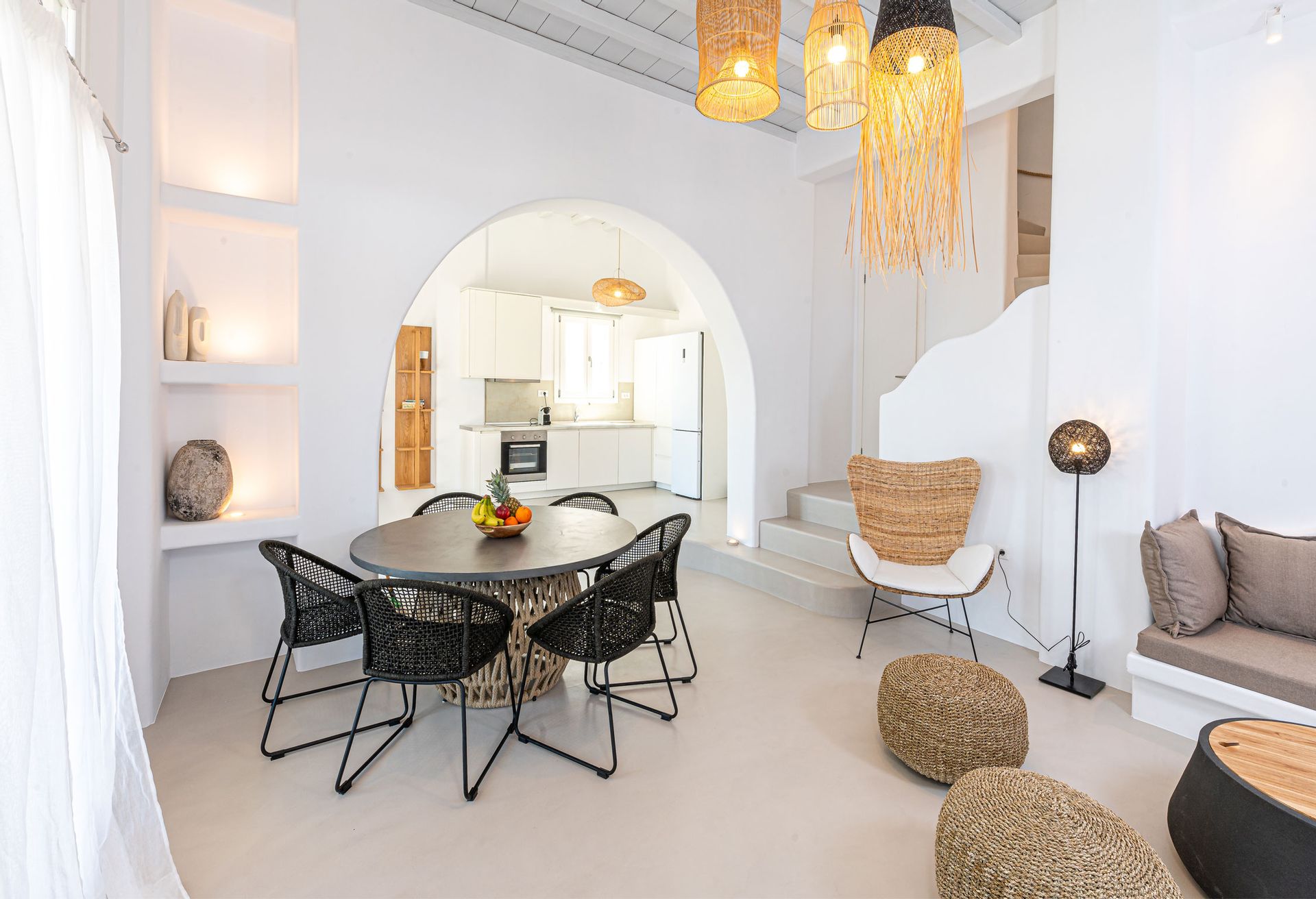 Latters are surrounded by a spacious sun deck setting which includes a large outdoor and pergola shaded lounge area equipped with comfortable sofas with cushions sun beds deck chairs paired with a large dining table which predisposes guests to enjoy a delicious meal or cocktail while watching the majestic sunrise, listening to the sounds of the sea and overlooking Mykonos's Little Venice.