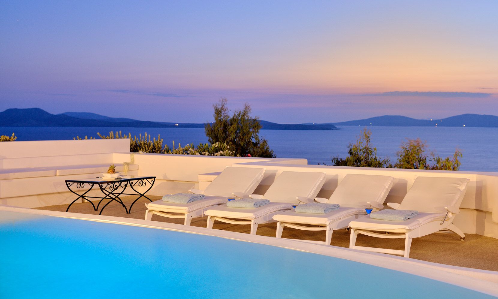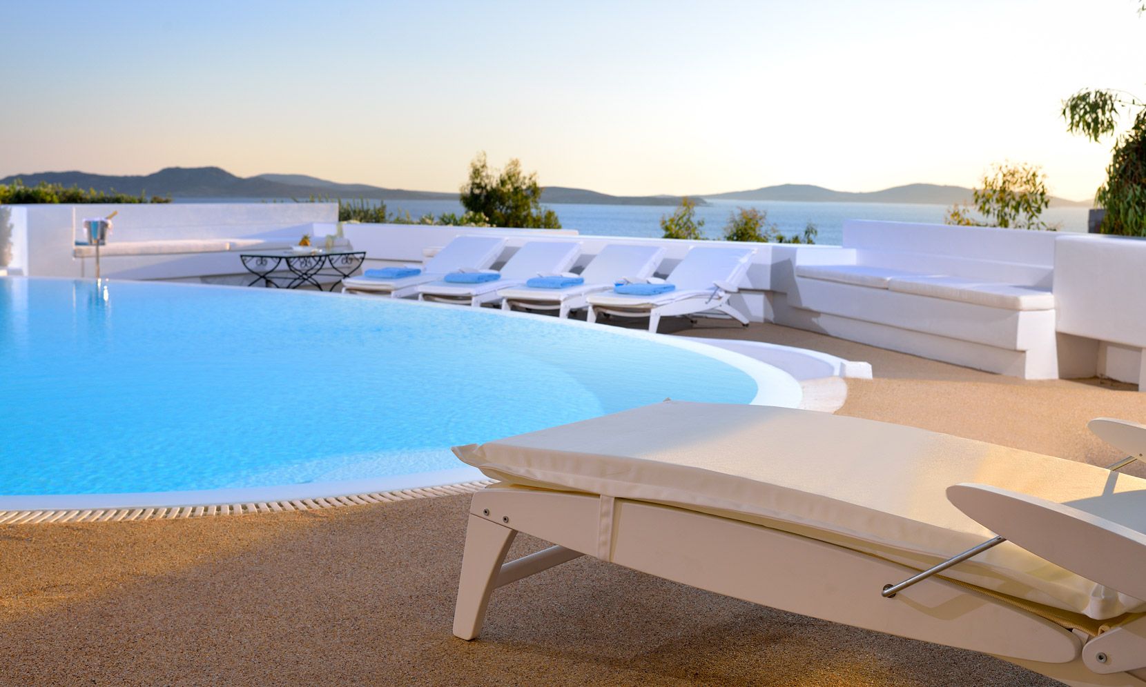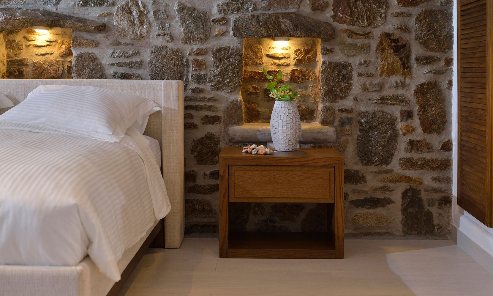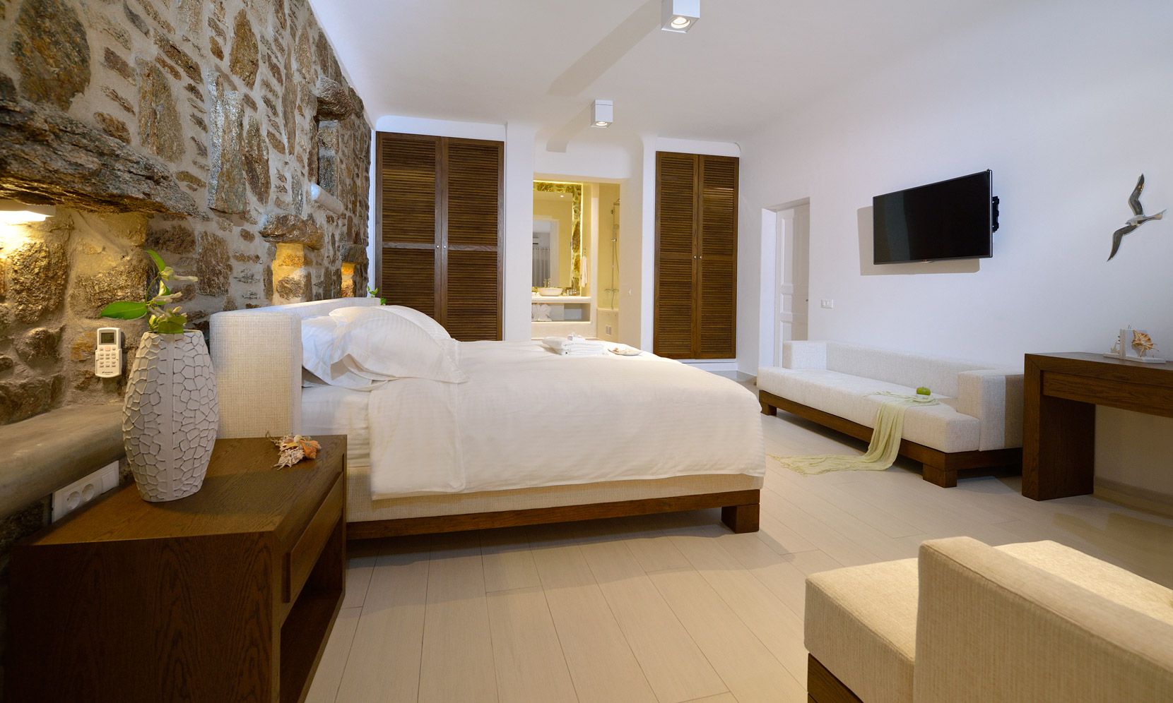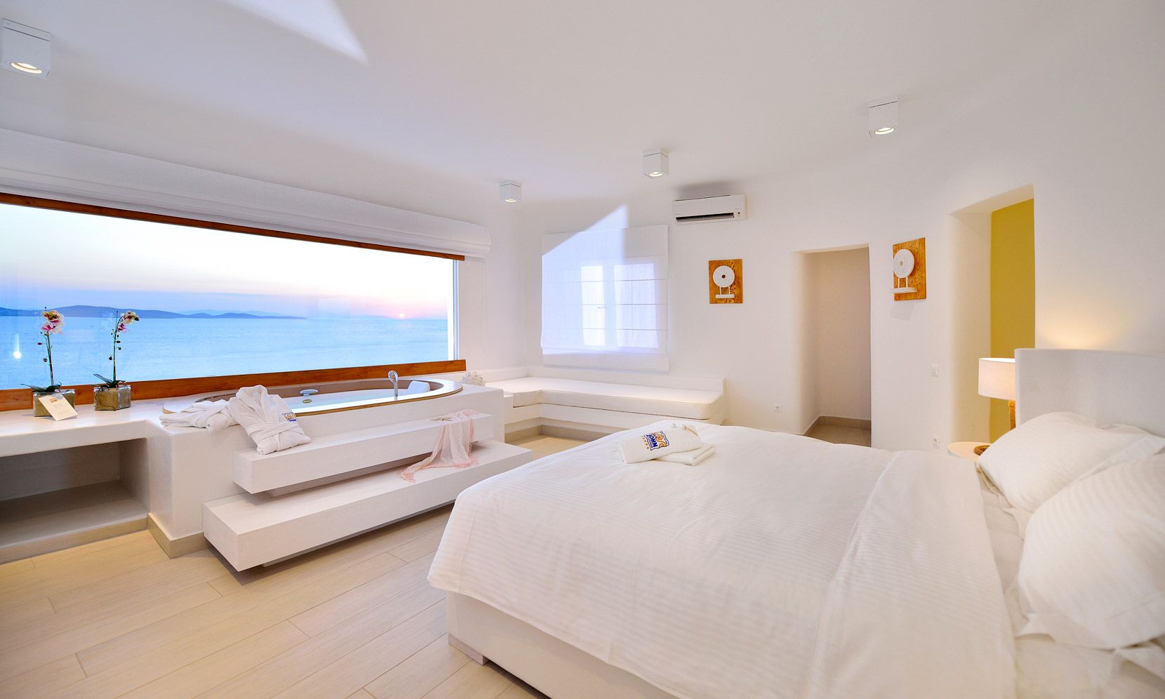 The villa opens to a private, spacious patio area, set up with a swimming pool of clear turquoise waters and sun-loungers, and a barbeque spot, overlooking the expanse of the blue Aegean sea, all the way to Delos island that is gracefully silhouetted against the horizon.