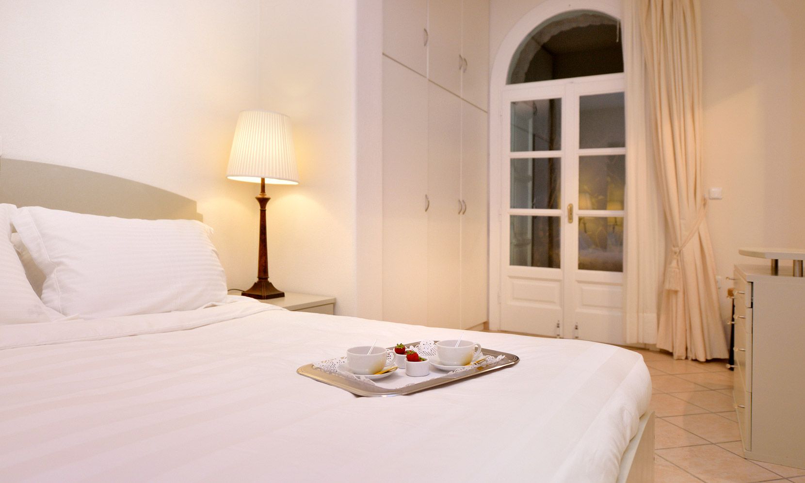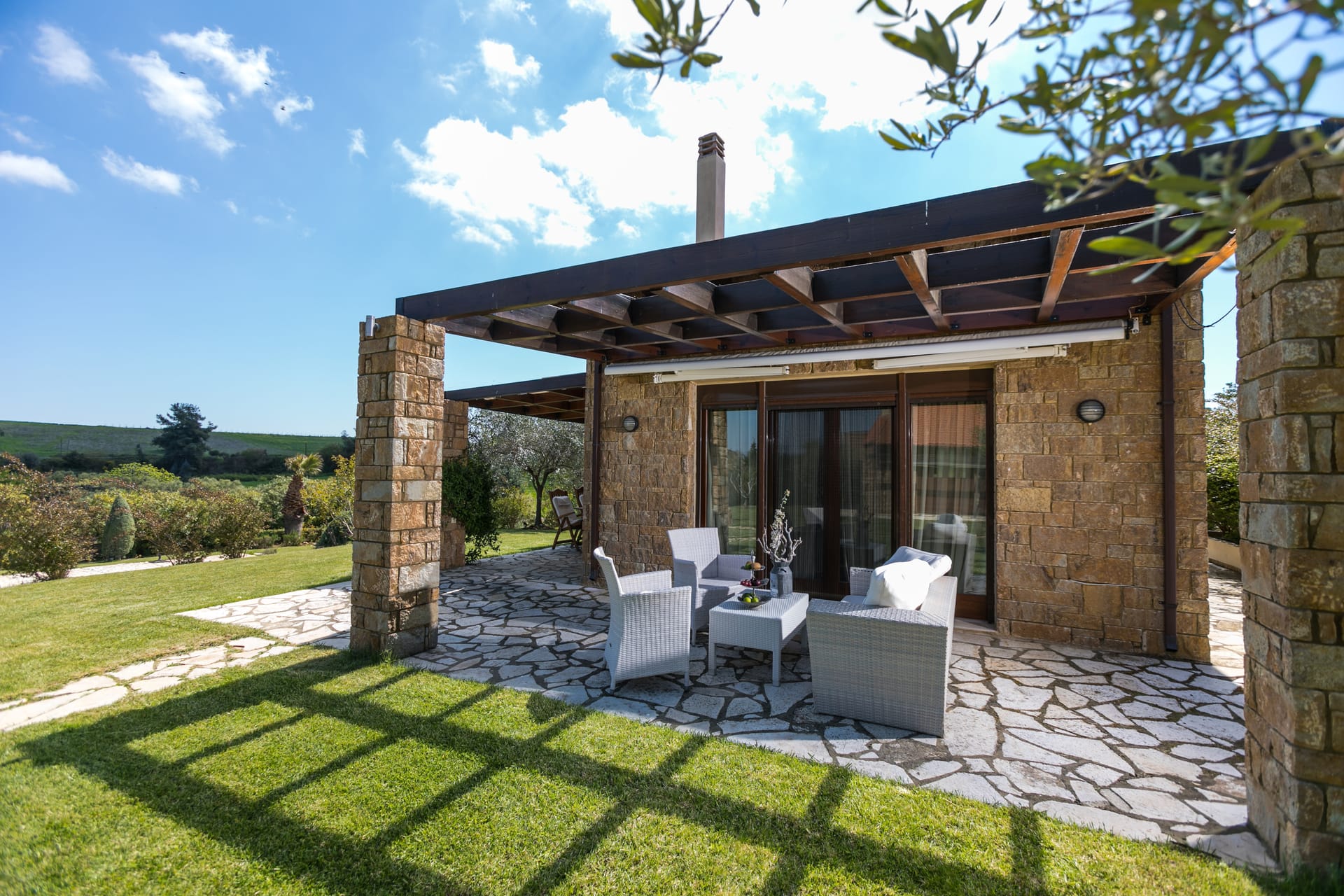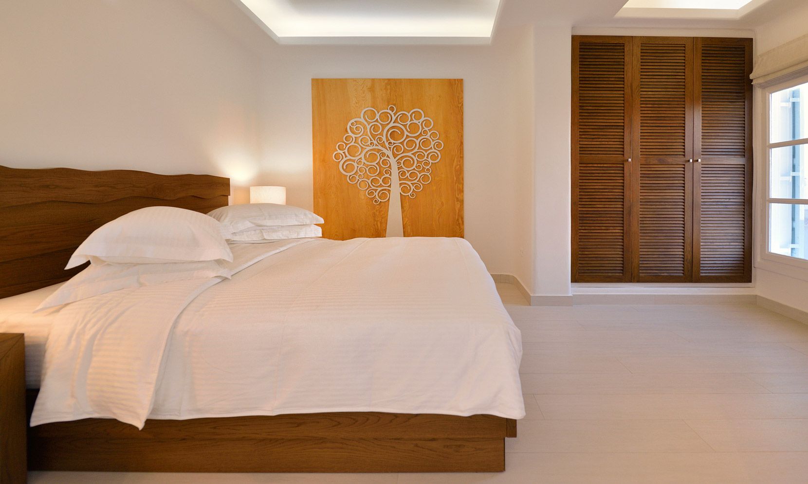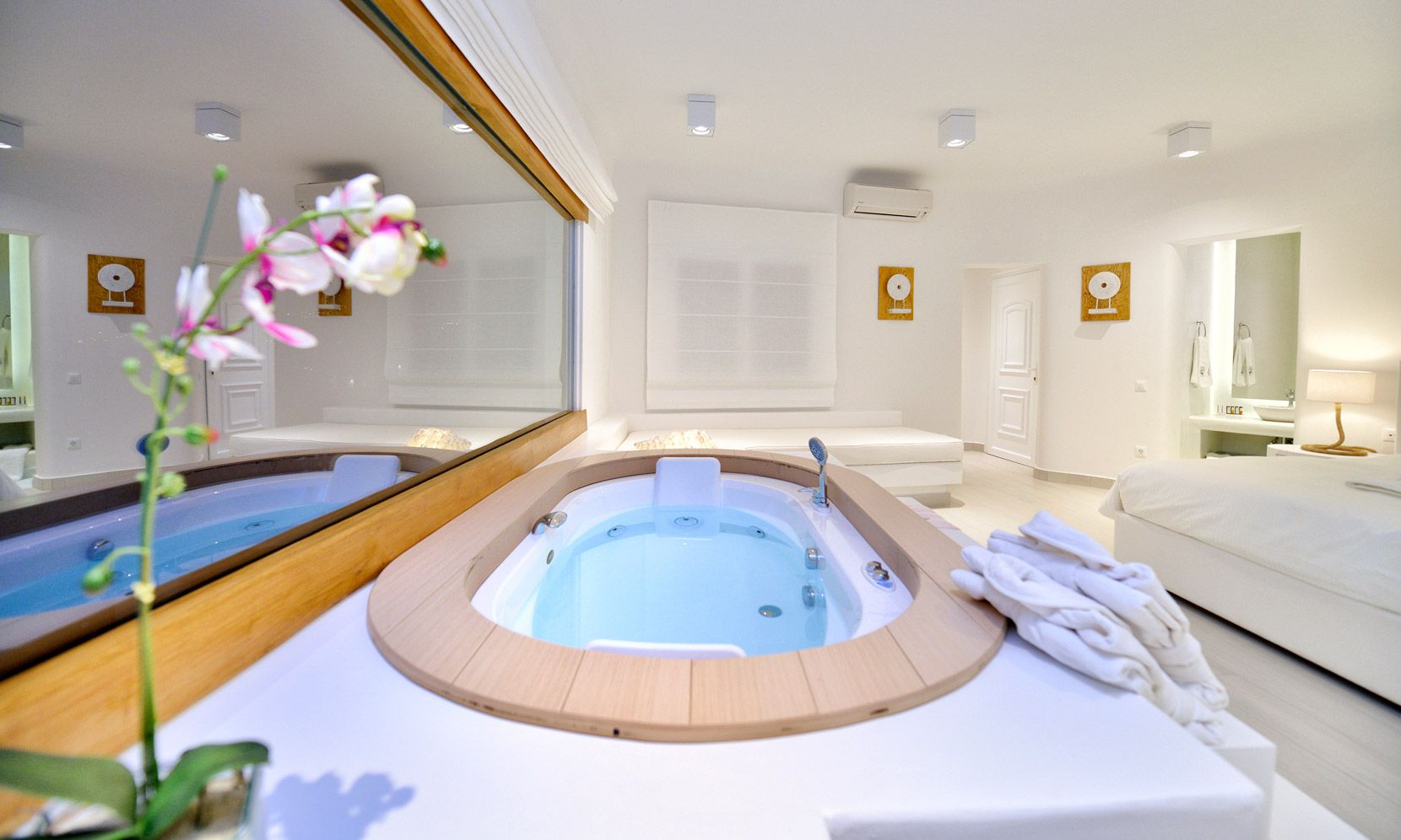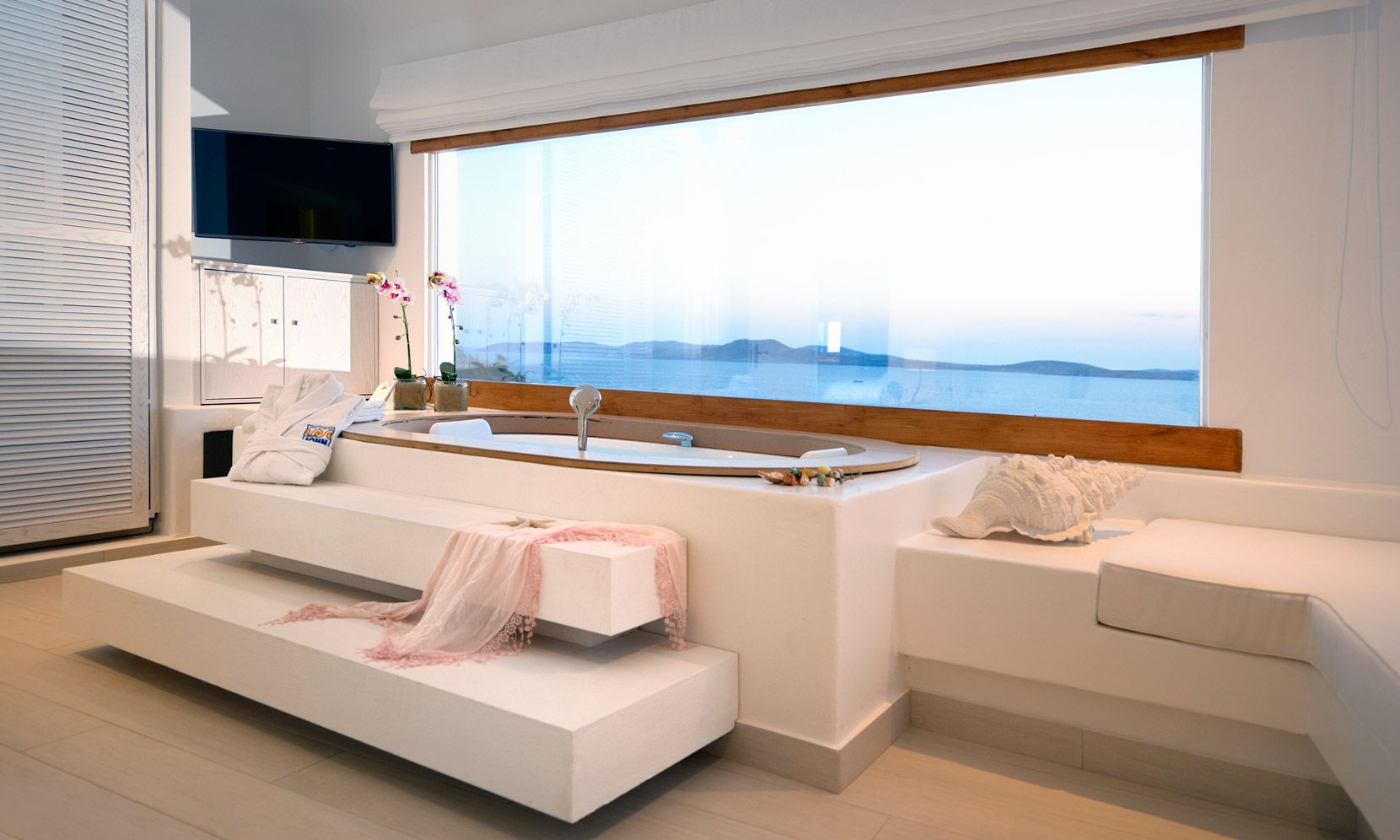 The villa opens to a private, spacious patio area, set up with a swimming pool of clear turquoise waters and sun-loungers, and a barbeque spot, overlooking the expanse of the blue Aegean sea, all the way to Delos island that is gracefully silhouetted against the horizon.