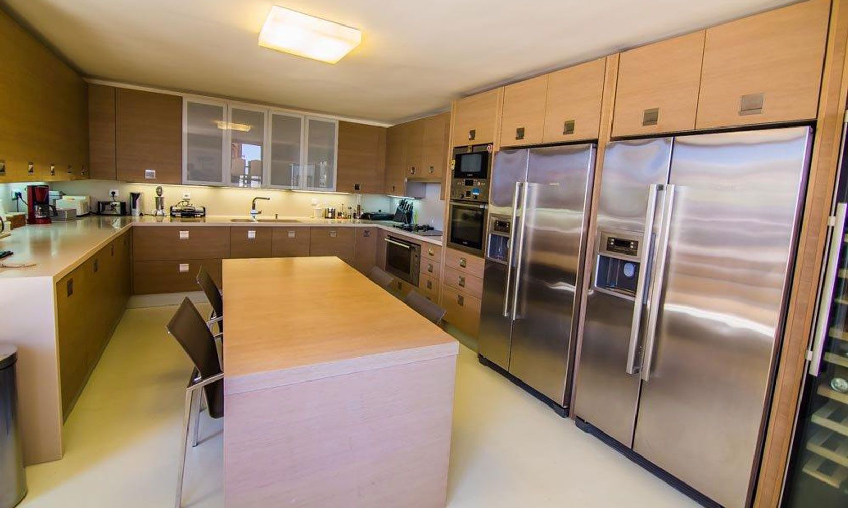 The ground floor has an entrance hall, two living rooms with a fireplace, a dining room, an Italian made kitchen with three freezers, two ovens, one microwave oven, a vitroceram and a dishwasher, three bedrooms, three bathrooms, a lift and two outside verandas with a swimming pool, two dining places, a bar, a bbq, an outside oven, a bathroom, a parking place, a playroom and three pergolas.