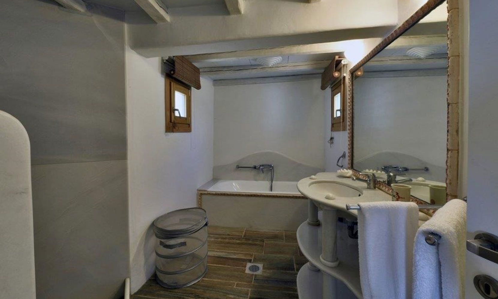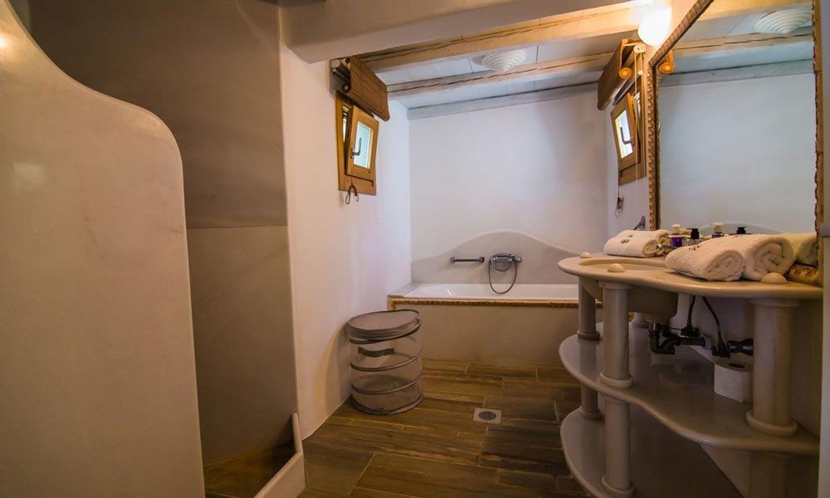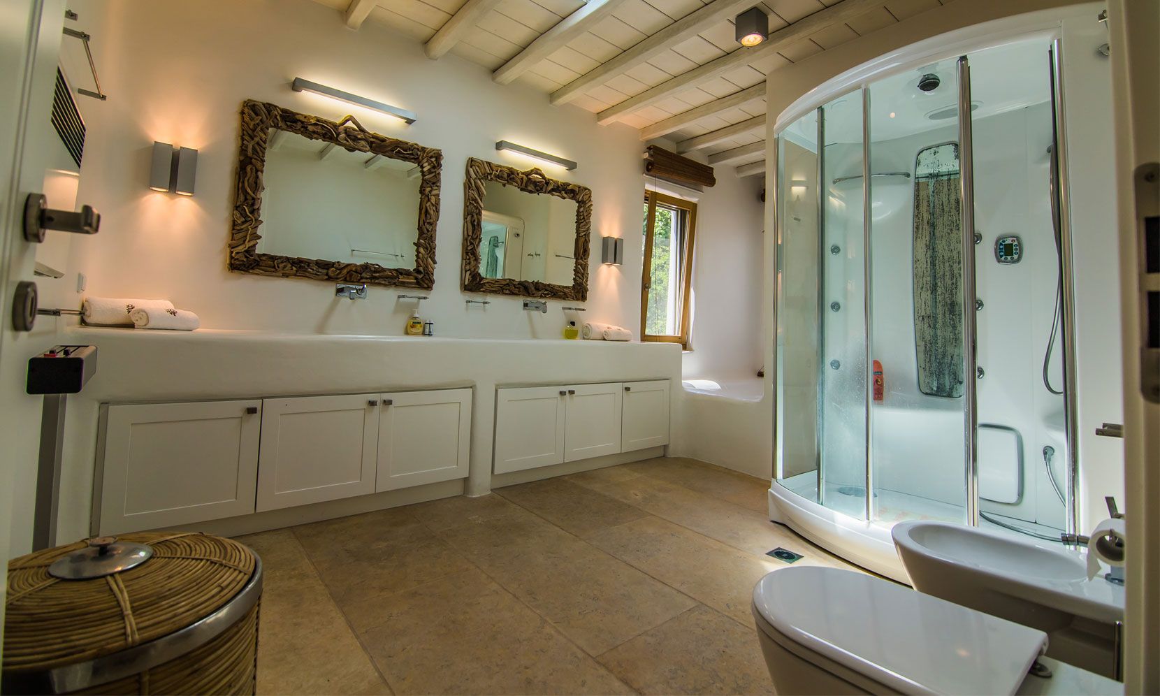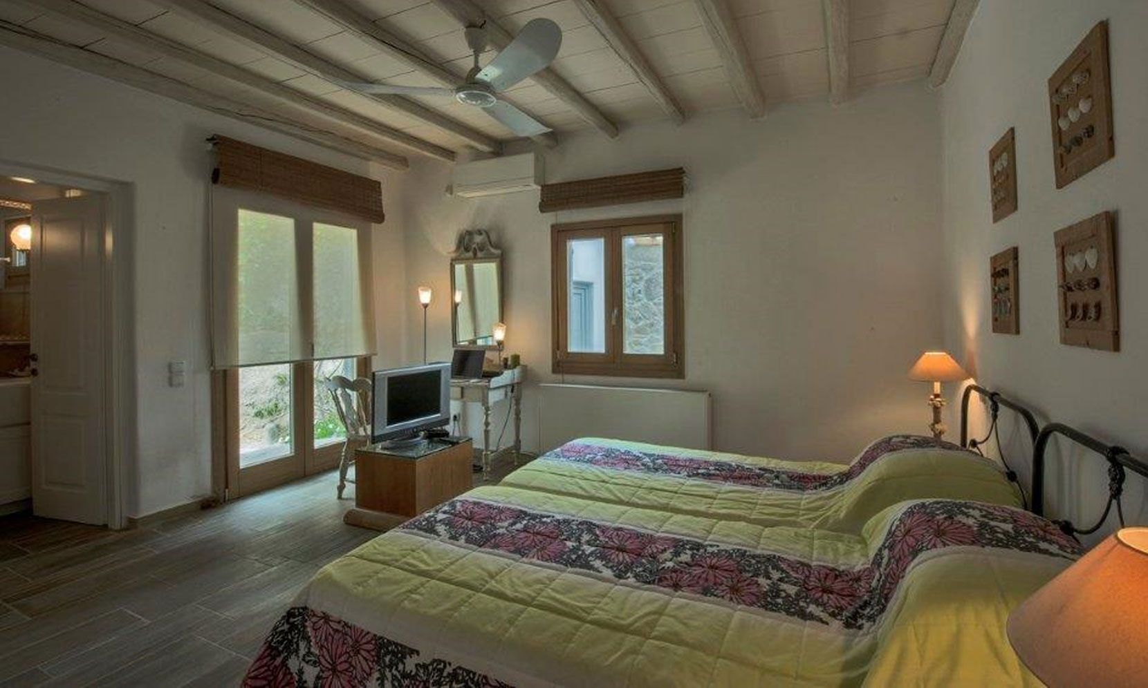 Near the entrance of the villa, in a lower level, there is a guestroom with a bathroom.
