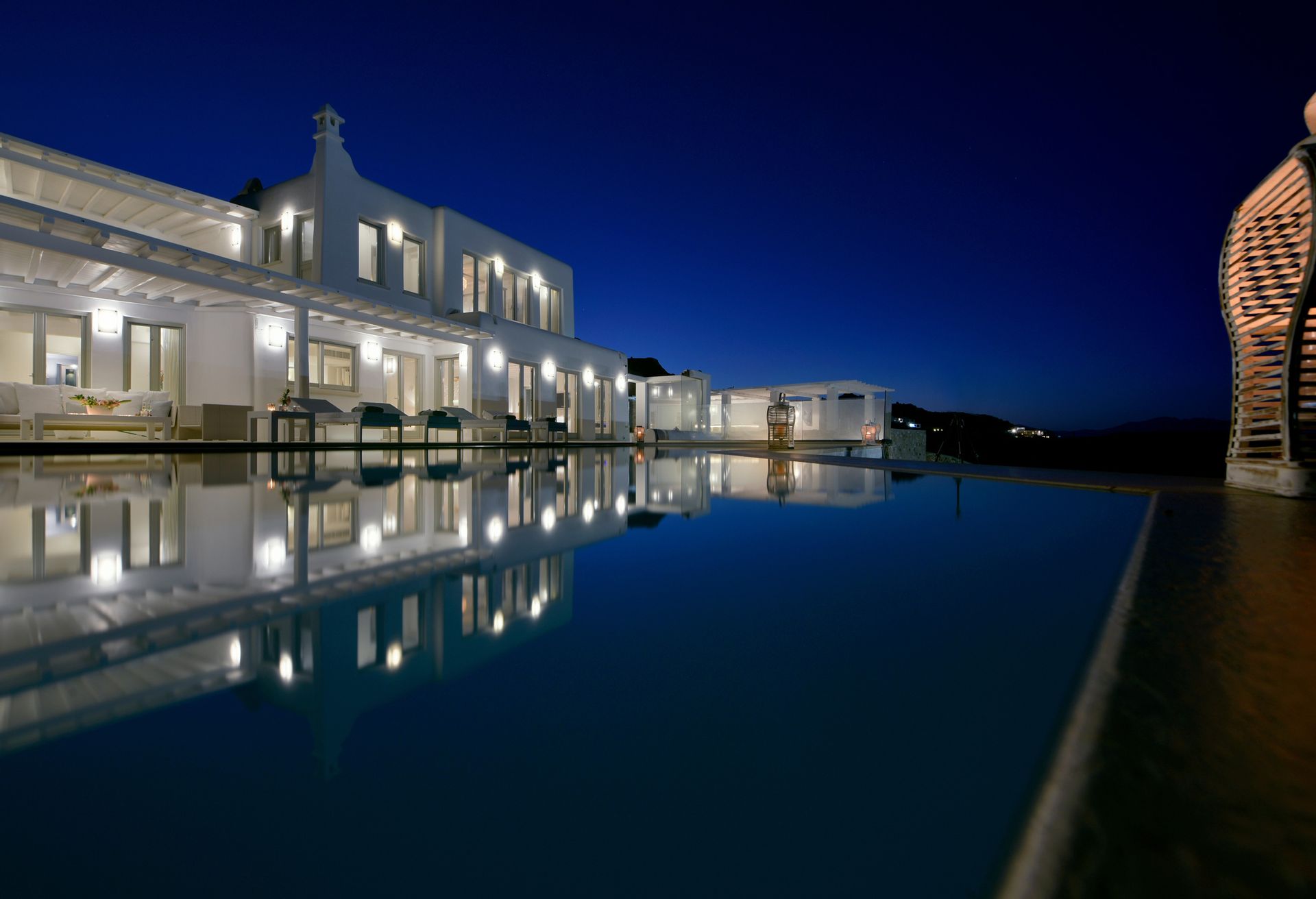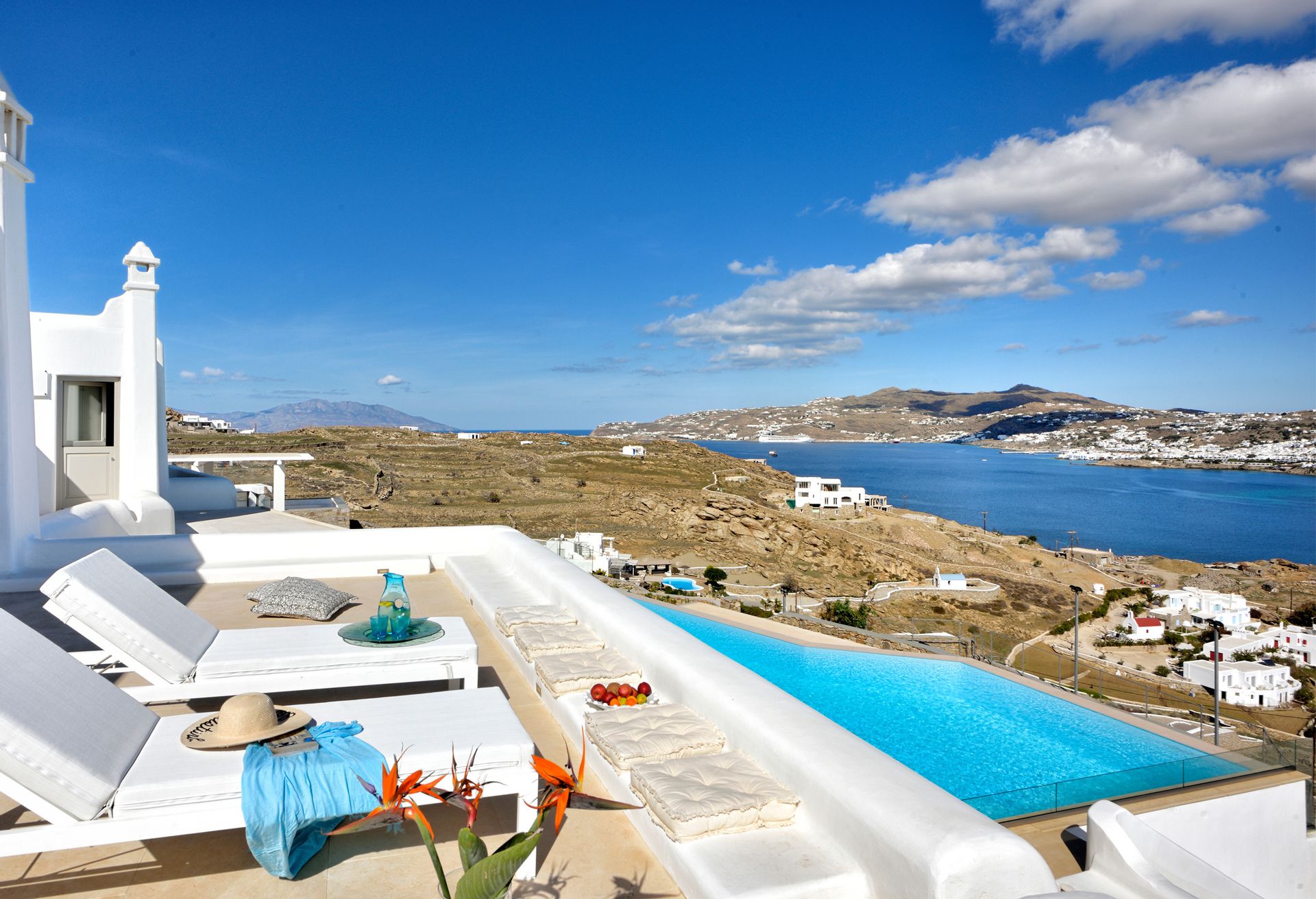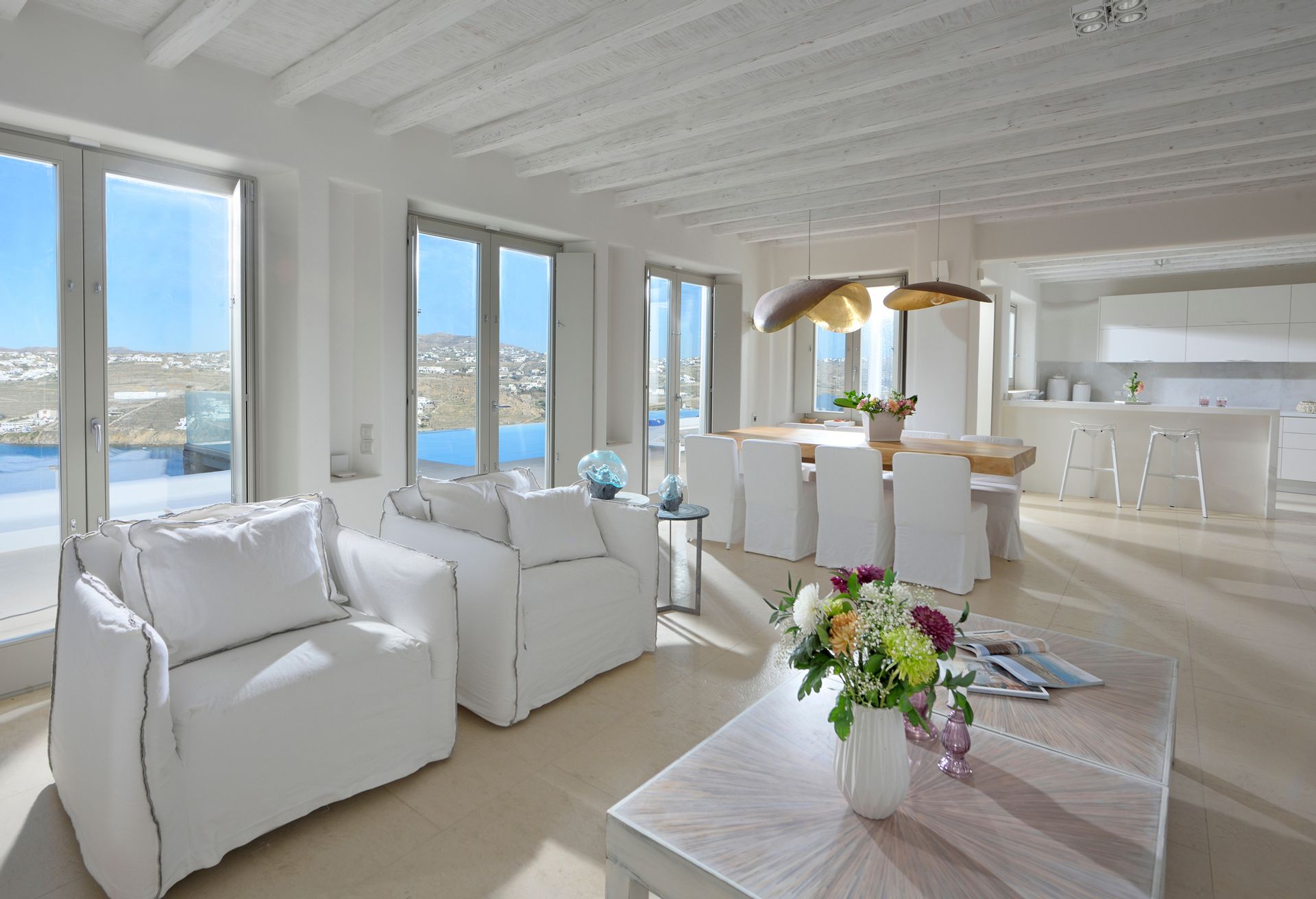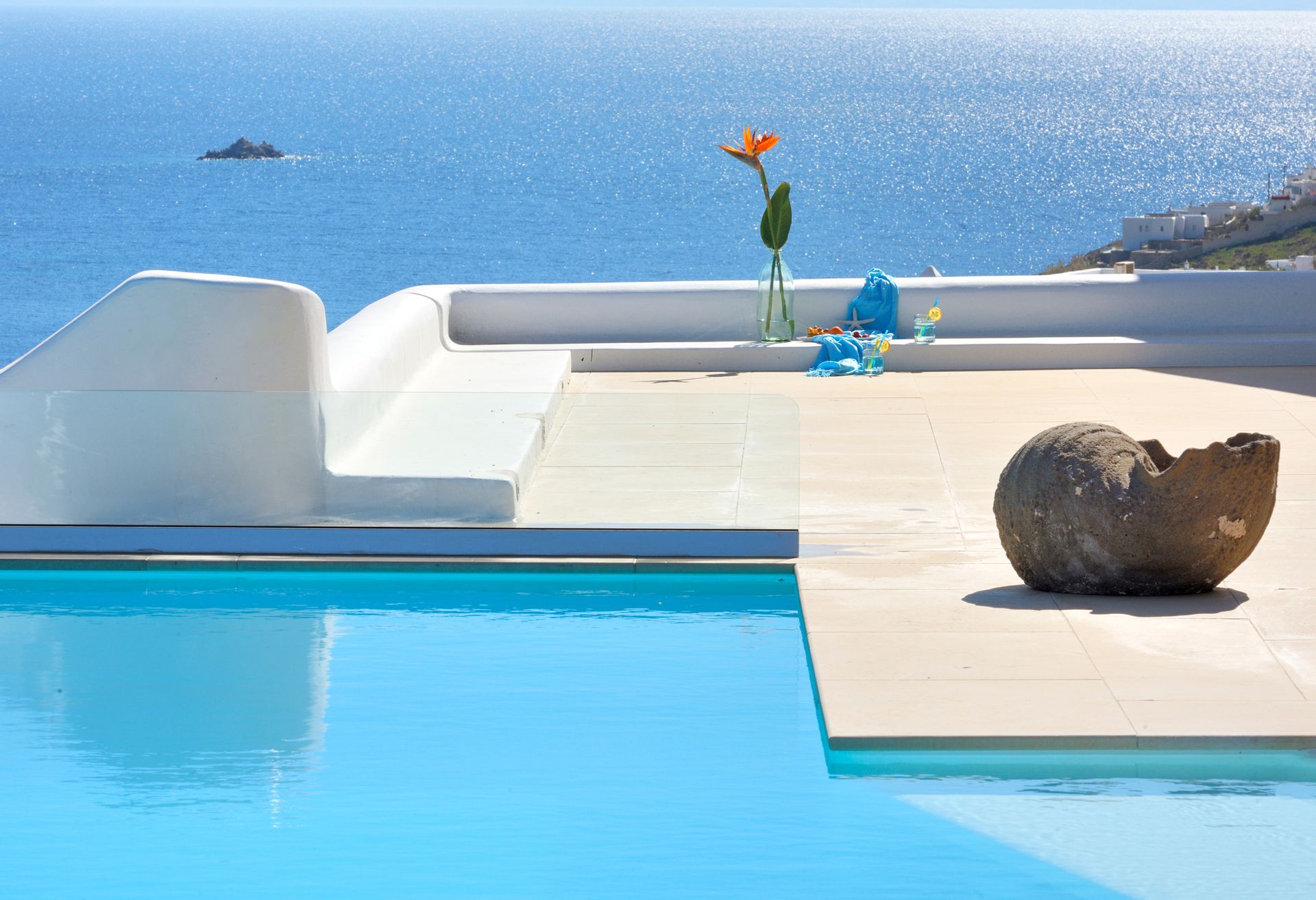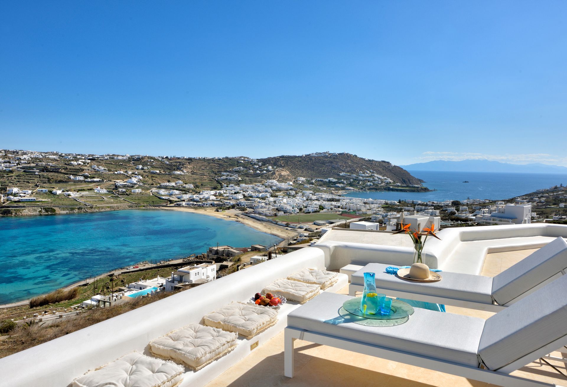 Villa Blance is a brand new property nested in the hills above Ornos Bay. The elevated position grants both great views over the Aegean sea and Mykonos Town with great level of privacy, both of which can be enjoyed from the various outdoor spaces.