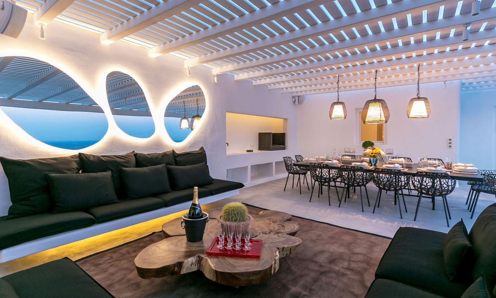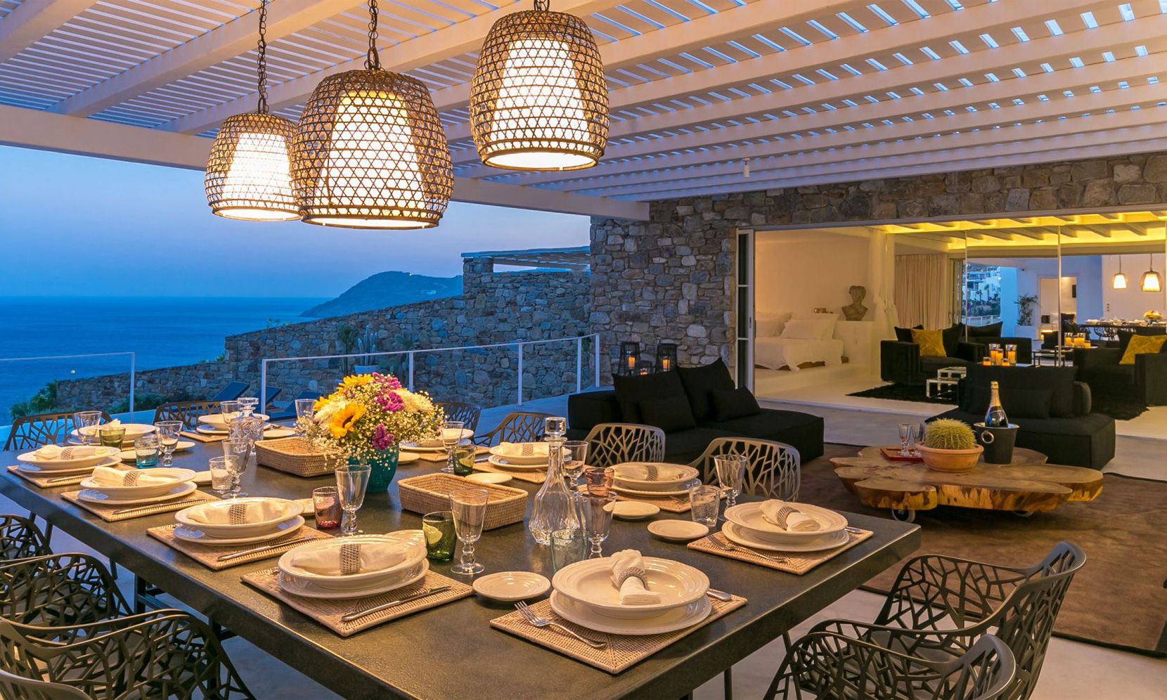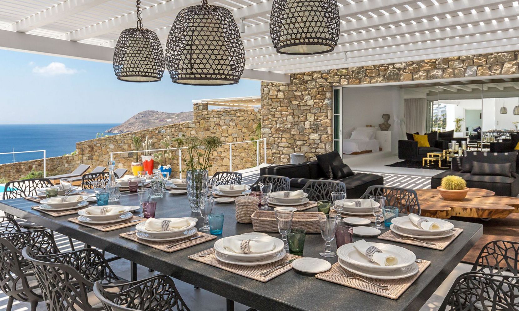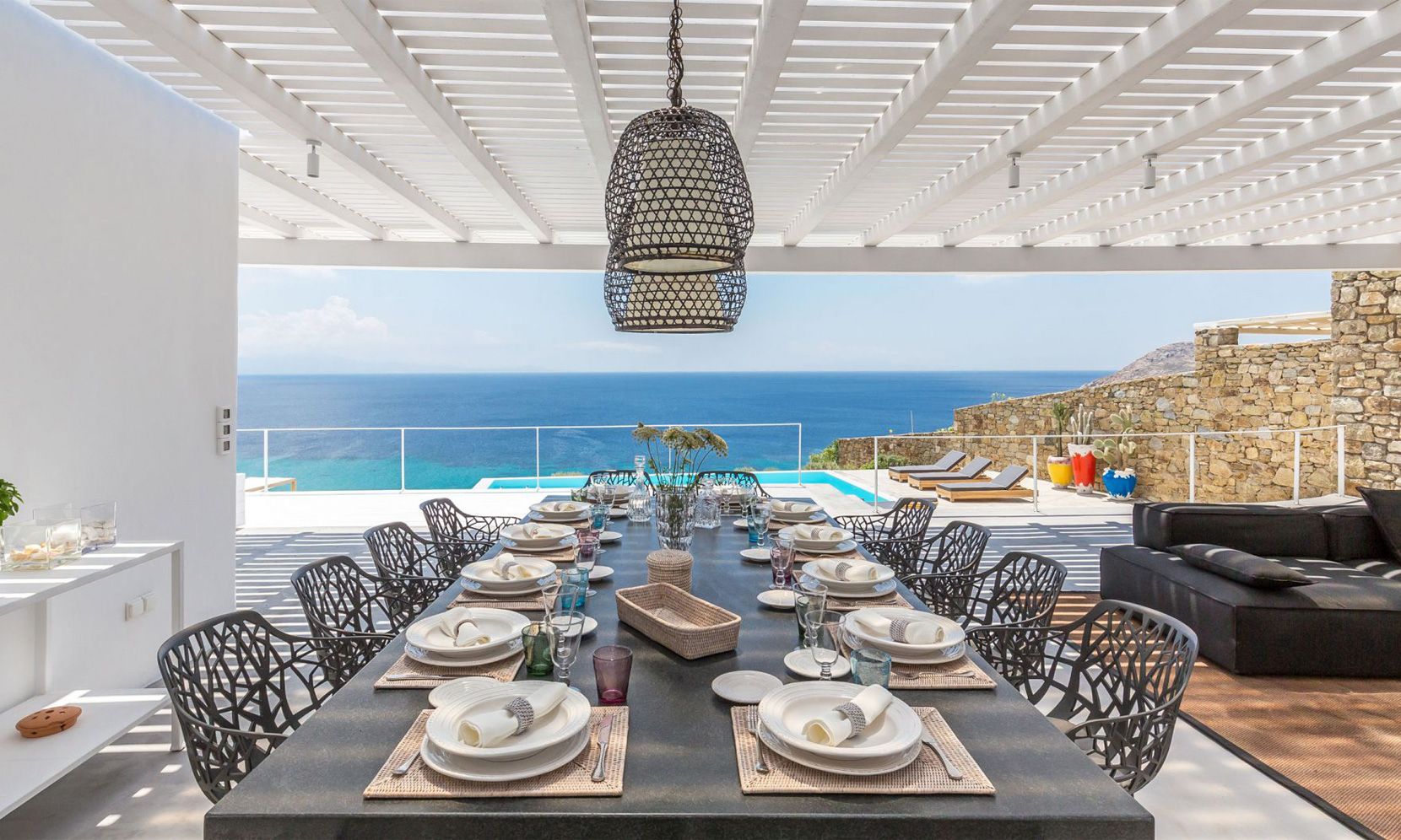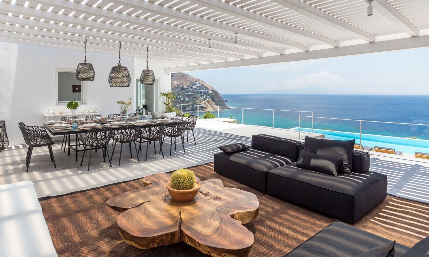 The location allows for extensive views of the bay and sunshine throughout the day, while being within a short drive from the beach, the perfect distance to either join in on the “fun in the sun” or relax around the property’s private pool. The aforementioned infinity pool catalyzes the outdoor spaces and is placed in the most panoramic part of the terrace. It can be reached both from the front terrace – which is aptly furnished for al fresco dining under a charming pergola – and from the lower level of the property where most of the bedrooms are situated.