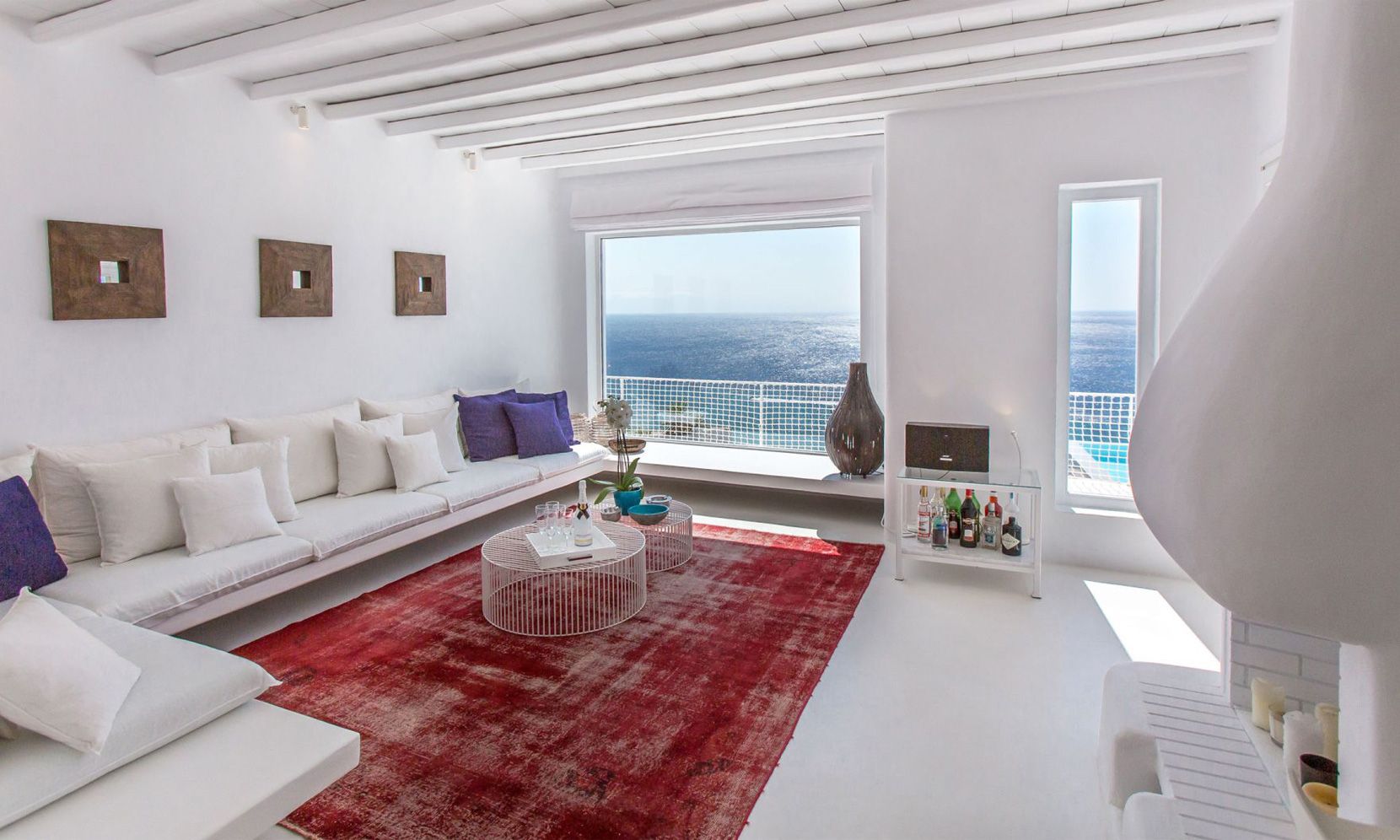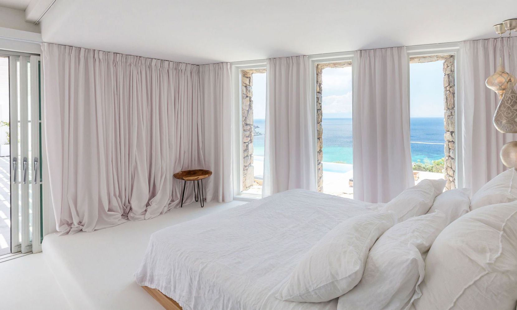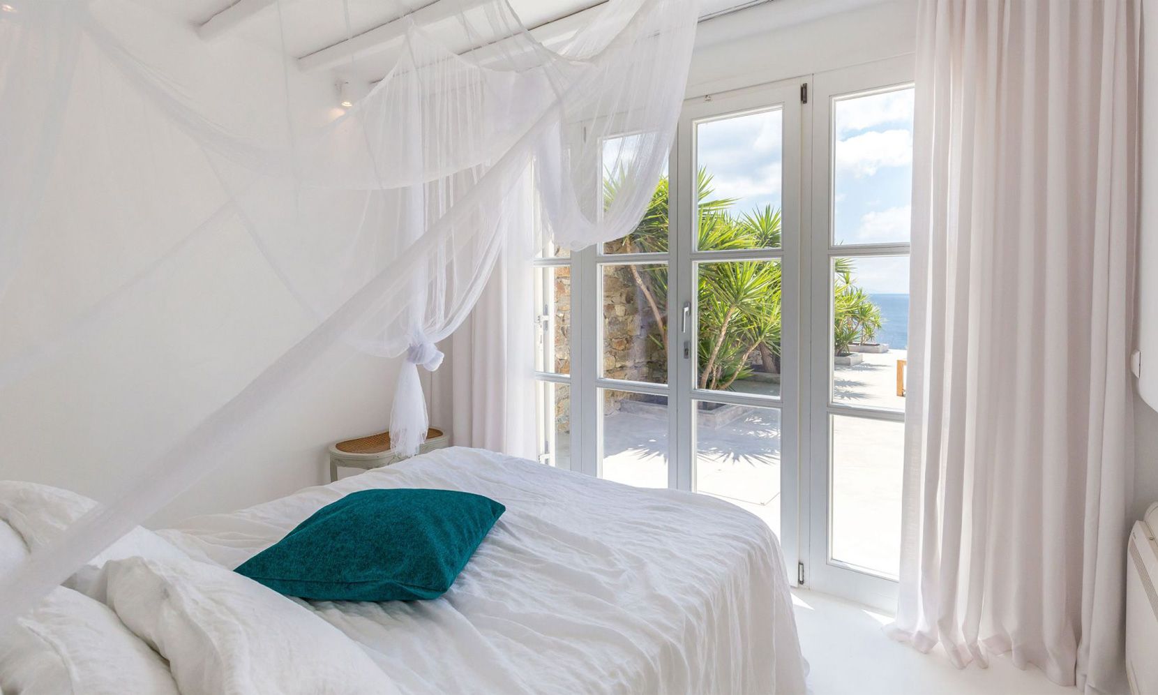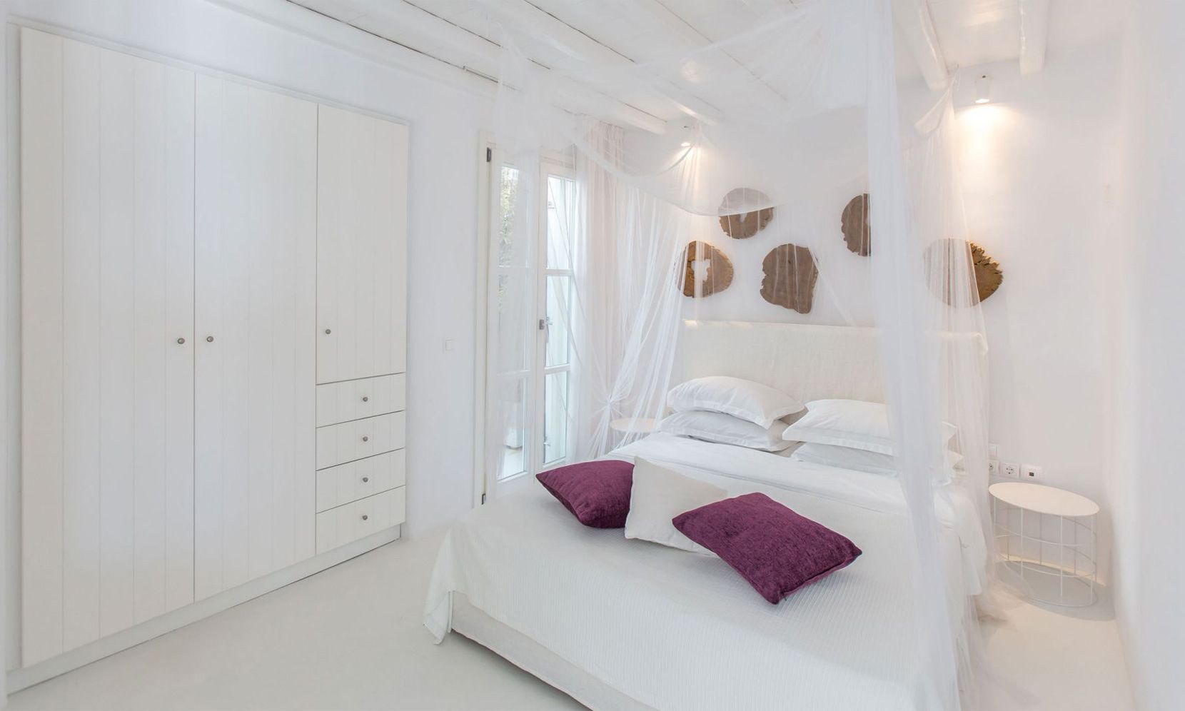 The same theme is found in the property’s bedrooms, some of which might not have the same view as the others but are all appointed in a stylish manner to assure a chic ambience to all. Brigitte is a great property to get away from the more busy areas of Mykonos during the crowded summers and cherish moments of relaxation in a refined atmosphere or delve in the beach life of Elia just close by.