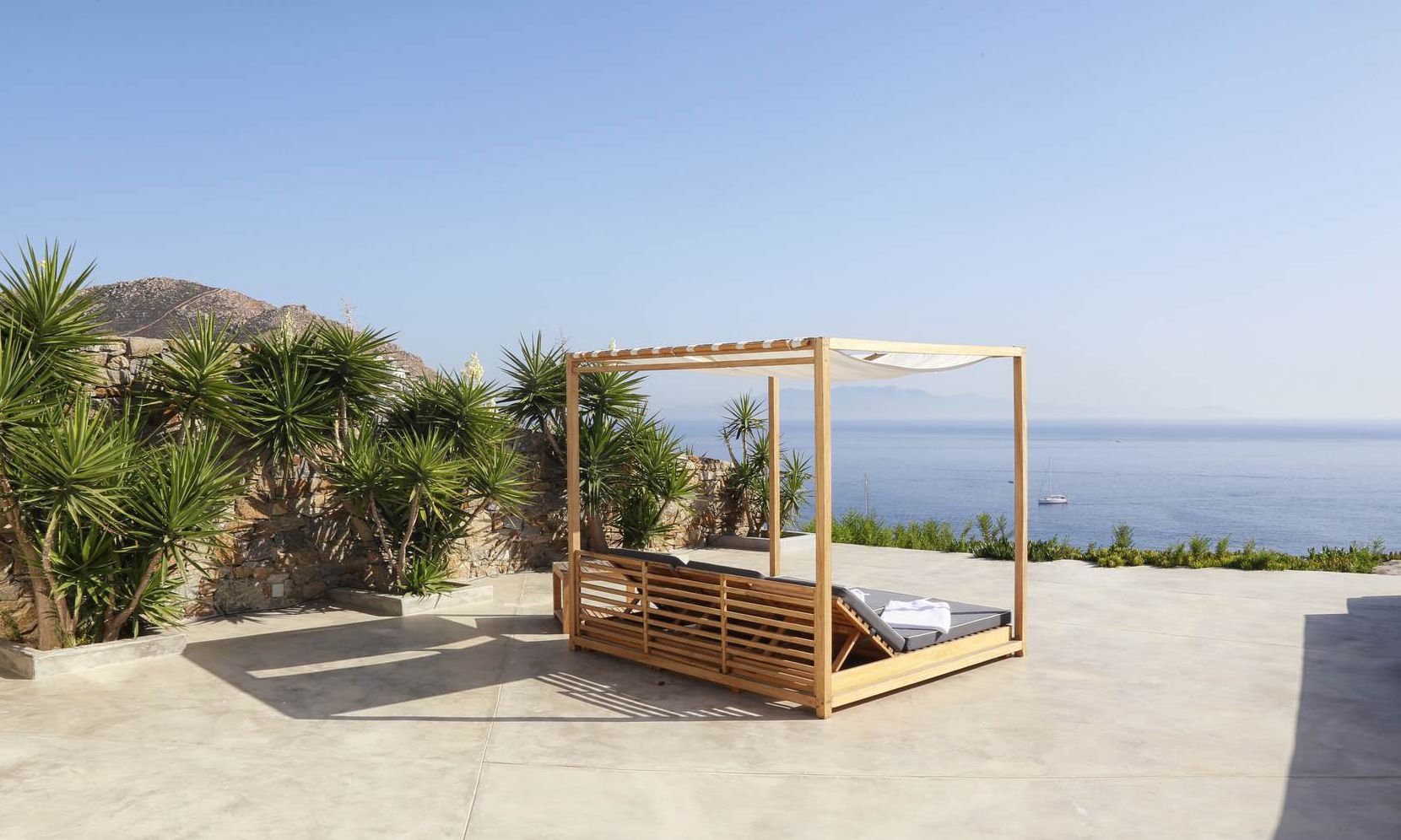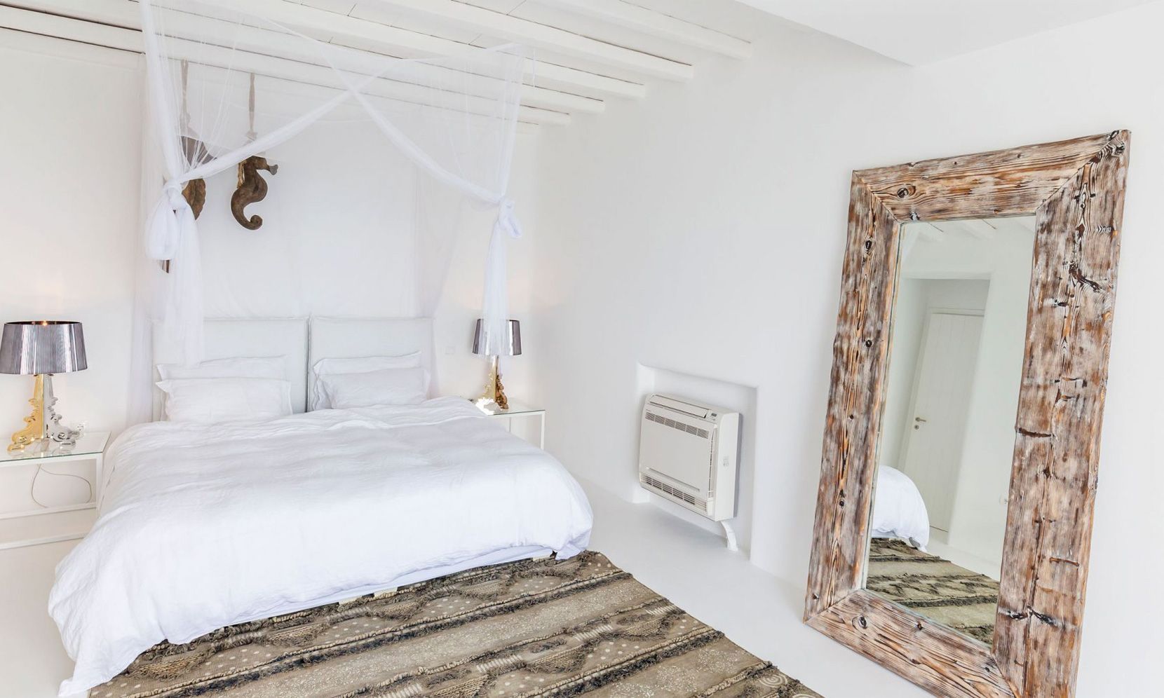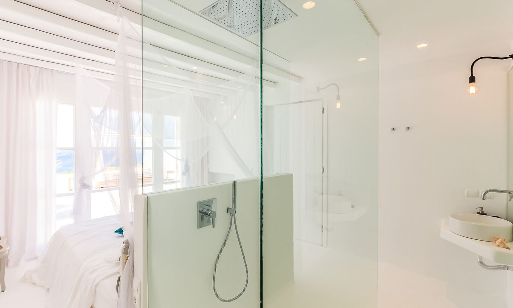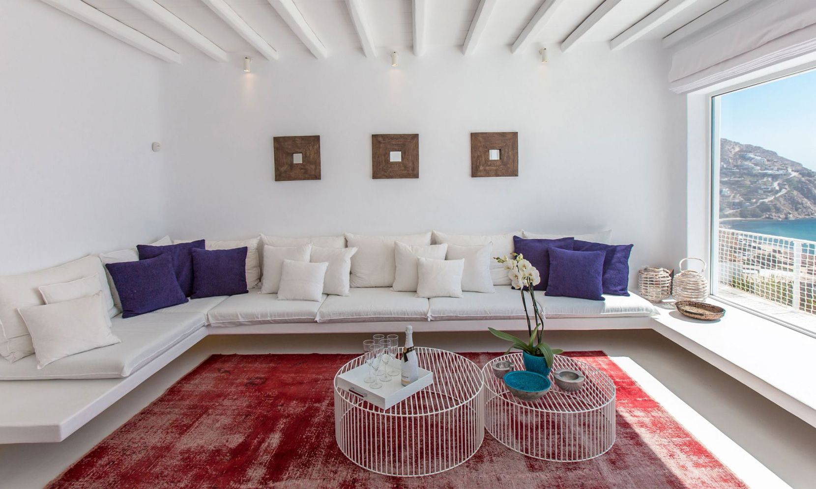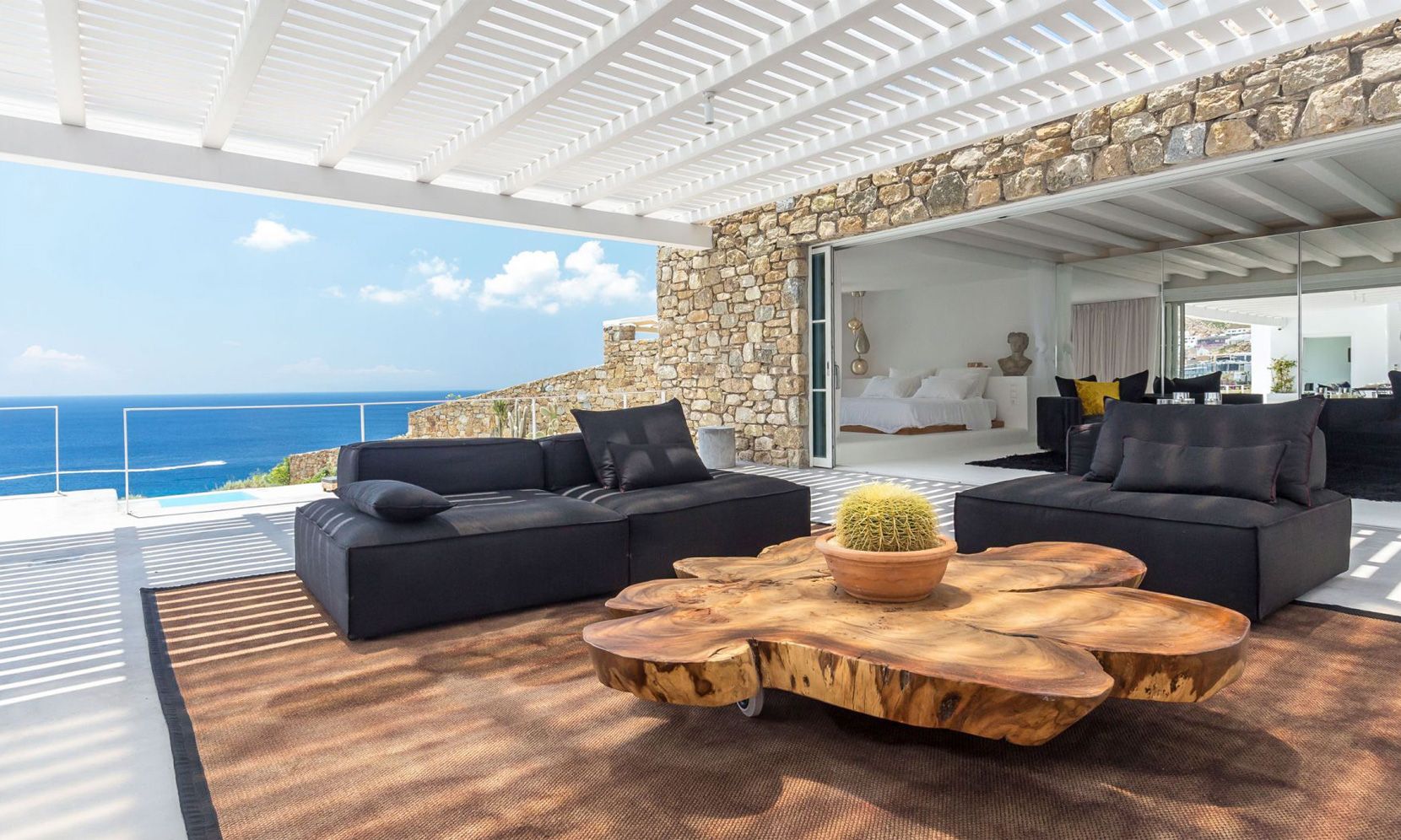 The same theme is found in the property’s bedrooms, some of which might not have the same view as the others but are all appointed in a stylish manner to assure a chic ambience to all. Brigitte is a great property to get away from the more busy areas of Mykonos during the crowded summers and cherish moments of relaxation in a refined atmosphere or delve in the beach life of Elia just close by.