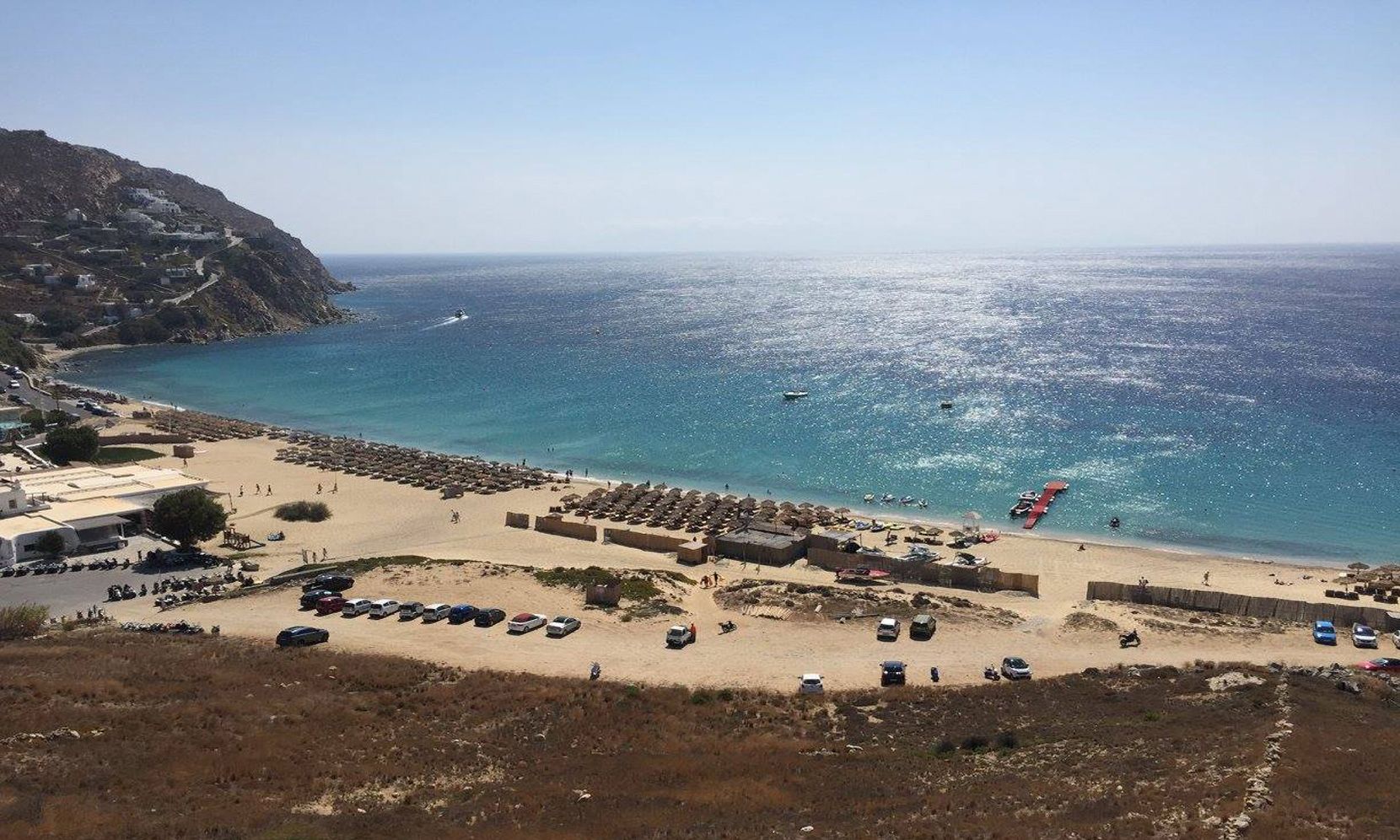 Mykonos Villa Brigitte is located atop the hill just to the back of Elia Beach, part of a brand new development of private properties overlooking the fine sand and clear waters of this famous beach on the southeastern side of Mykonos.