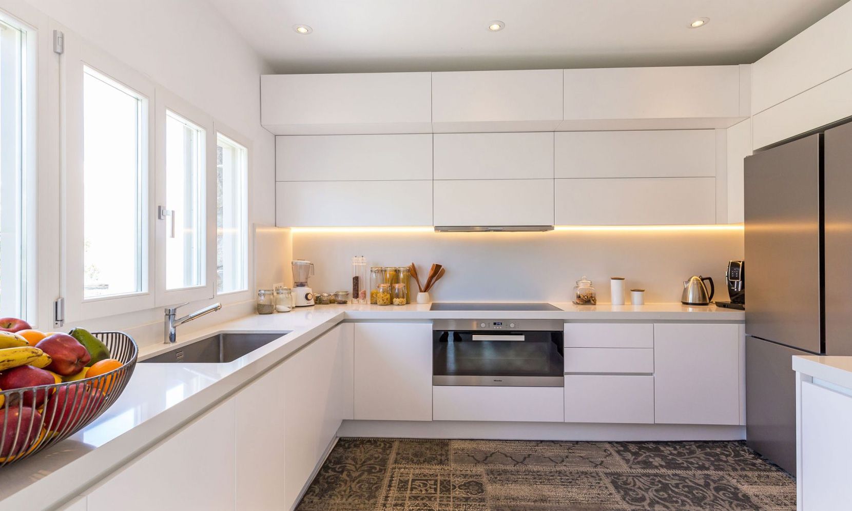 Stylish furniture is thoughtfully placed throughout while a small, lush garden blooms in the area just below. A great sense of style pervades the interiors of Villa Brigitte as well. Pure white surfaces dominate all spaces solely interrupted by colorful fittings. A perfect example would be the two living rooms, one per level, each boasting multicolored sitting areas with throw pillows and elegant coffee tables.