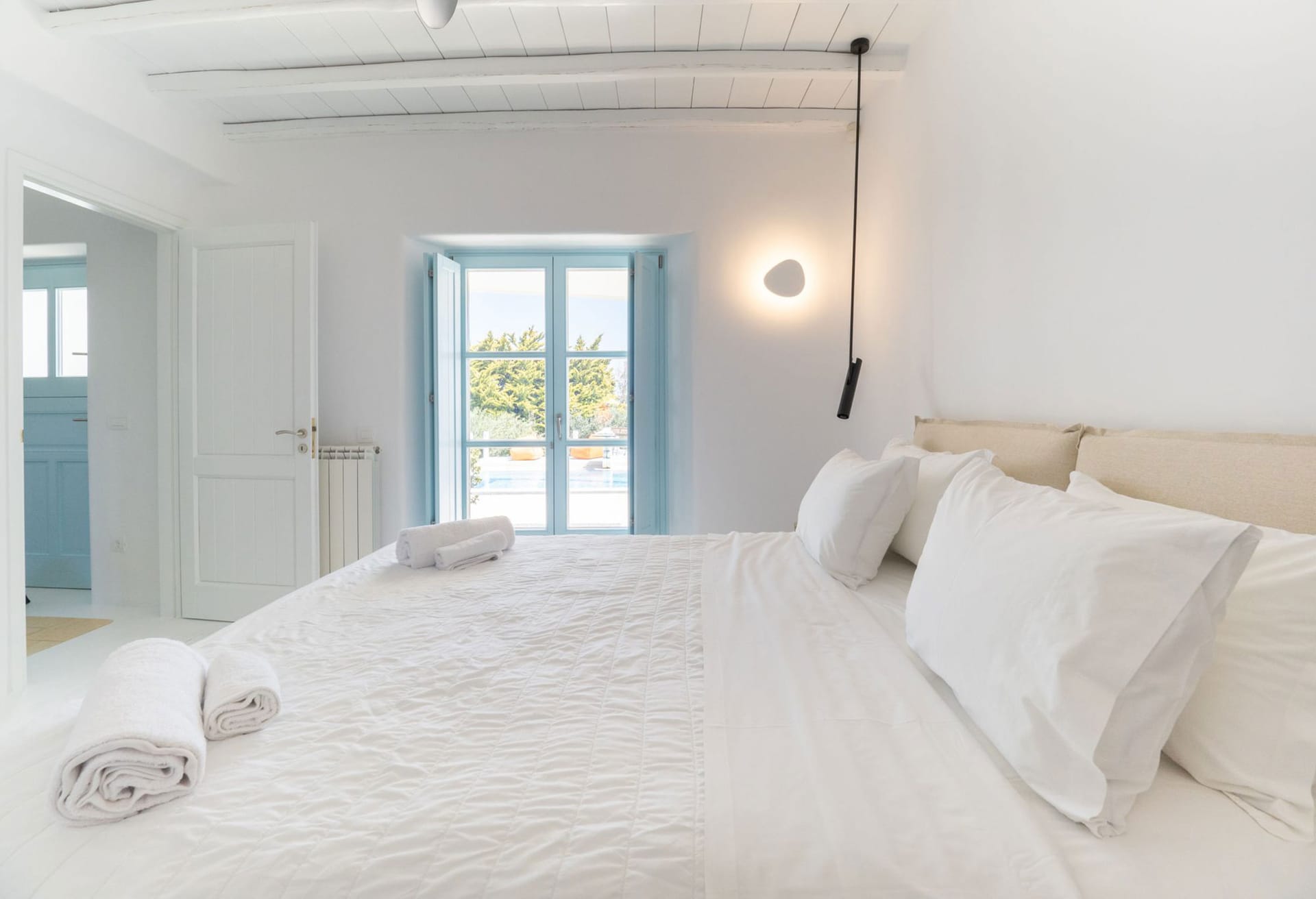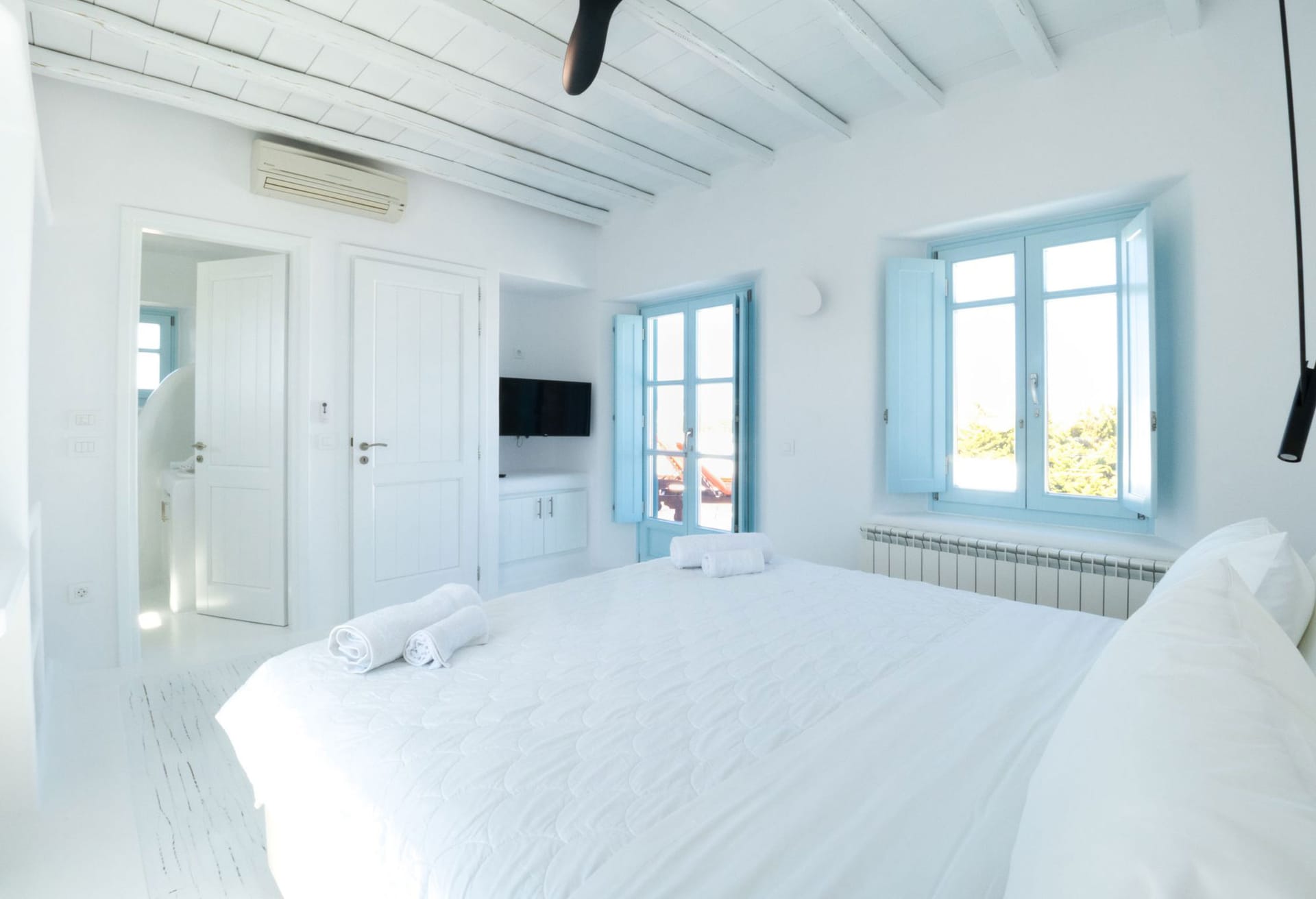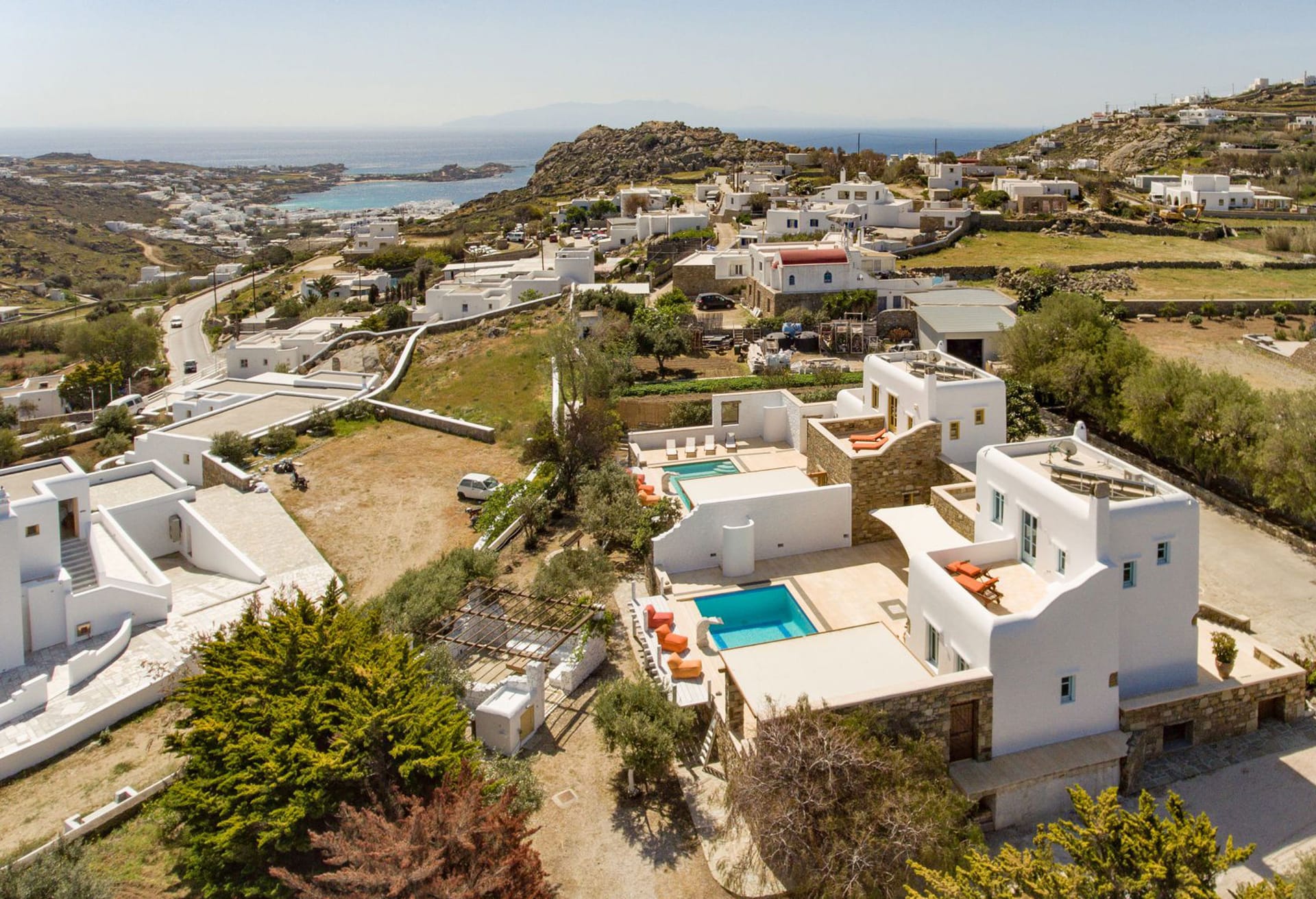 The position makes the house unbeatable. They are located between Mykonos center and the famous Psarou beach. Platys gialos beach and ornos beach were you can find water sport activities are 5 minutes away by car. Furthermore the house is only 4 minutes far from Mykonos town. Also, from there you can approach any other beach like Scorpios and Nammos very quickly (5-7min by car). Generally, you can reach any place in only a few minutes. Bus stop, supermarket , greek tavernas are around the area just 5 mins walking distance.