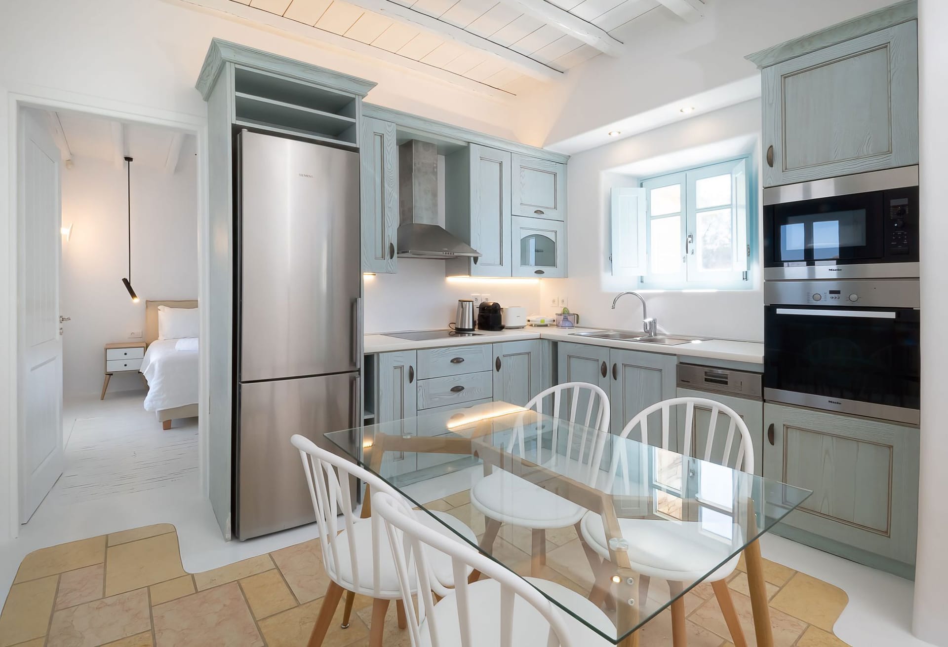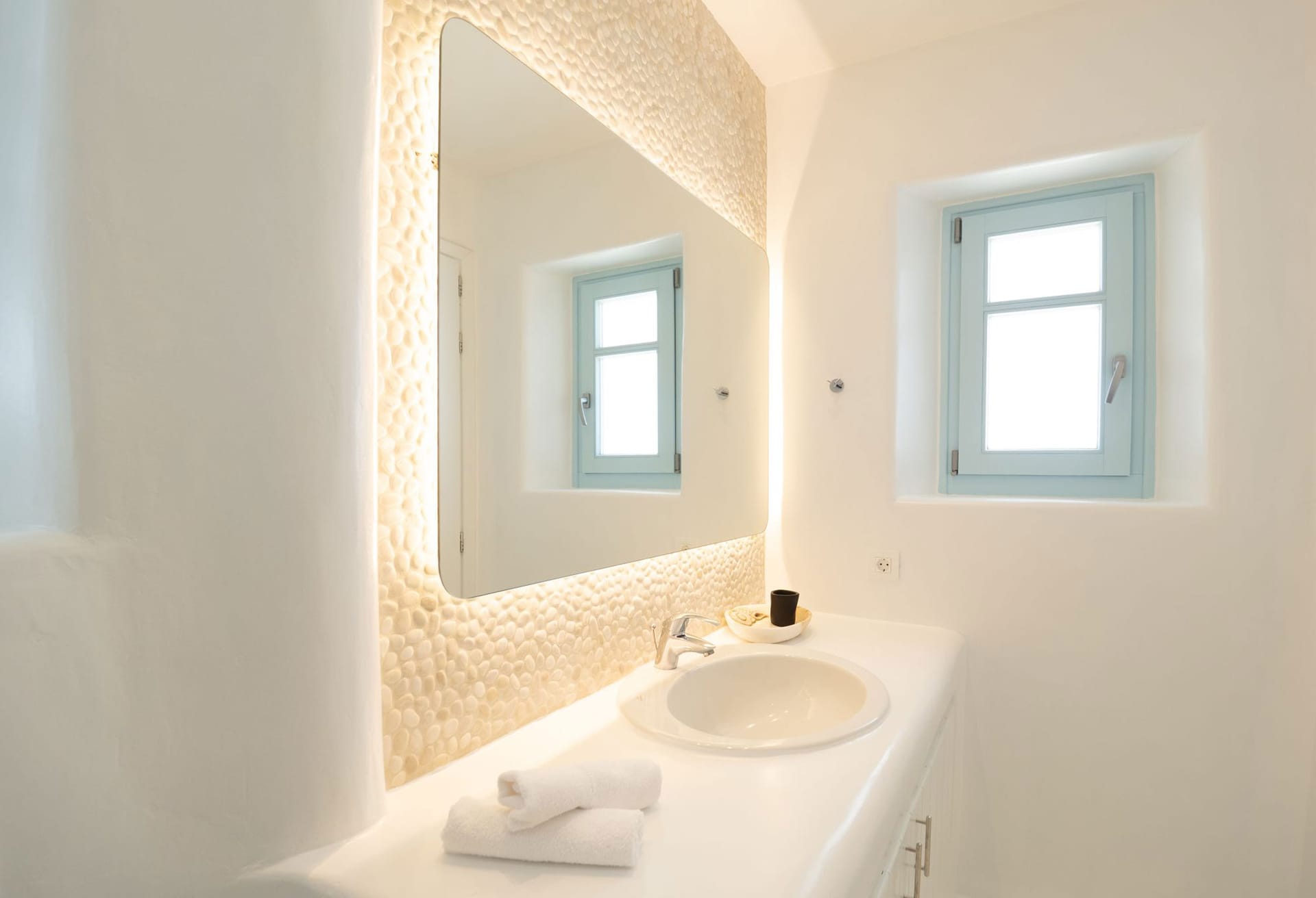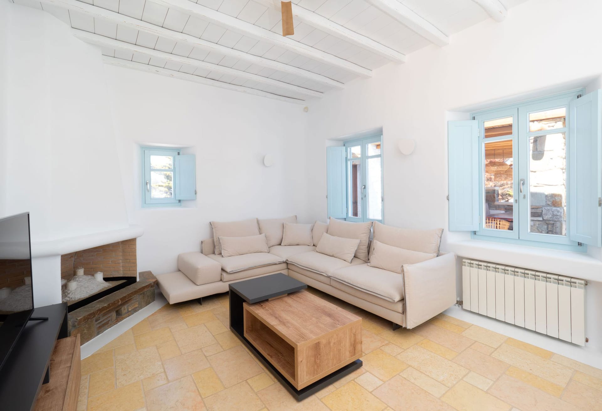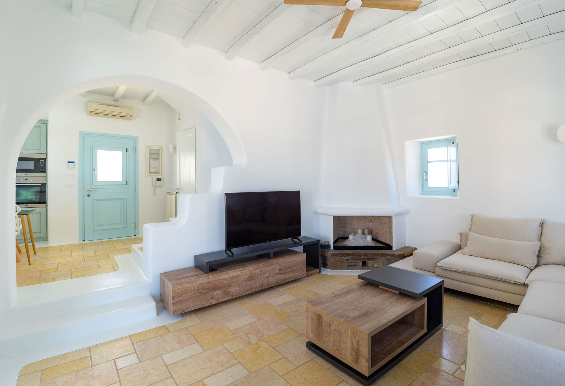 The position makes the house unbeatable. They are located between Mykonos center and the famous Psarou beach. Platys gialos beach and ornos beach were you can find water sport activities are 5 minutes away by car. Furthermore the house is only 4 minutes far from Mykonos town. Also, from there you can approach any other beach like Scorpios and Nammos very quickly (5-7min by car). Generally, you can reach any place in only a few minutes. Bus stop, supermarket , greek tavernas are around the area just 5 mins walking distance.