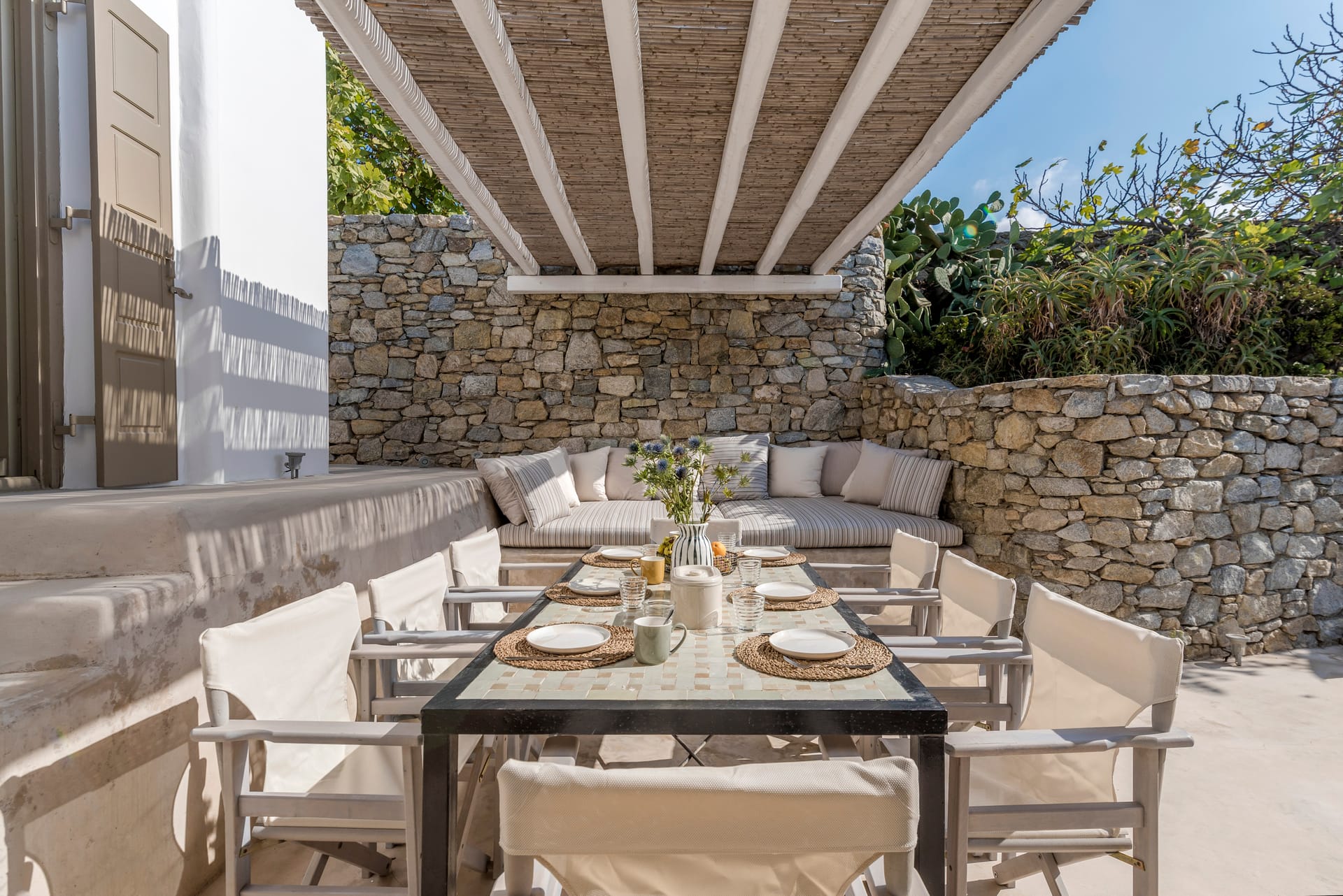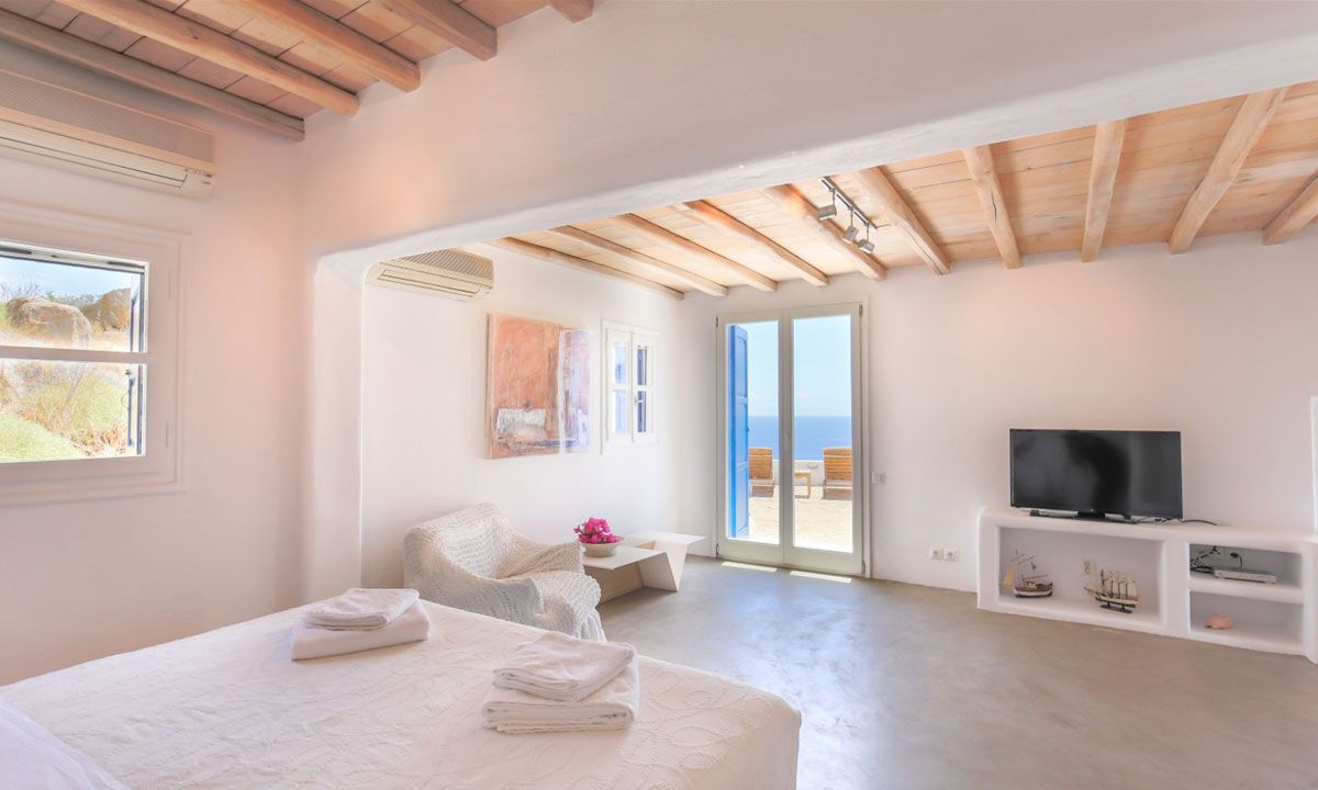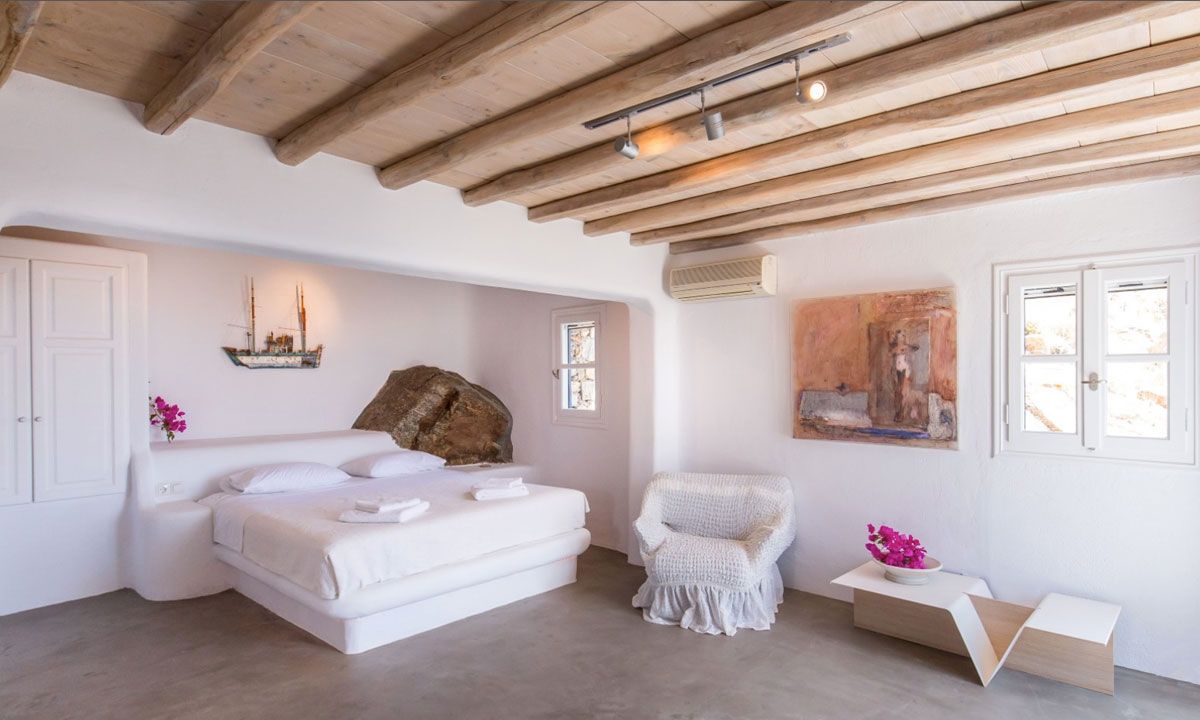 This elegant and spacious family villa is located in a privileged wind-sheltered location above the marvelous golden sand Agrari Beach with magnificent views of the Aegean Sea. Although located just 10 minutes by car from town, the property is offering tranquility, privacy and stunning scenery. Agrari Beach, with its intimate charm and crystal clear water, is just a quick 10 min walk downhill. The villa's charming interior, is described as "beach house style" combining traditional elements of Cycladic architecture with provincial selected details.