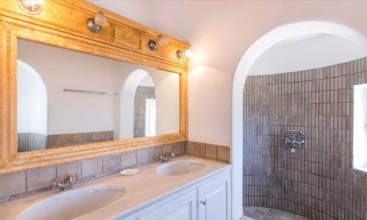 The outdoor spaces, surrounded by rocky hills and Mediterranean herbs, embrace the true spirit of summer life as they allow living each moment of the day in total comfort and relaxation. An array of three-level sitting areas and one distinct dining/lounge pergola-shaded area, paired with a traditional wood fire BBQ, is offering guests a perfect entertaining area. An elegant infinity pool surrounded by a very spacious sun deck with comfortable summer furniture dominates the villa's terrace well accompanied by a covered pergola providing shading. The fully equipped kitchen with modern appliances gives onto a pleasing living-sitting space directly accessing the swimming pool and its wide terraces.