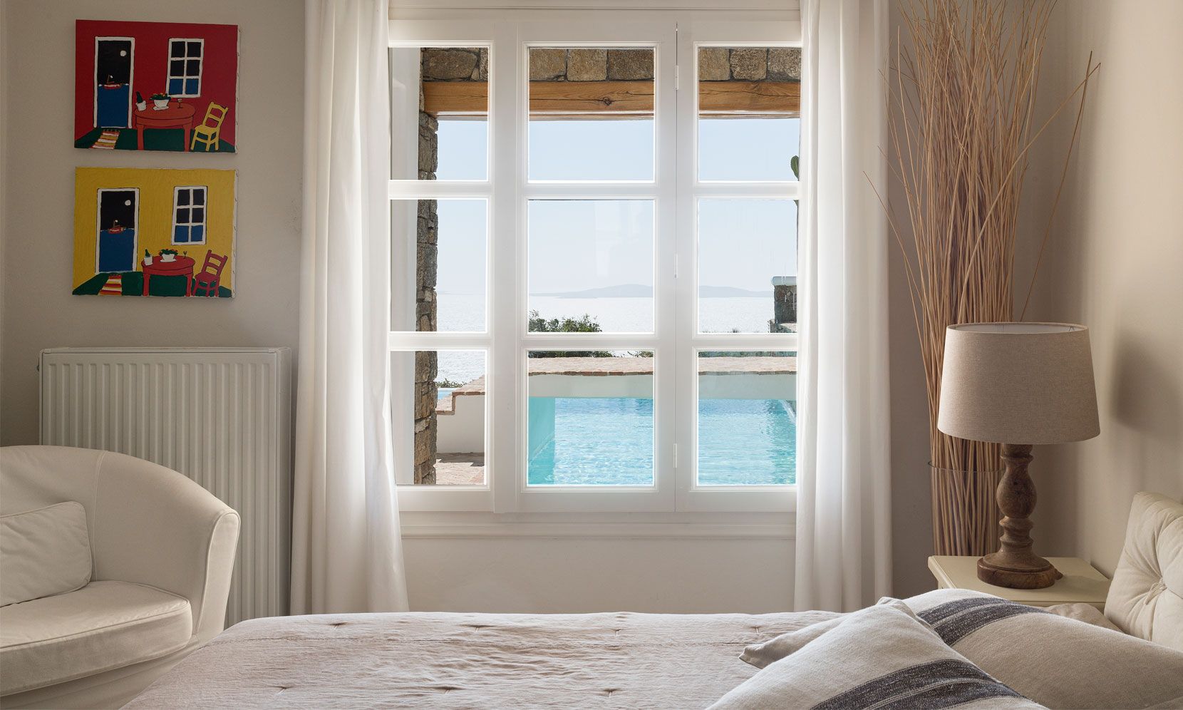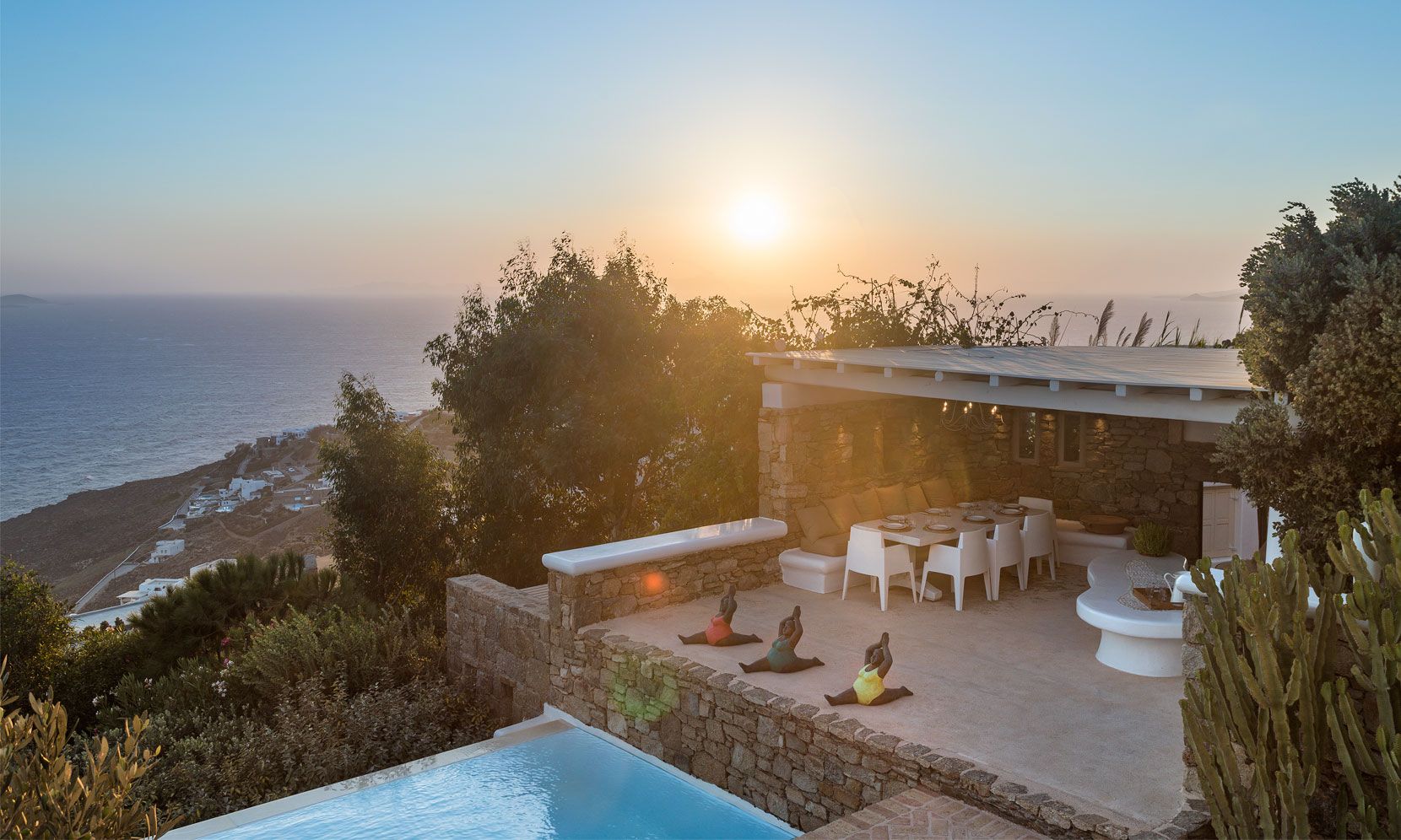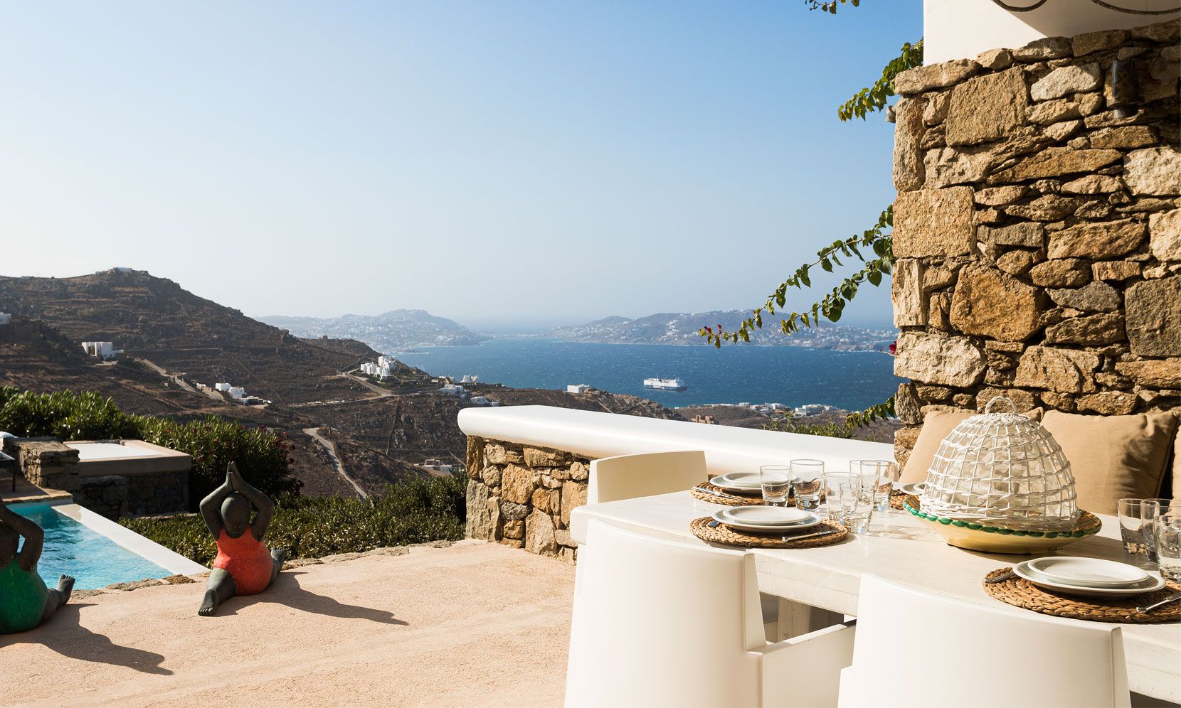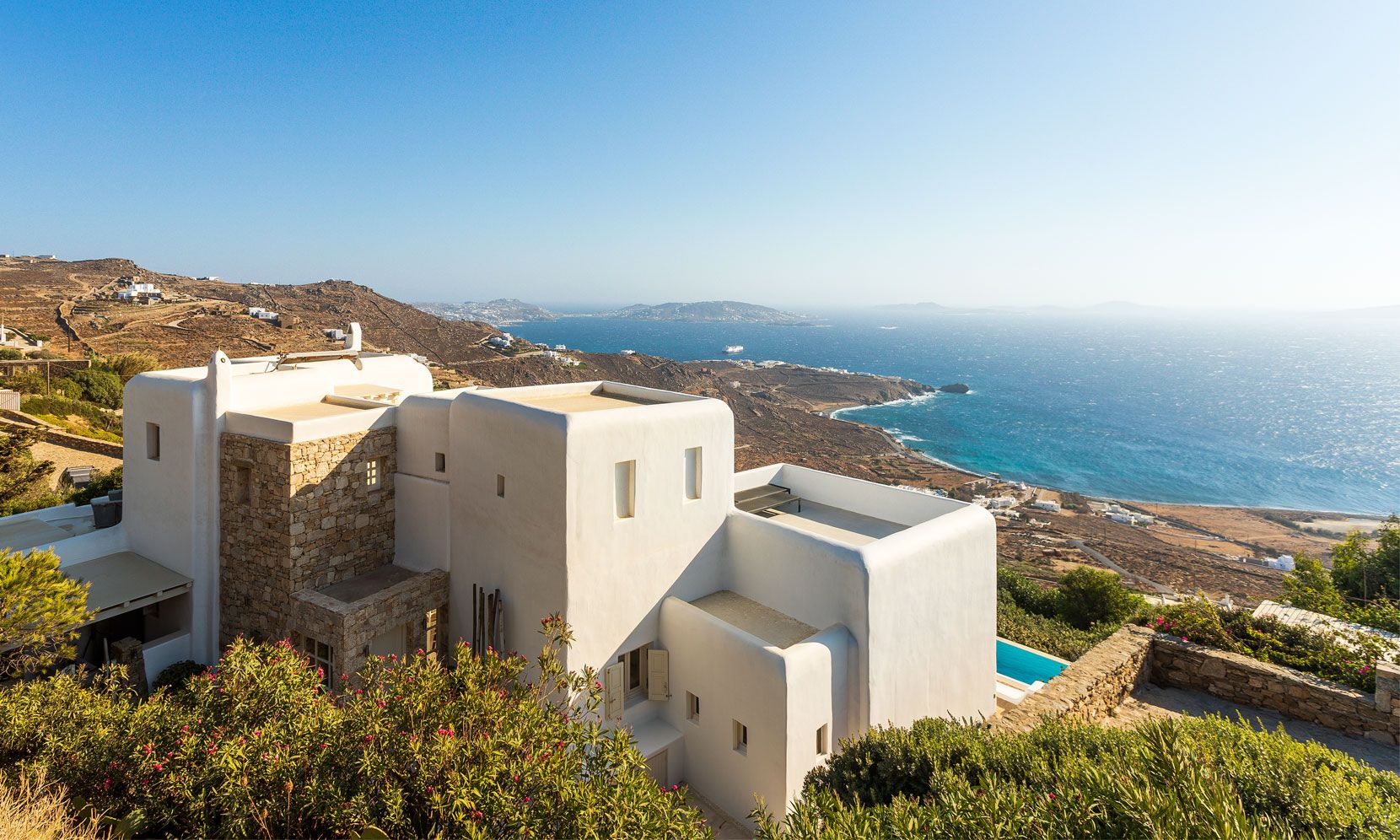 Mykonos Villa Callirhoe is located in one of the most prestigious areas of the island of Mykonos with a southern orientation facing the famous archeological site of the island of Delos and numerous other Cycladic islands of the Mediterranean sea..