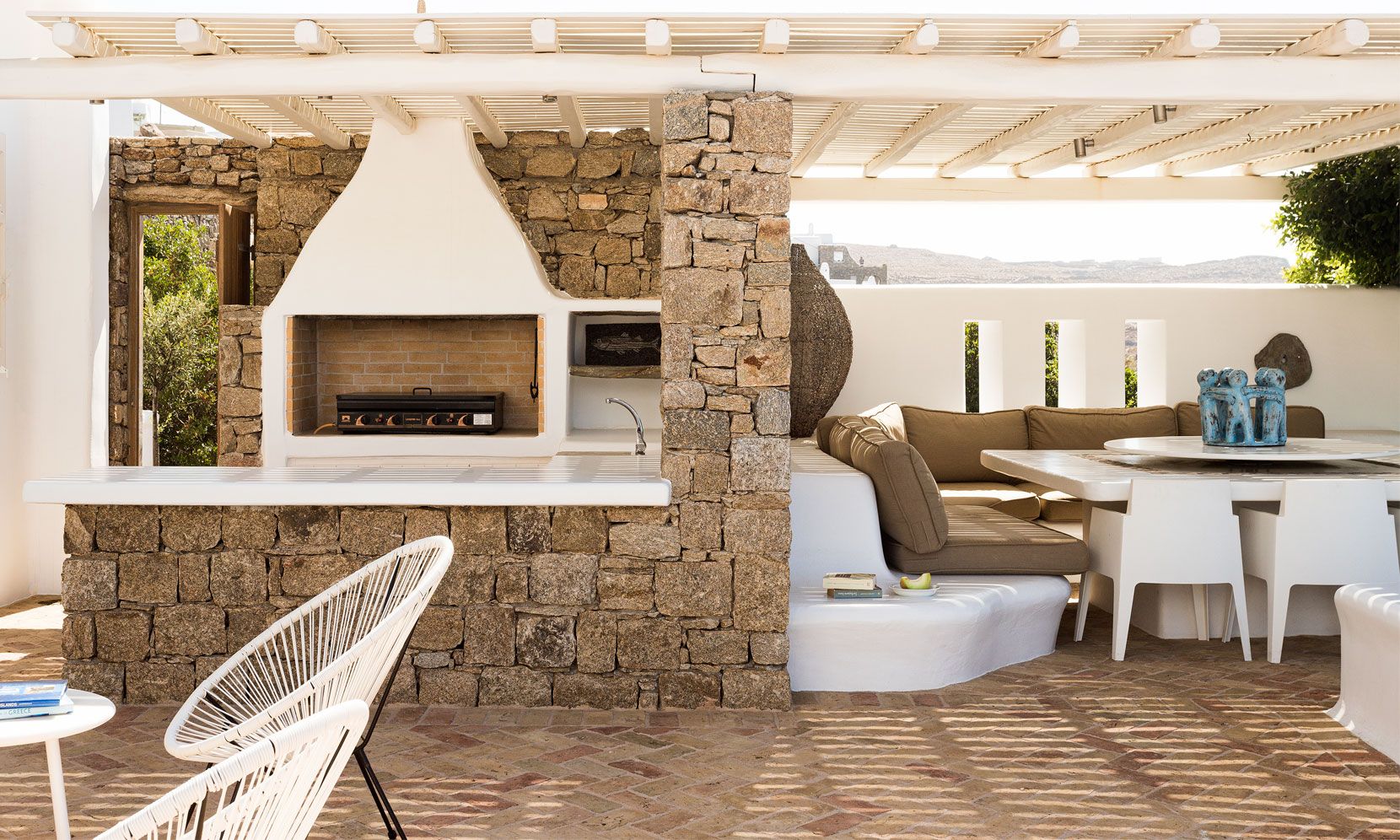 Large exterior spaces, with bbq and bar, areas for sunbathing and dining.