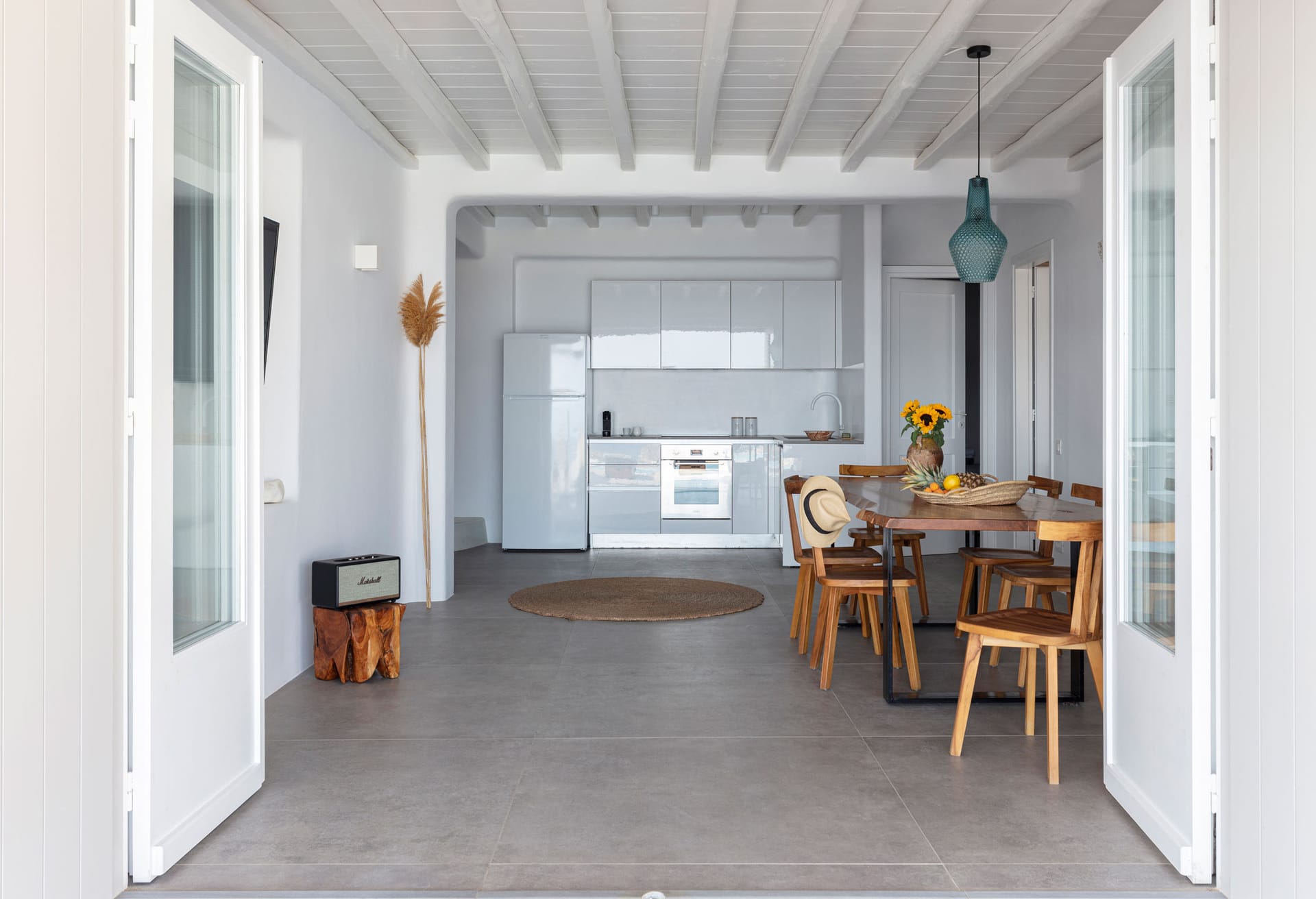 Clean shapes and a mix of custom-made furniture by local craftspeople and modern design pieces, give a fresh, authentic air to the spacious villa. The decoration is carefully selected, unpretentious and elegant with a charming personal touch, intended to make you feel at home, away from home.