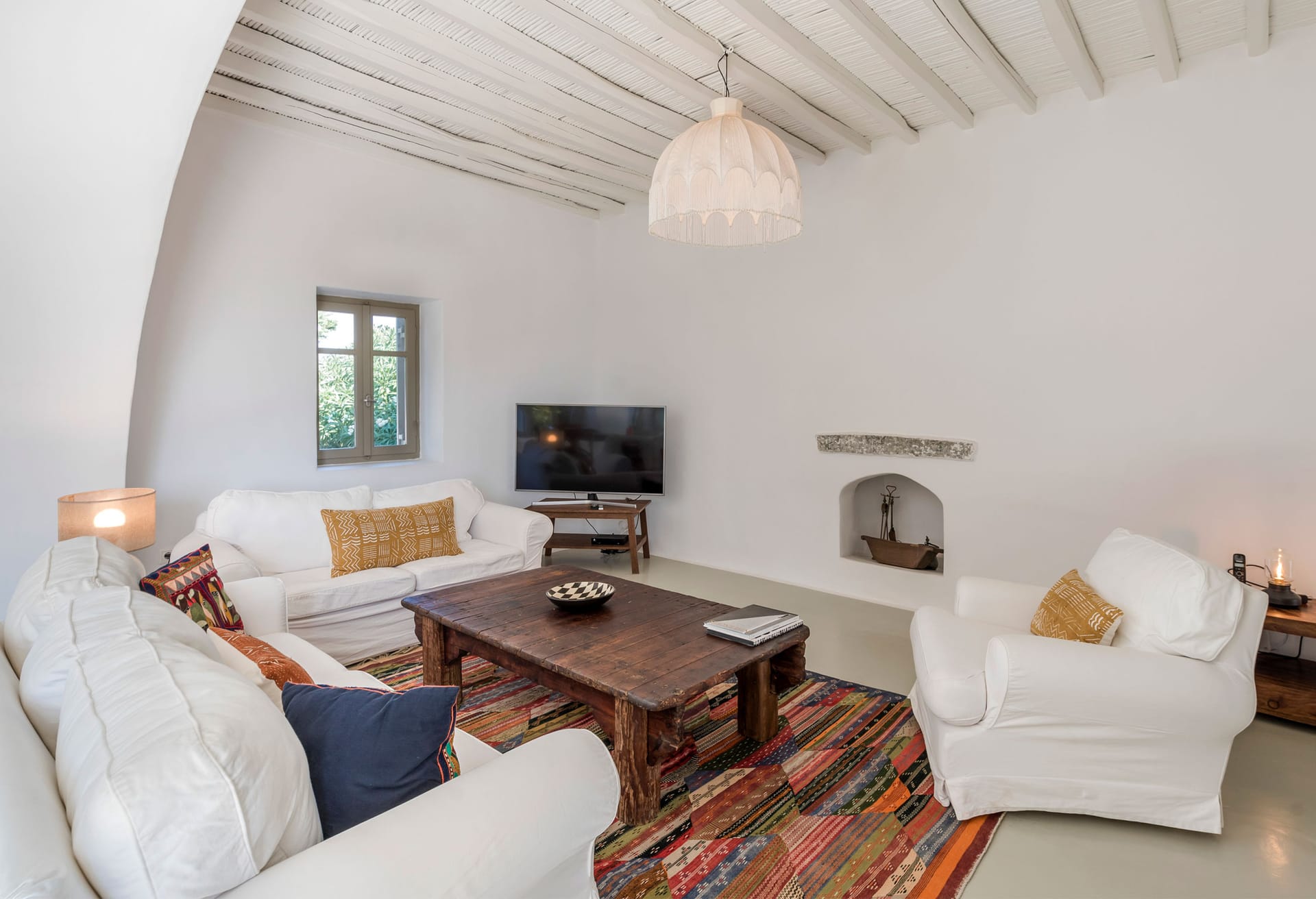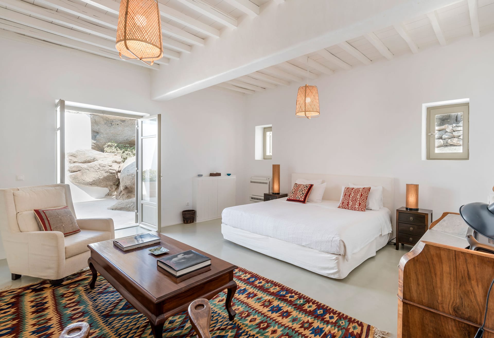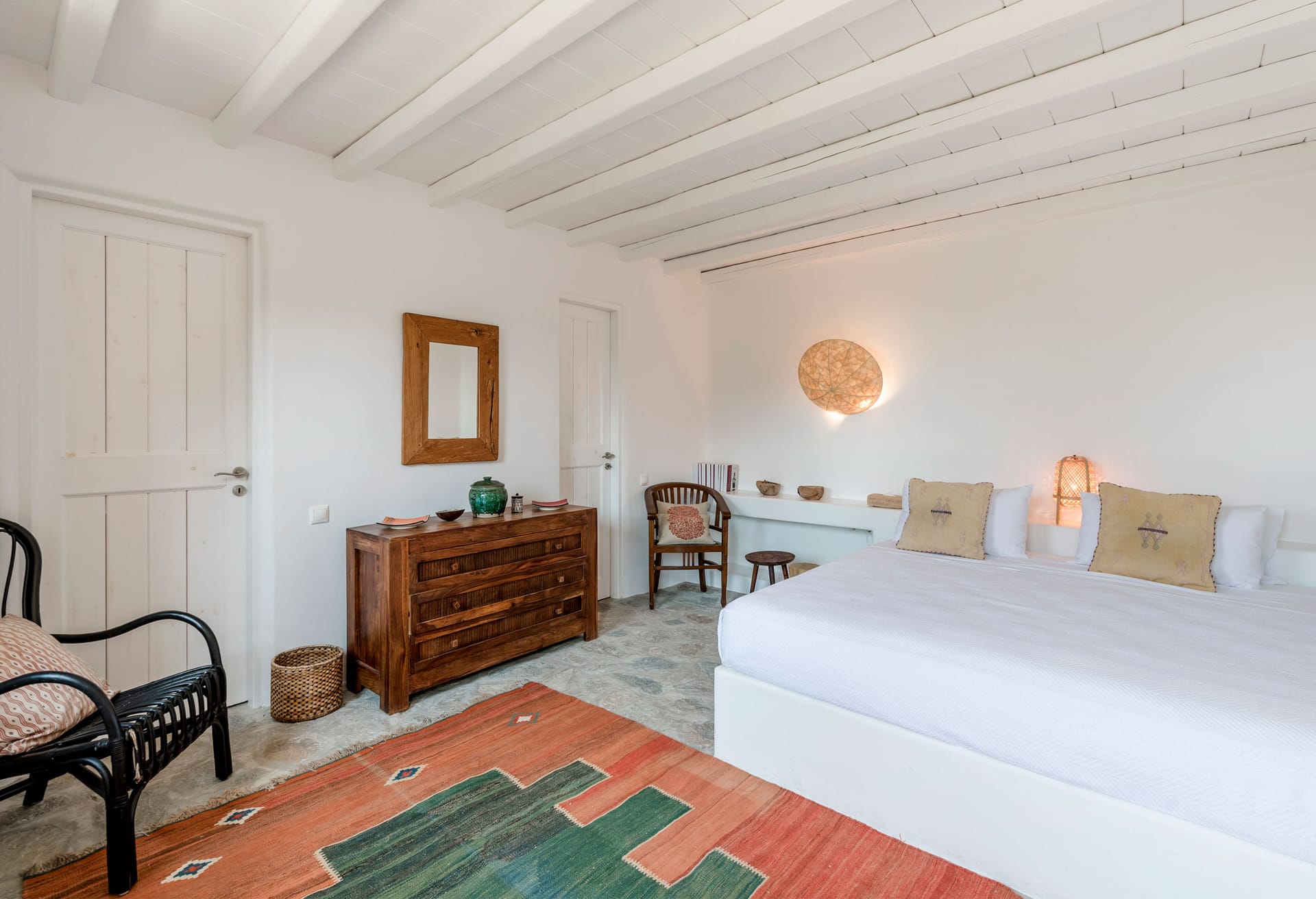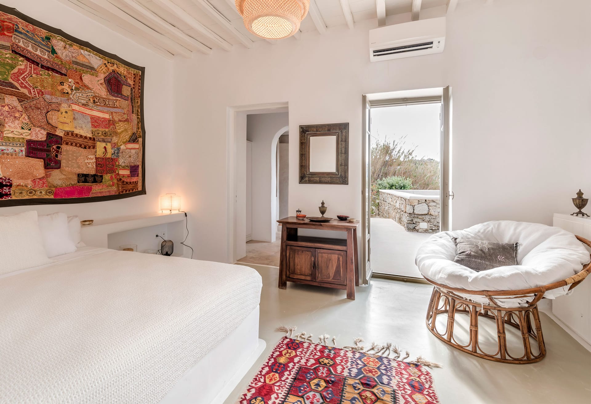 Villa Ciel is a Cycladic villa, enhanced by modern comforts cleverly blended with a bohemian & ethnic touch. It is exceptionally situated in the center of Mykonos town and it is ideal for those who want to combine their vacations allowing for peace & quiet and those who want to enjoy the famous night life of Mykonos. It offers superb sea, sunset and town view from above, while you are just only a breath away from all the famous spots.