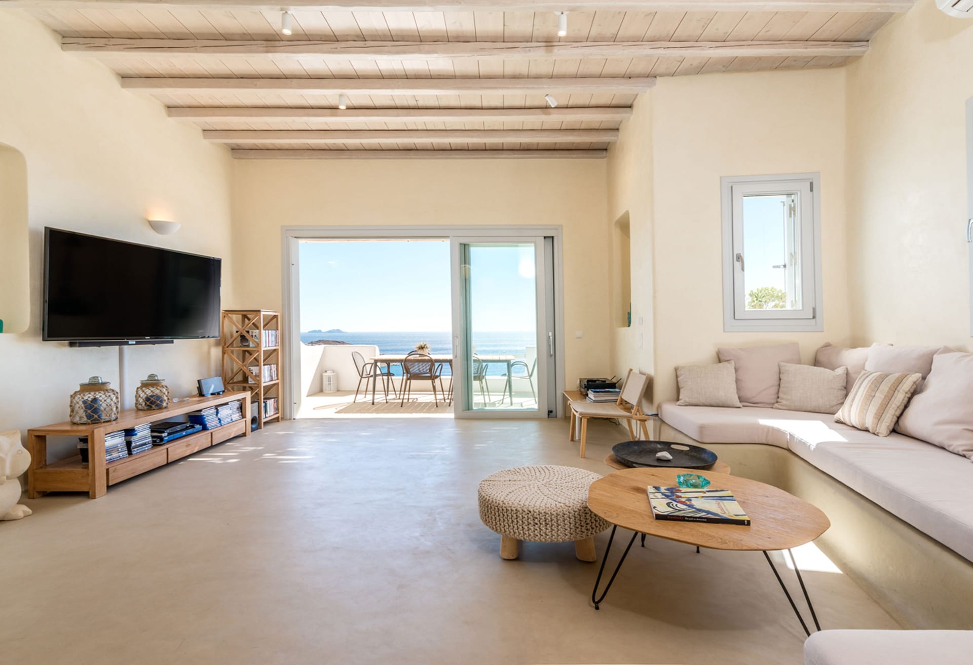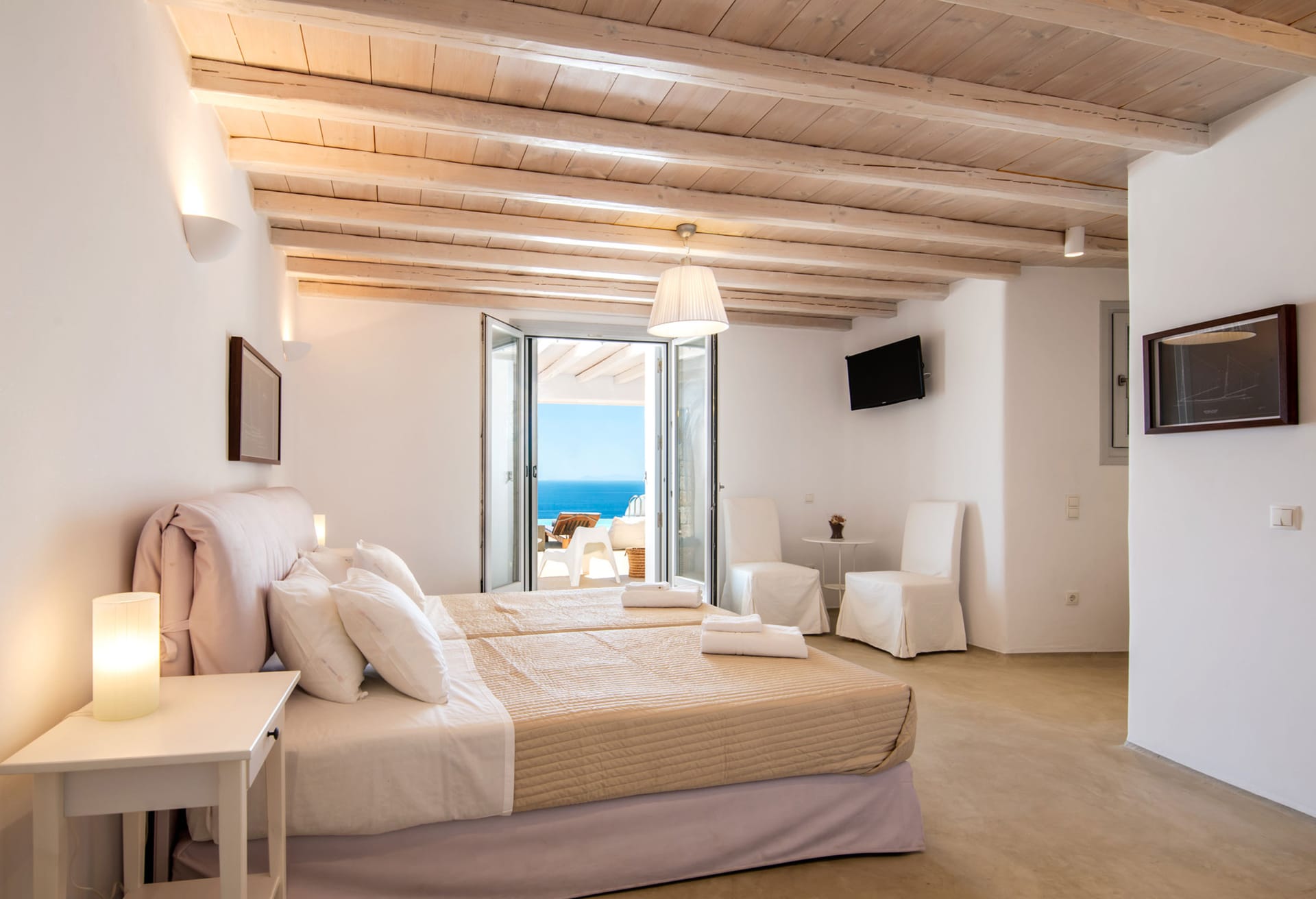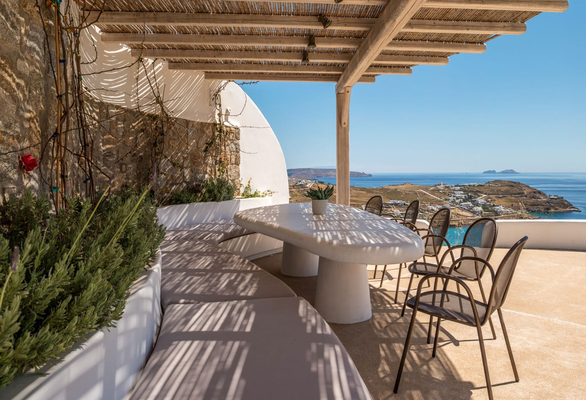 5 Bedrooms and 5 Bathrooms, a fully equipped kitchen, a living room and a dining room complete the Villa's interior. For classic Myconian al fresco dining experiences, there is a shaded outdoor dining area that can accommodate 15 or more people.