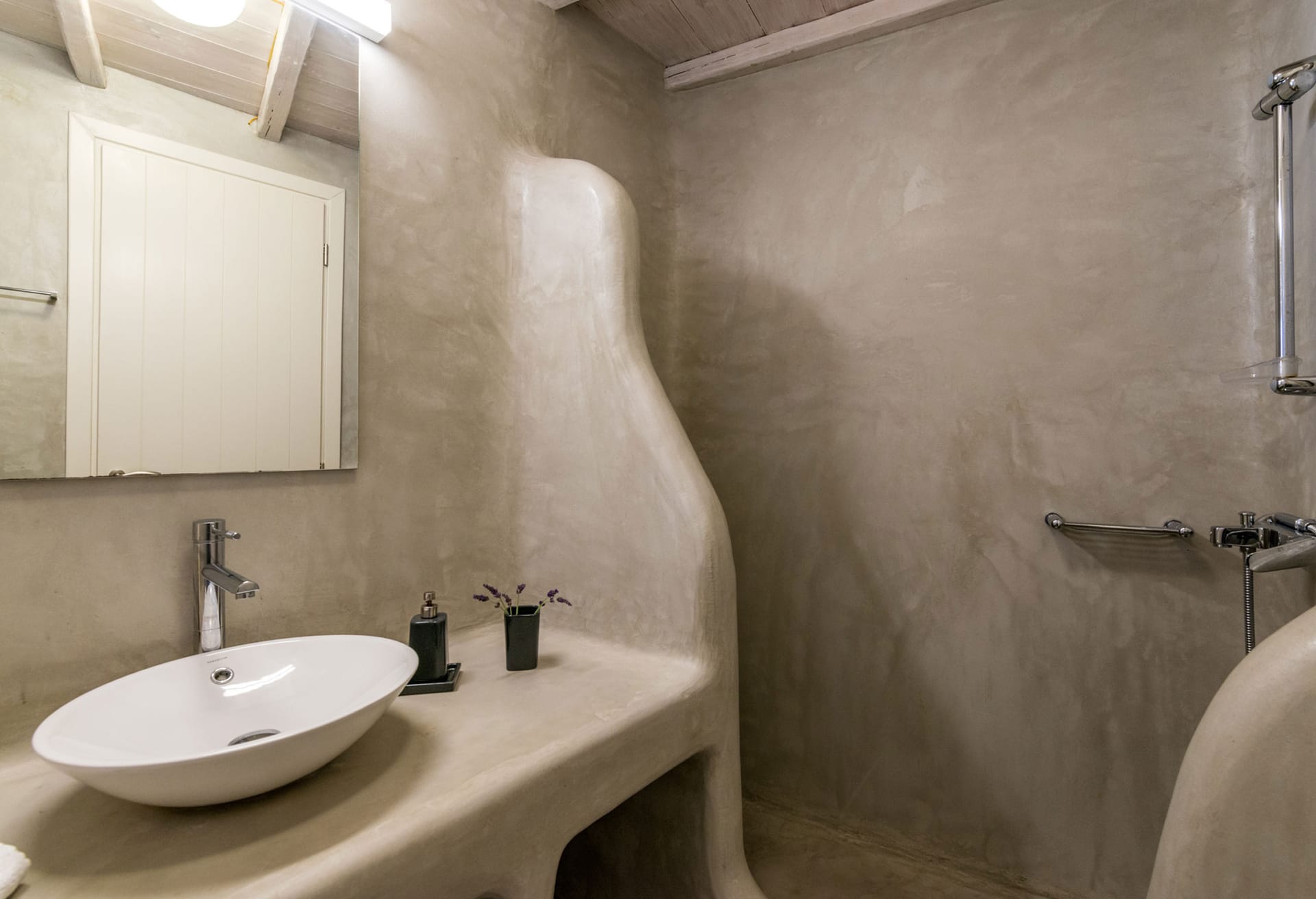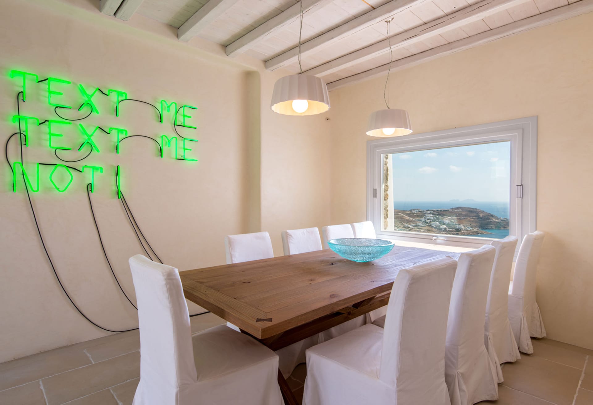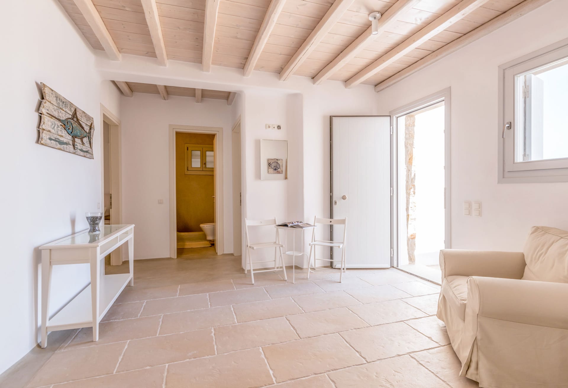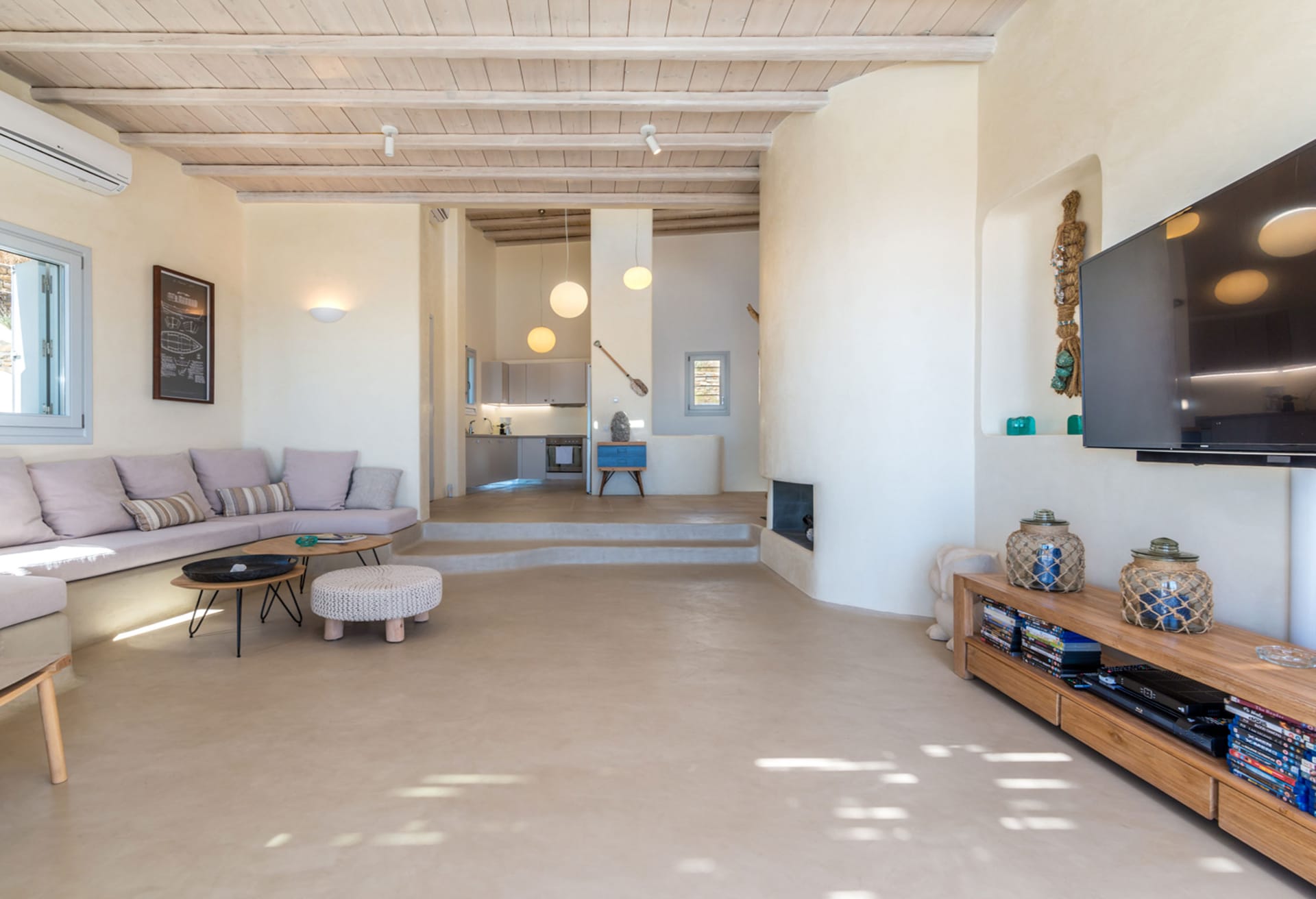 5 Bedrooms and 5 Bathrooms, a fully equipped kitchen, a living room and a dining room complete the Villa's interior. For classic Myconian al fresco dining experiences, there is a shaded outdoor dining area that can accommodate 15 or more people.
