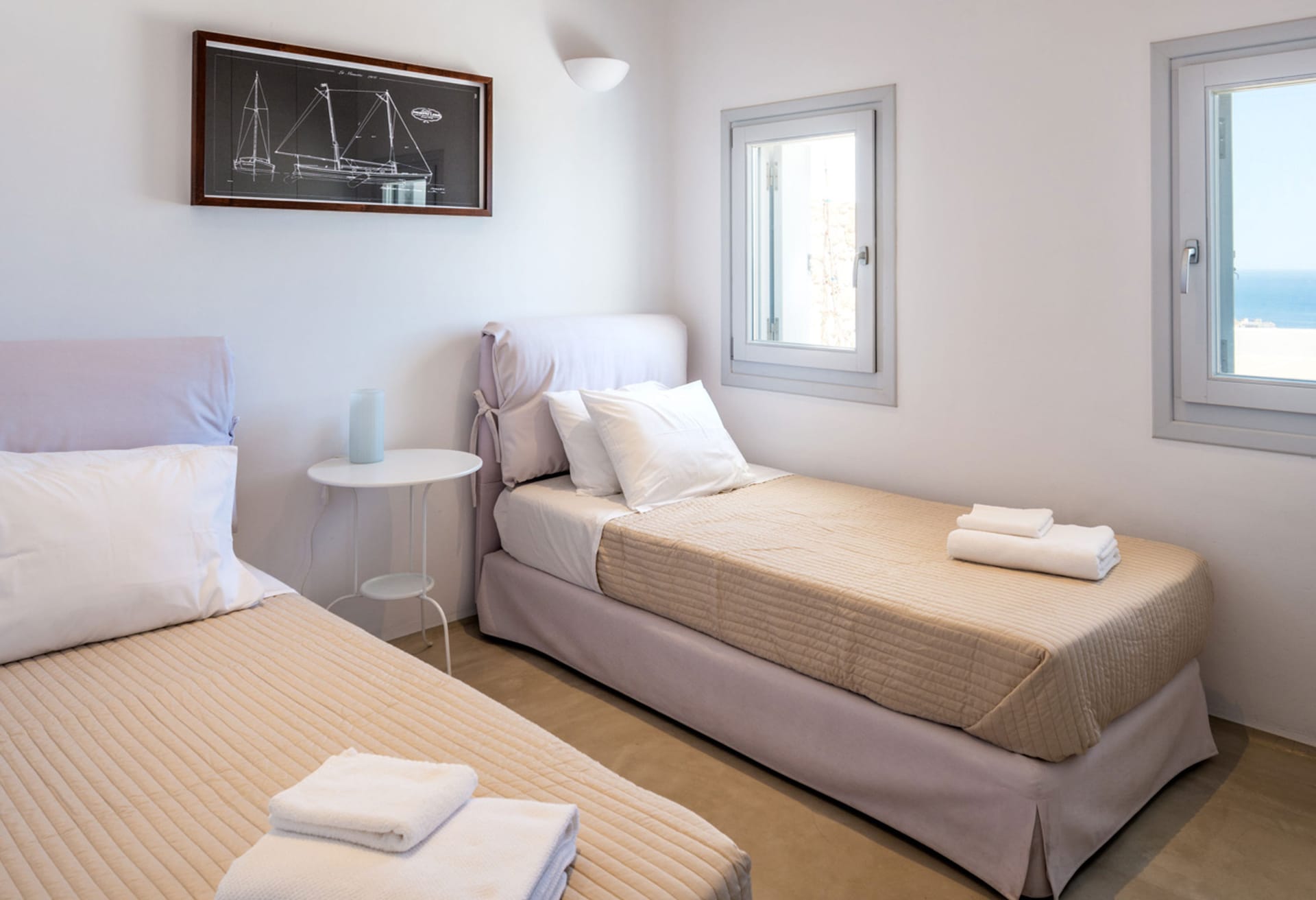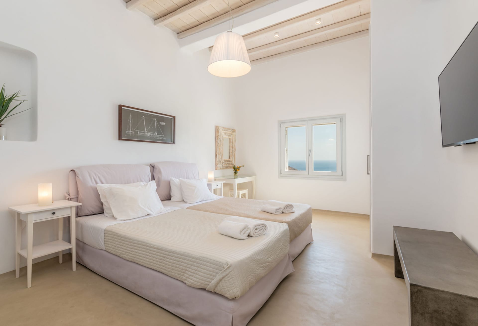 - 1 master bedroom with twin beds (that join into a queen size bed), A/C, en-suite bathroom with shower, hairdryer, TV, sea view