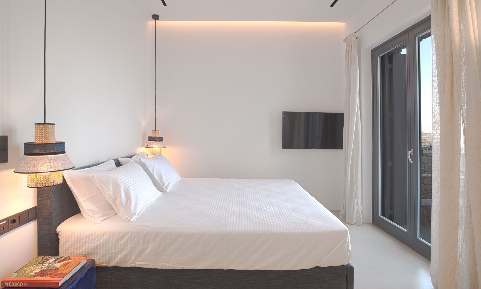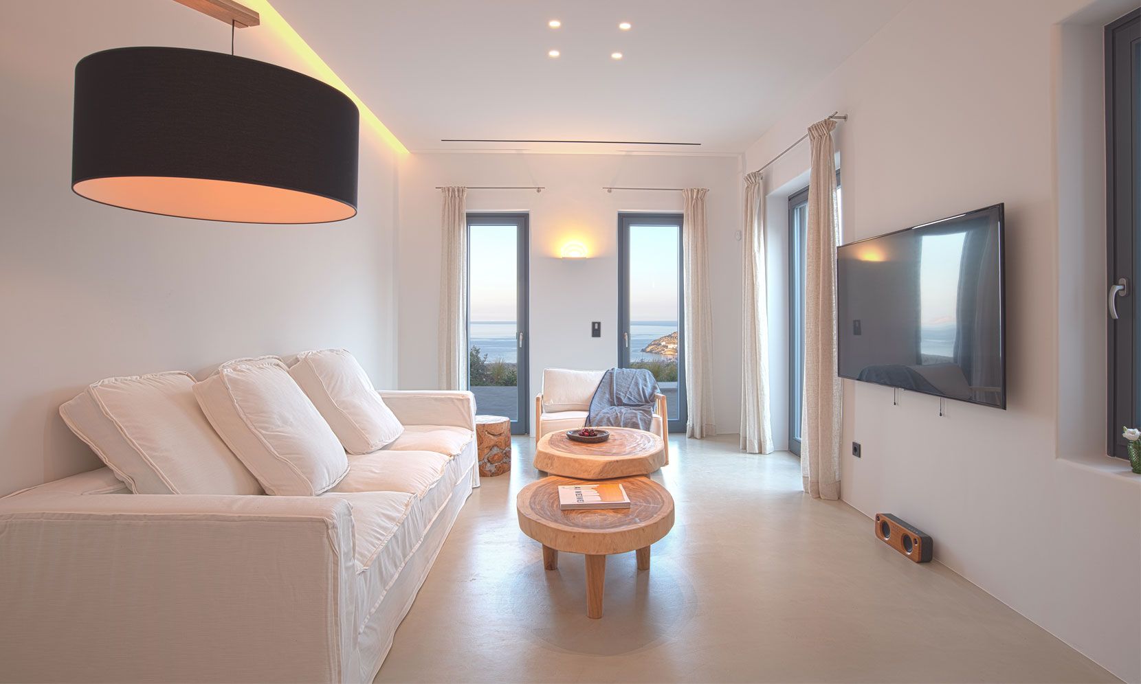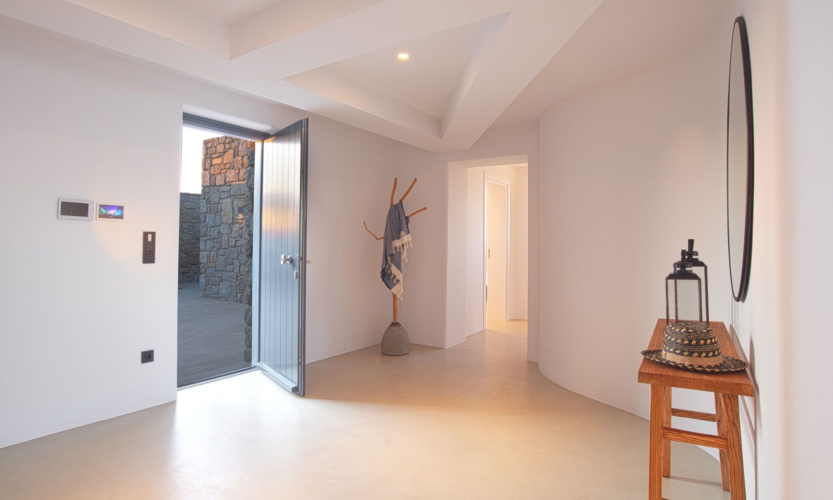 Situated at a privileged plot of land that affords glorious views of the Aegean, Villa emerald 1 is a handsome 250sq.m. four bedroom residence that perfectly captures the island’s timeless panache. The structure, a stone-clad slab designed to have minimal impact on the landscape, spans two levels that open to terraces equipped with all the open-air living essentials: there are pergola shaded lounge and dining spaces and a gorgeous infinity pool, all oriented toward the seascape. Although the residence is part of a 3-house complex, it is the biggest of all and it is configured in such a way that it feels private and completely open to the glorious landscape at the same time.