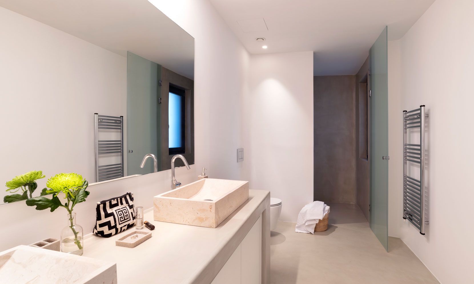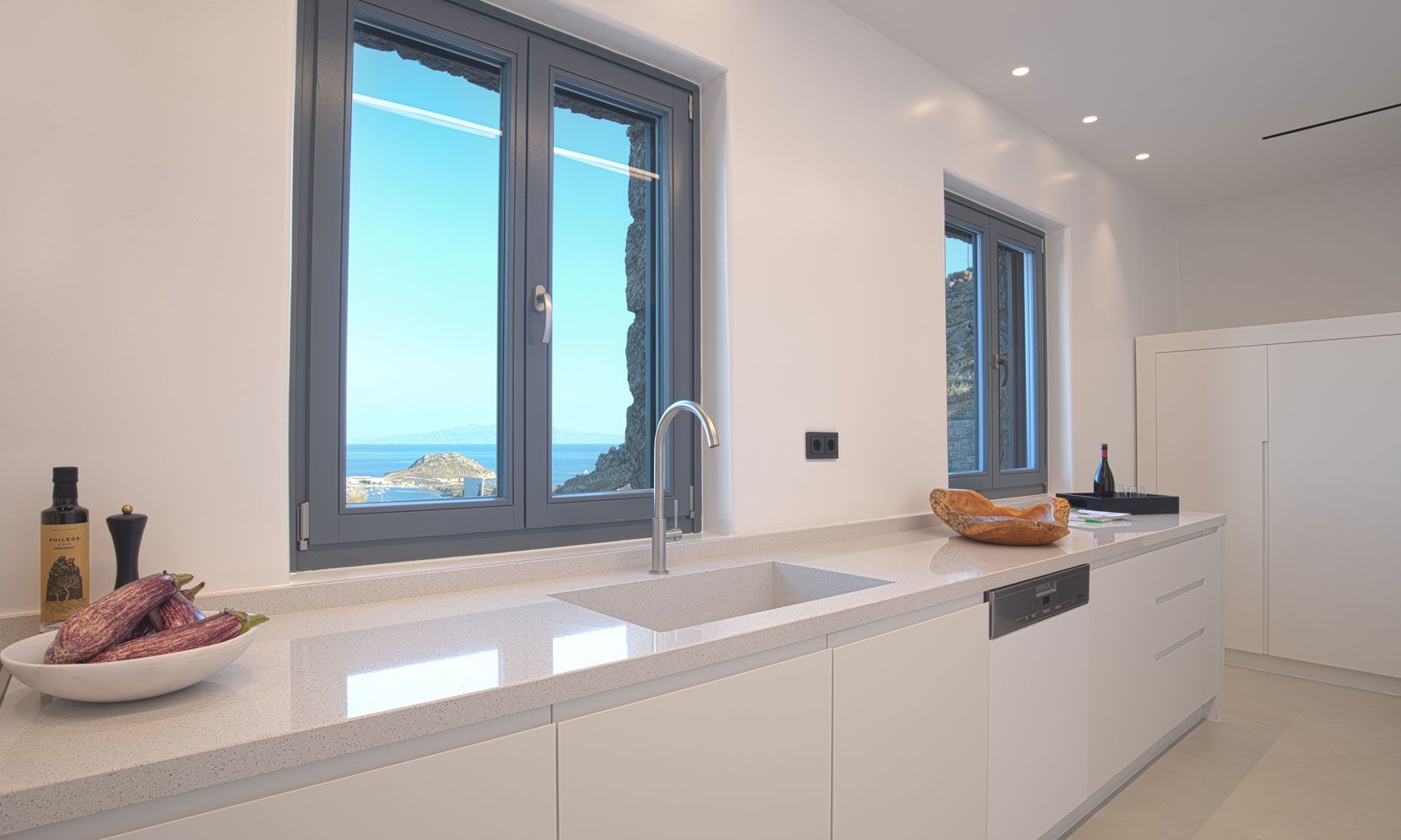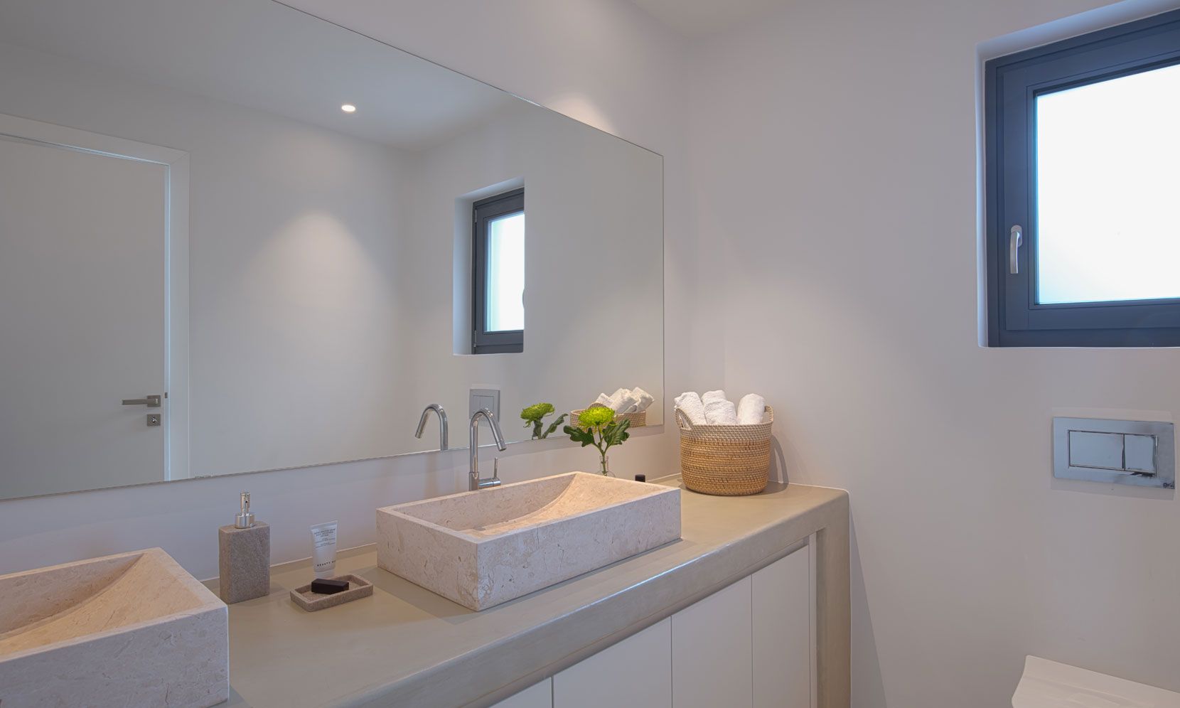 Situated at a privileged plot of land that affords glorious views of the Aegean, Villa emerald 1 is a handsome 250sq.m. four bedroom residence that perfectly captures the island’s timeless panache. The structure, a stone-clad slab designed to have minimal impact on the landscape, spans two levels that open to terraces equipped with all the open-air living essentials: there are pergola shaded lounge and dining spaces and a gorgeous infinity pool, all oriented toward the seascape. Although the residence is part of a 3-house complex, it is the biggest of all and it is configured in such a way that it feels private and completely open to the glorious landscape at the same time.