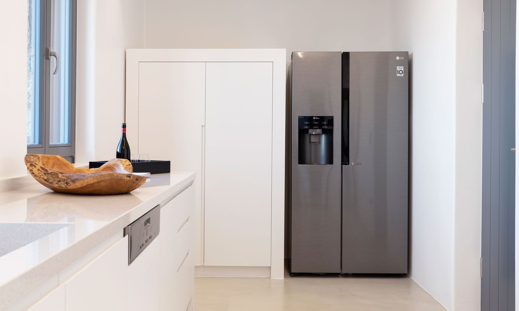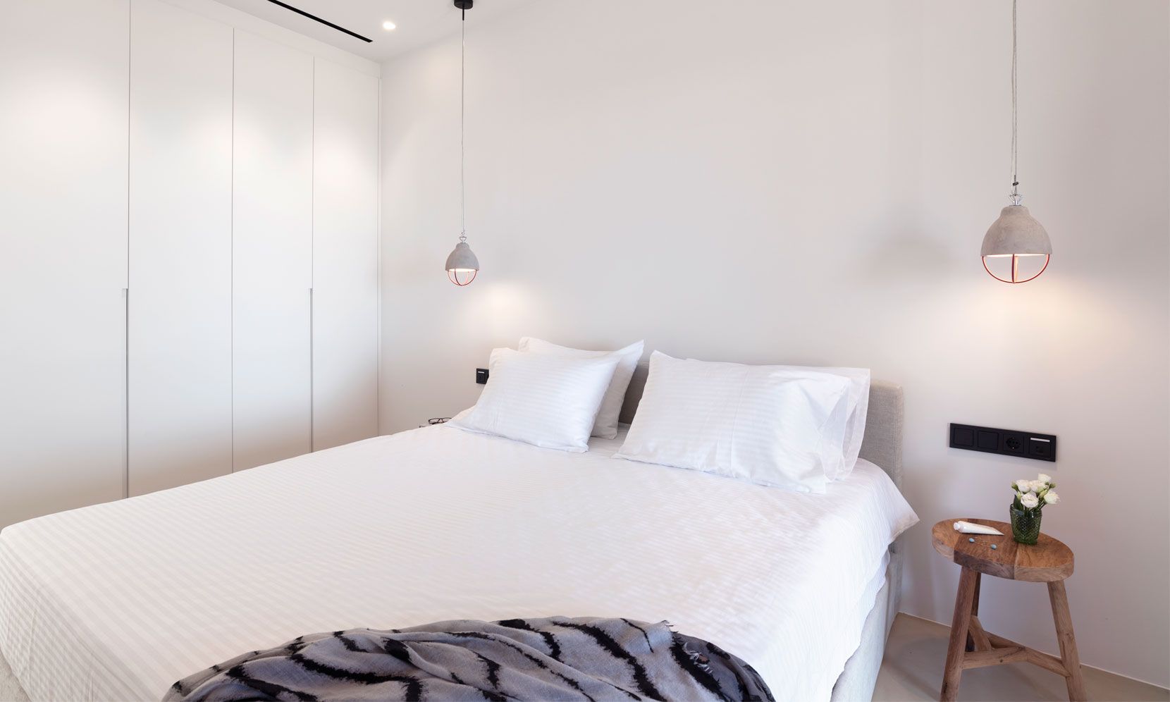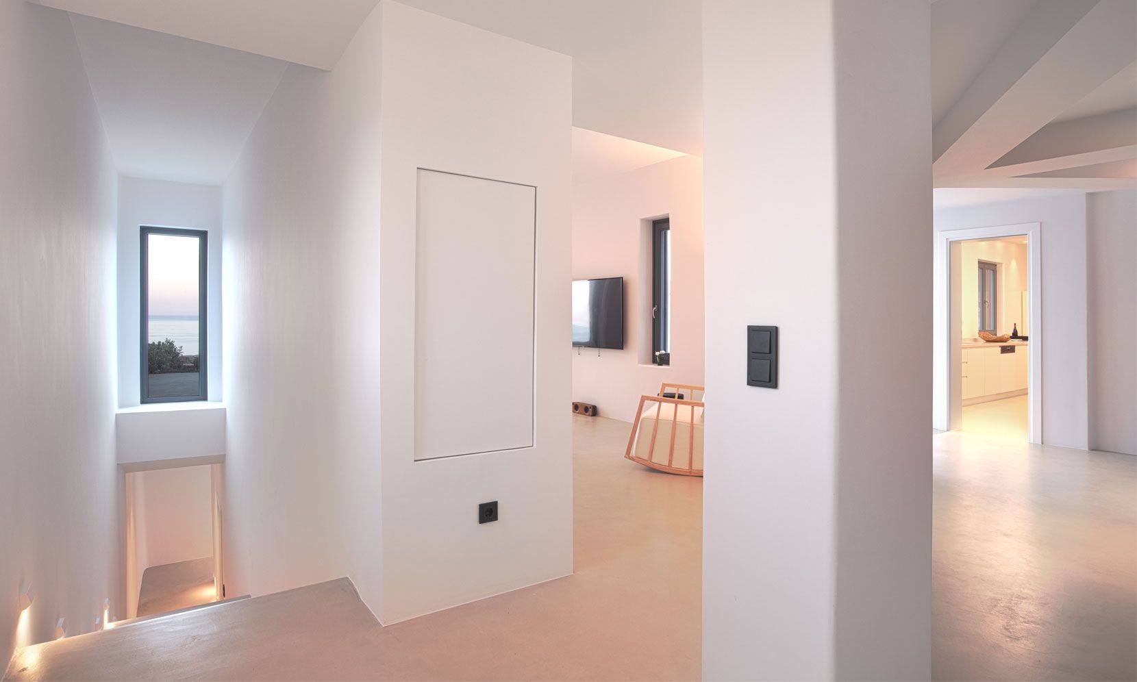 Moving inwards, the house’s ultra-chic minimal aesthetics called for swathes of empty space and a white-on-white palette sometimes interrupted by dark hues that further highlight the absence of color. A few details in wood and wicker are used to add warmth to the rooms and convey a natural feel. The result is a bundle of blissfully clutter-free spaces that have an immediate soothing effect on both the eye and the soul. Throughout the house, tall windows and glass doors capture the scenery and invite the sunlight in. Hidden lighting is used to set the mood after the sun goes down. The living room is outfitted with handpicked signature pieces that serve both a functional and a decorative purpose. In the same concept, the bedrooms are minimally decorated with statement lighting fixtures and a designer piece here and there to convey a knack for design without creating a distraction from the house’s tranquil vibe. There is one en-suite bedroom at the ground level and three more at the lower level, each with its own bathroom.