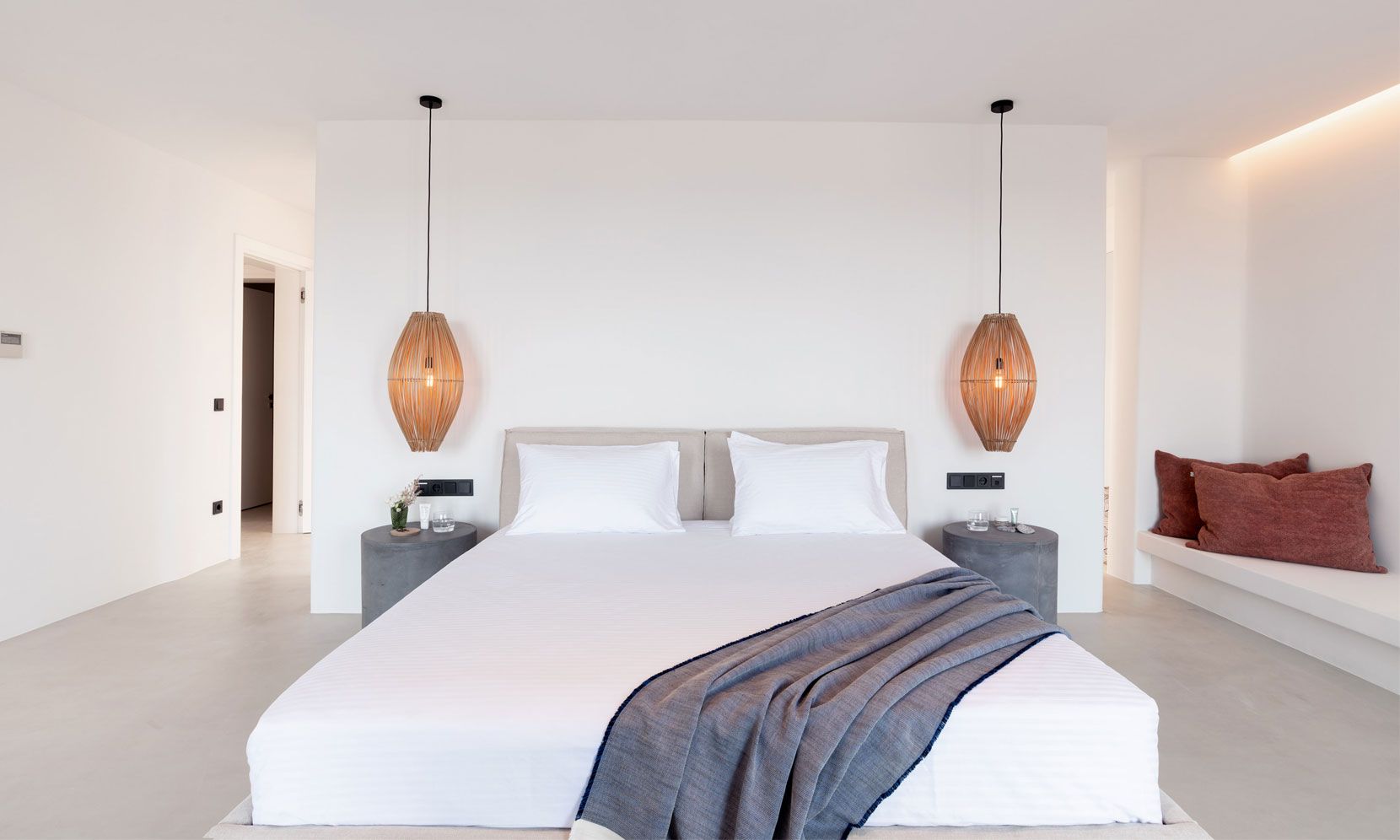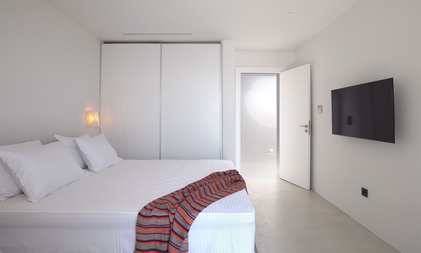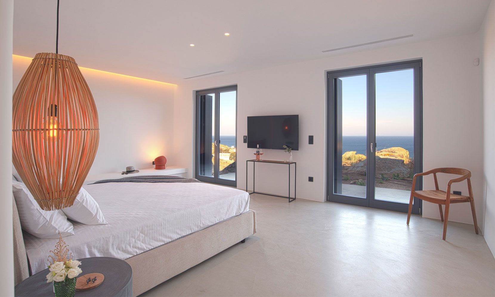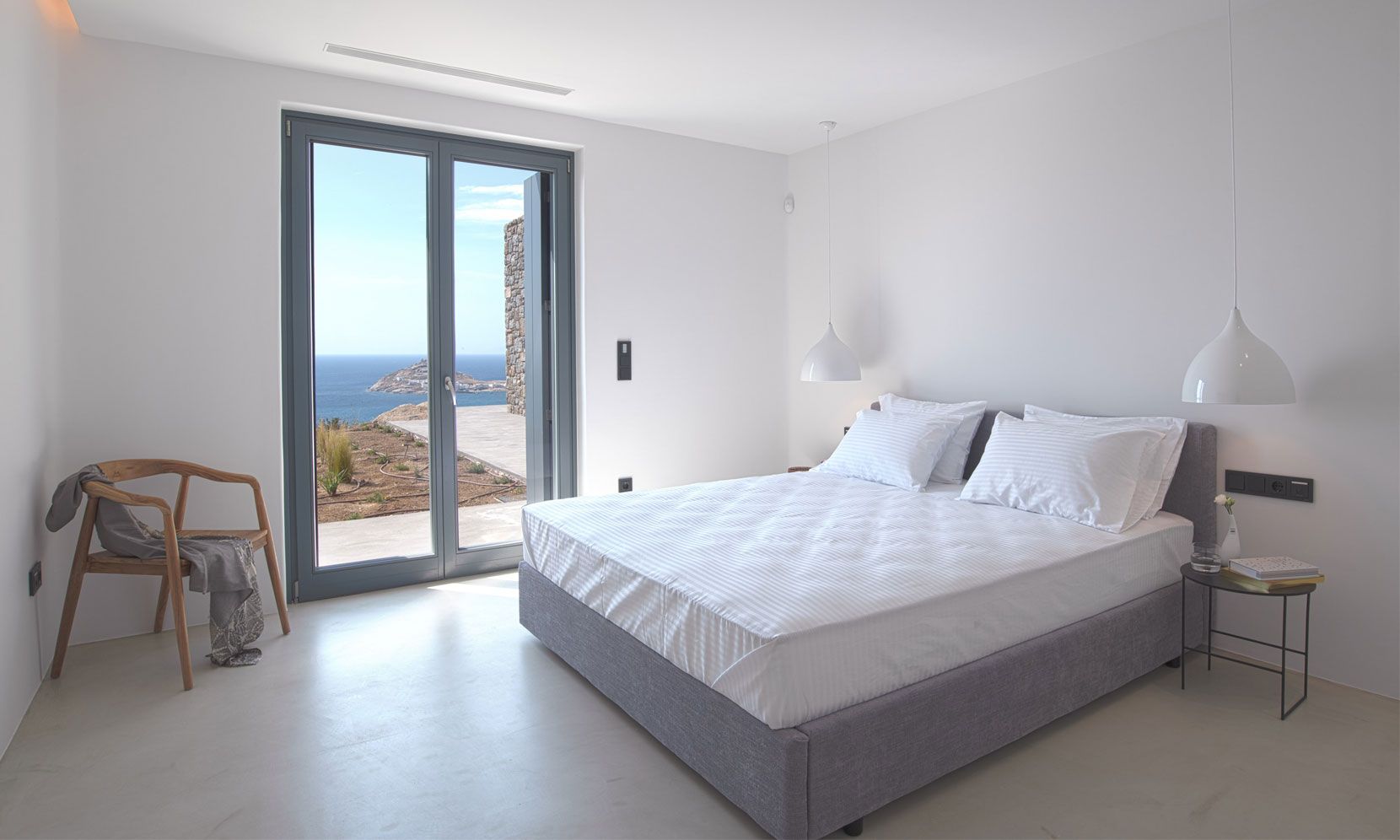 The interior adheres to the principles of minimalism dictated both by modern architecture and the island’s vernacular. Clean lines, polished concrete floors and uniform white walls that reflect the sunlight create a canvas that allows nature to become the focal point of the setting. To that end, the living areas are pierced by glass doors that connect the interior to the landscape. Ornamentation is kept to a minimum, with few handpicked objects that are carefully placed around to house to complement the toned-down décor. The ground level features a cozy living room, a fully equipped kitchen and a guest WC. A staircase leads to the four different sized bedrooms that occupy the lower level, all equipped with glass doors that open to the terrace and their own bathroom. Although the house is part of a complex, it is designed to offer privacy without compromising its captivating vistas.