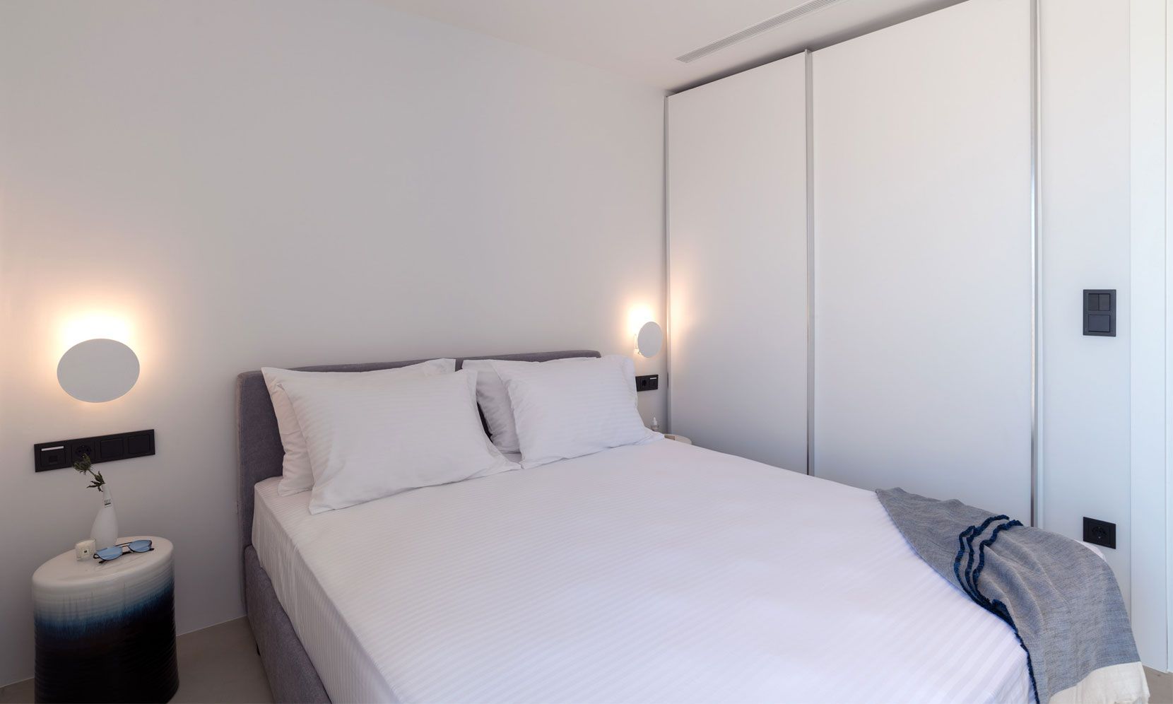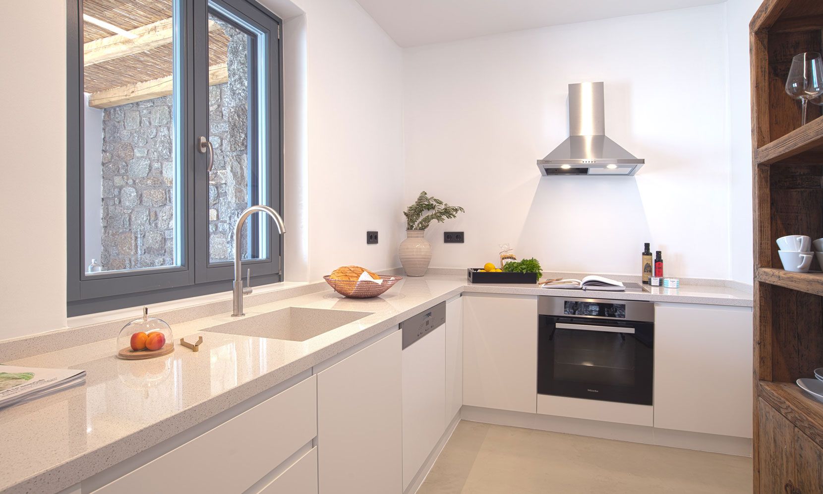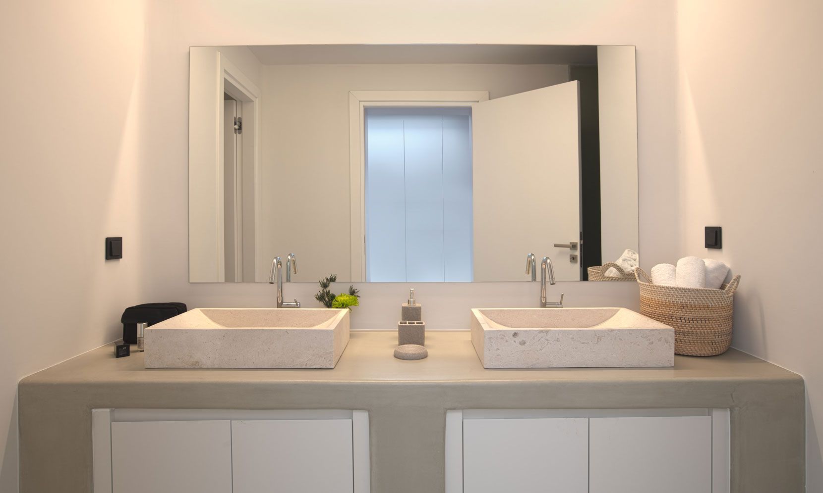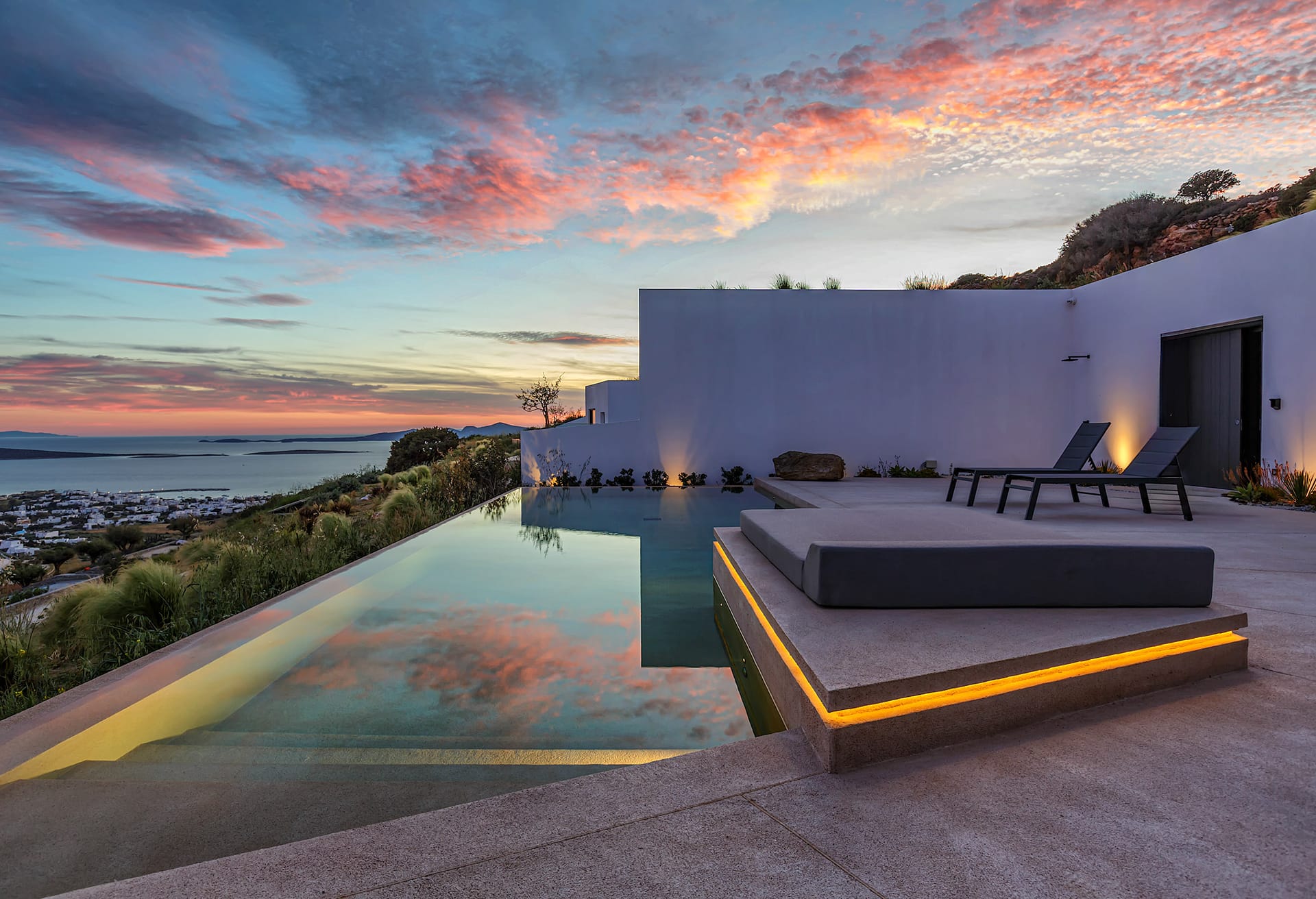 The interior adheres to the principles of minimalism dictated both by modern architecture and the island’s vernacular. Clean lines, polished concrete floors and uniform white walls that reflect the sunlight create a canvas that allows nature to become the focal point of the setting. To that end, the living areas are pierced by glass doors that connect the interior to the landscape. Ornamentation is kept to a minimum, with few handpicked objects that are carefully placed around to house to complement the toned-down décor. The ground level features a cozy living room, a fully equipped kitchen and a guest WC. A staircase leads to the four different sized bedrooms that occupy the lower level, all equipped with glass doors that open to the terrace and their own bathroom. Although the house is part of a complex, it is designed to offer privacy without compromising its captivating vistas.