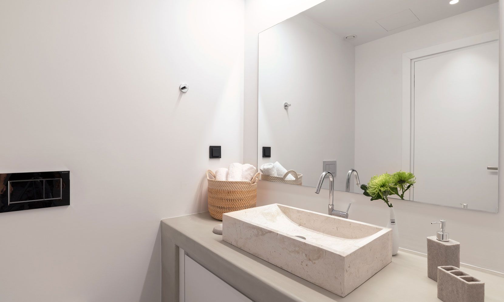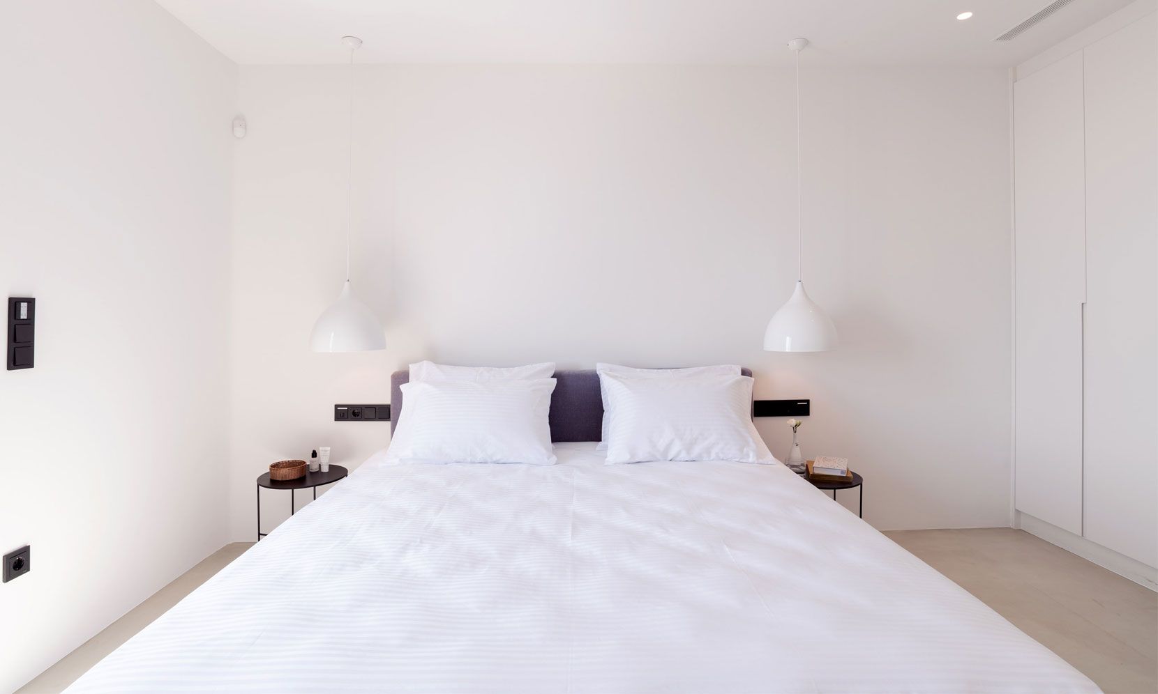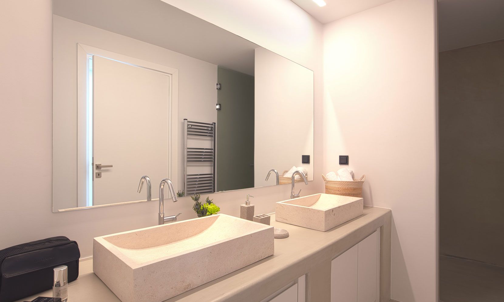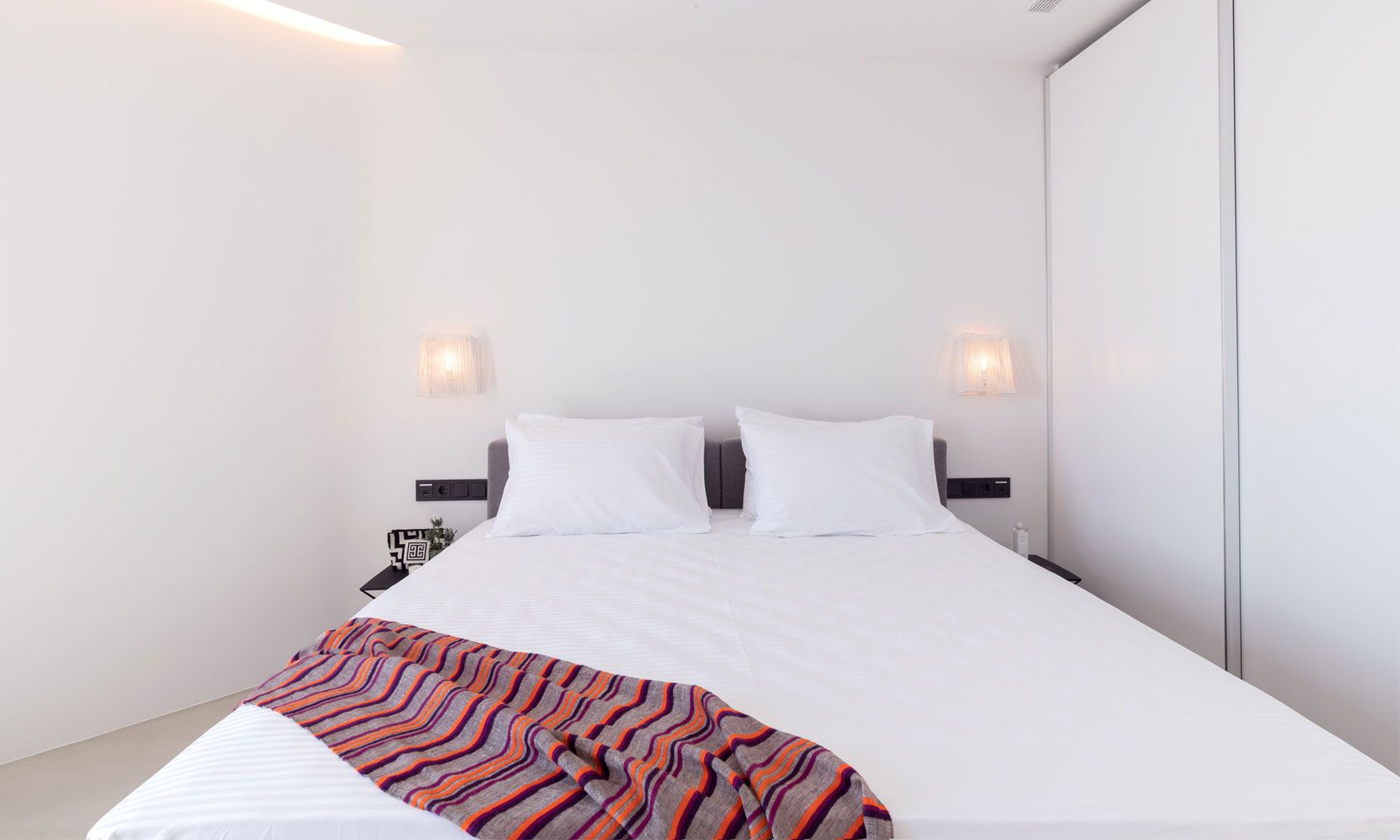 The interior adheres to the principles of minimalism dictated both by modern architecture and the island’s vernacular. Clean lines, polished concrete floors and uniform white walls that reflect the sunlight create a canvas that allows nature to become the focal point of the setting. To that end, the living areas are pierced by glass doors that connect the interior to the landscape. Ornamentation is kept to a minimum, with few handpicked objects that are carefully placed around to house to complement the toned-down décor. The ground level features a cozy living room, a fully equipped kitchen and a guest WC. A staircase leads to the four different sized bedrooms that occupy the lower level, all equipped with glass doors that open to the terrace and their own bathroom. Although the house is part of a complex, it is designed to offer privacy without compromising its captivating vistas.