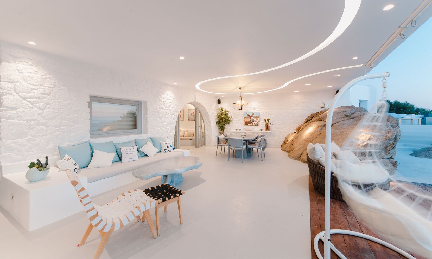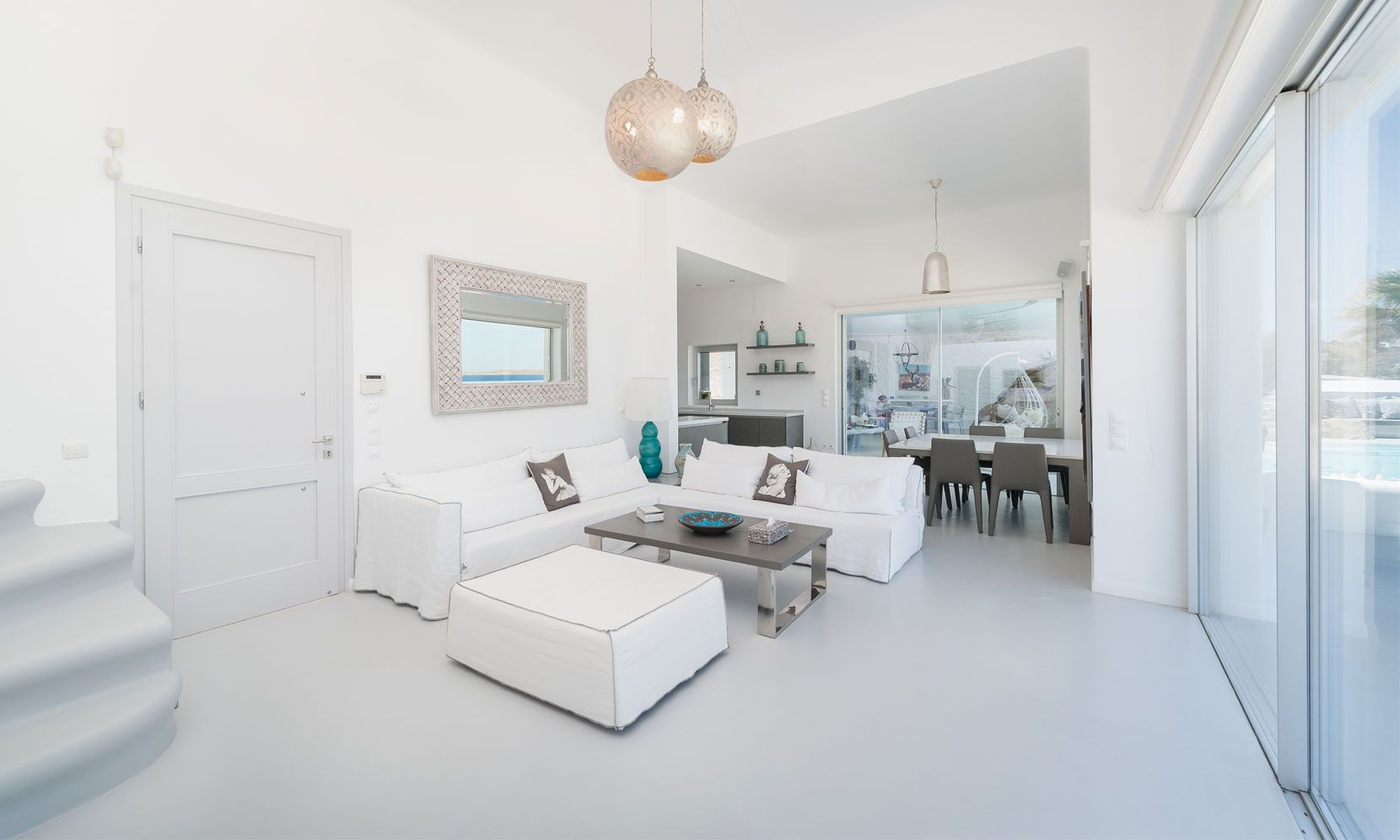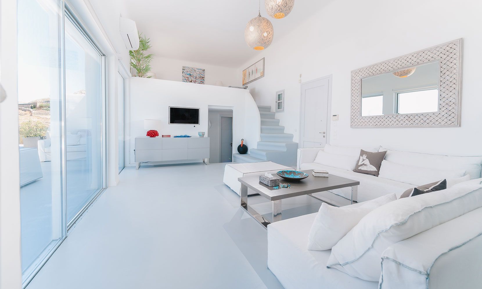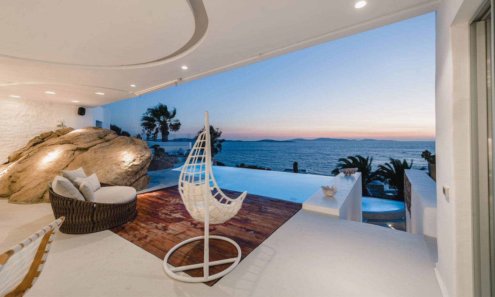 The interior villa, dressed in white and combining contemporary design with art and lux, is a cross-section of traditional and modern Cycladic architecture. All its indoor areas, overlooking the pool and the sea, are decorated in highest of standards with elegant furniture.