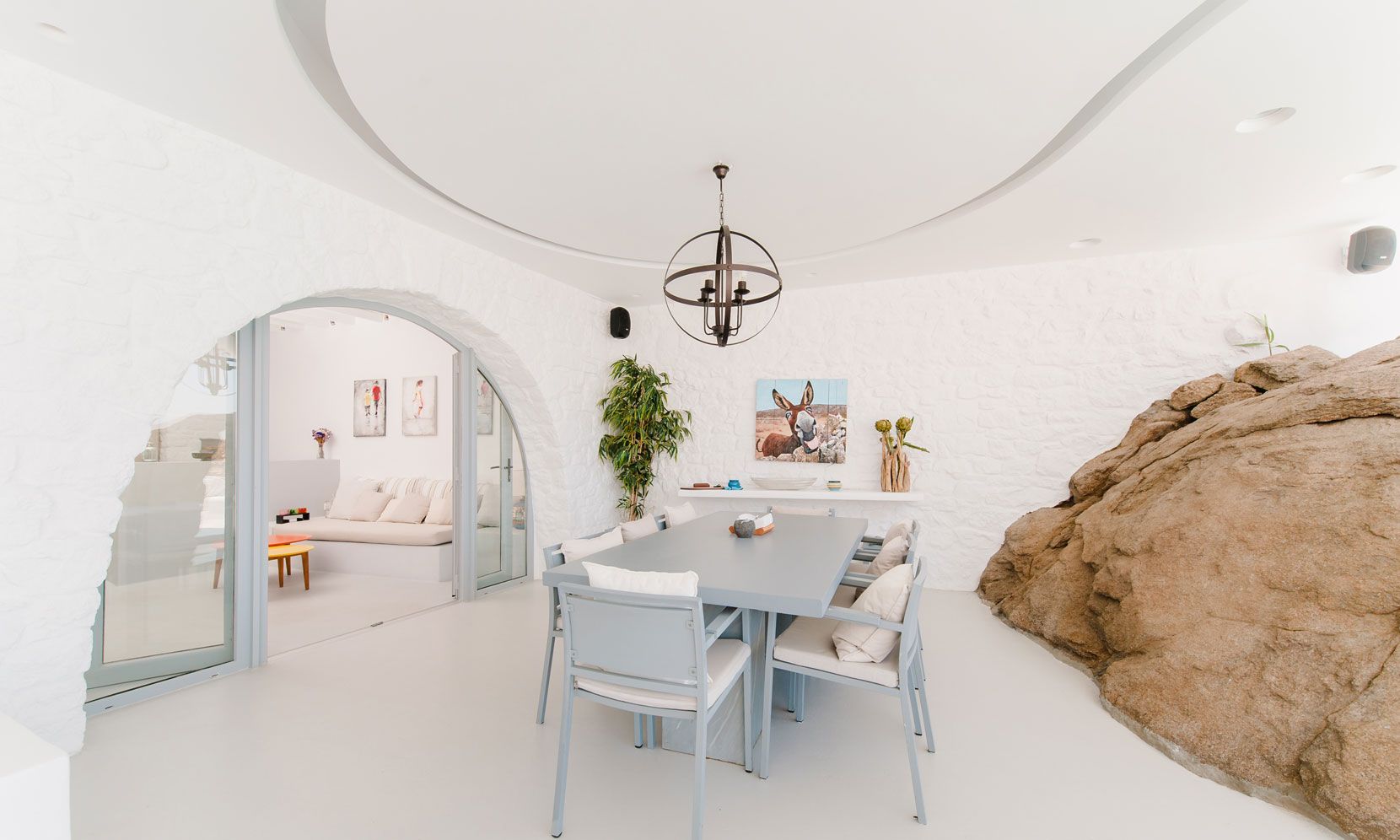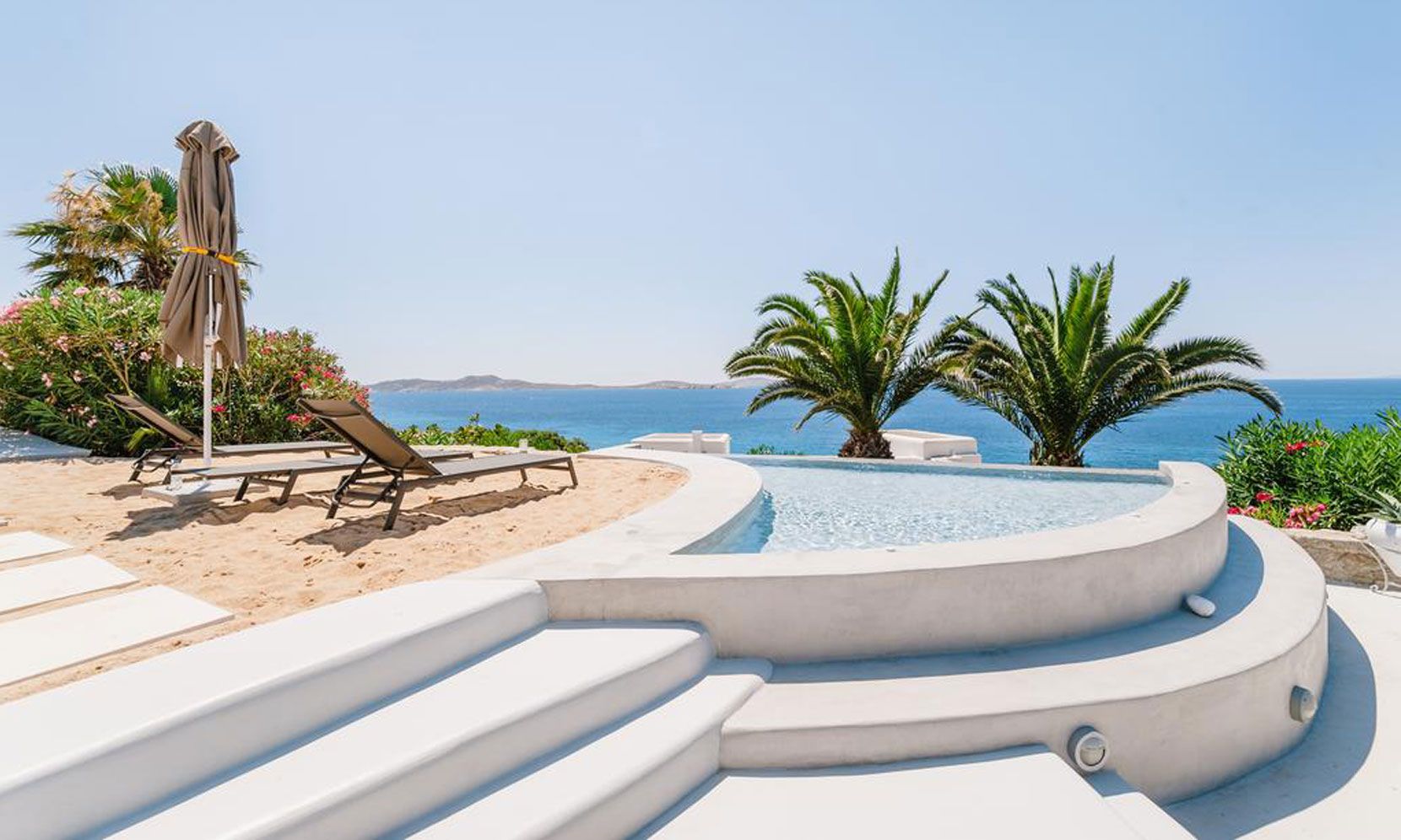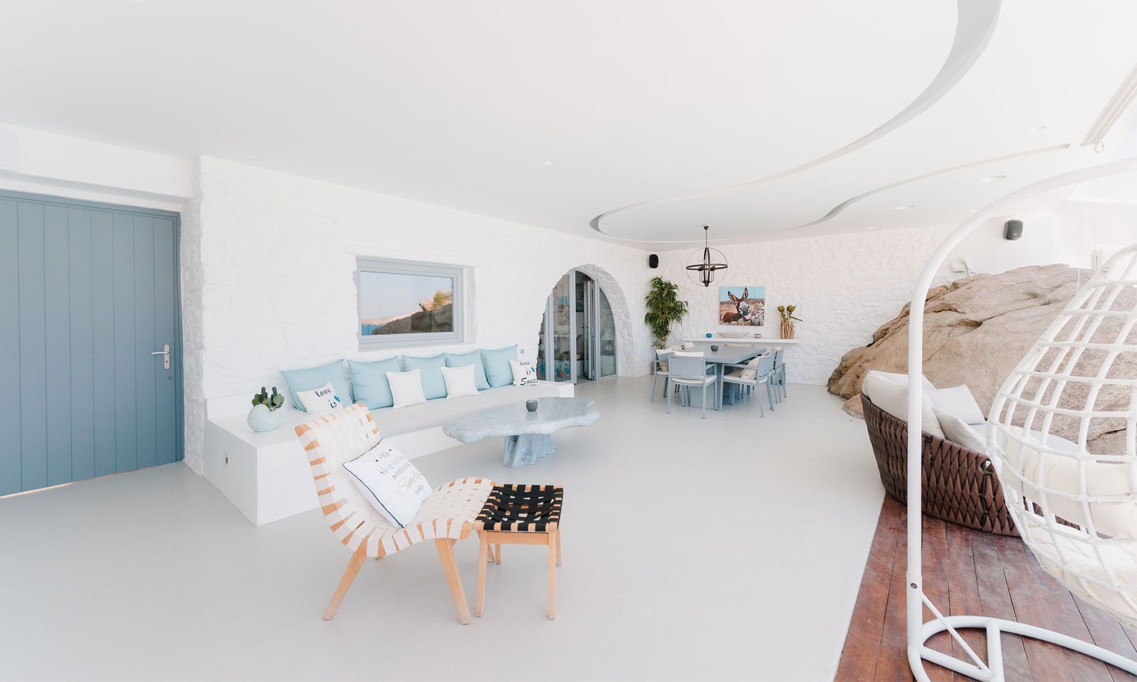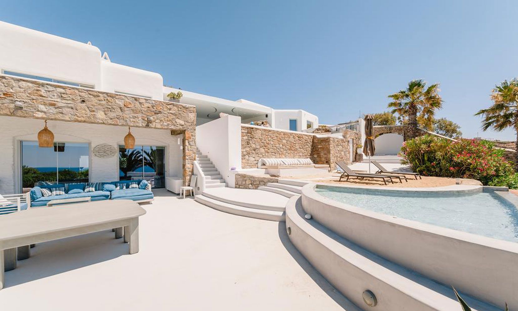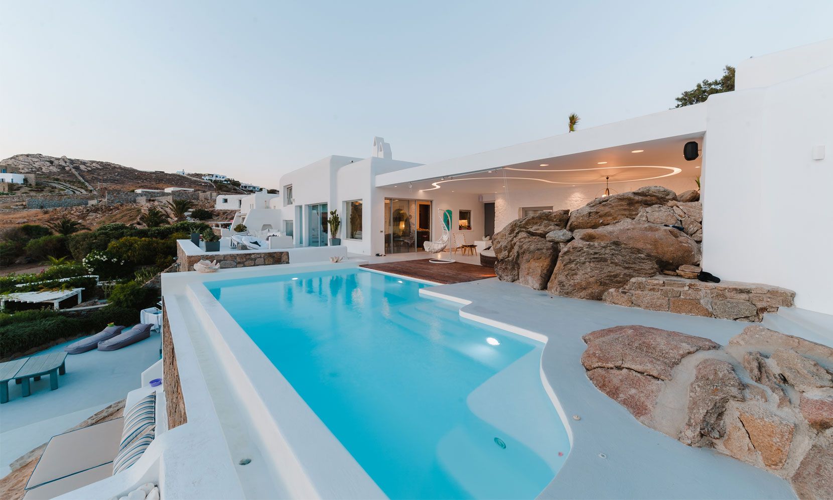 The interior villa, dressed in white and combining contemporary design with art and lux, is a cross-section of traditional and modern Cycladic architecture. All its indoor areas, overlooking the pool and the sea, are decorated in highest of standards with elegant furniture.