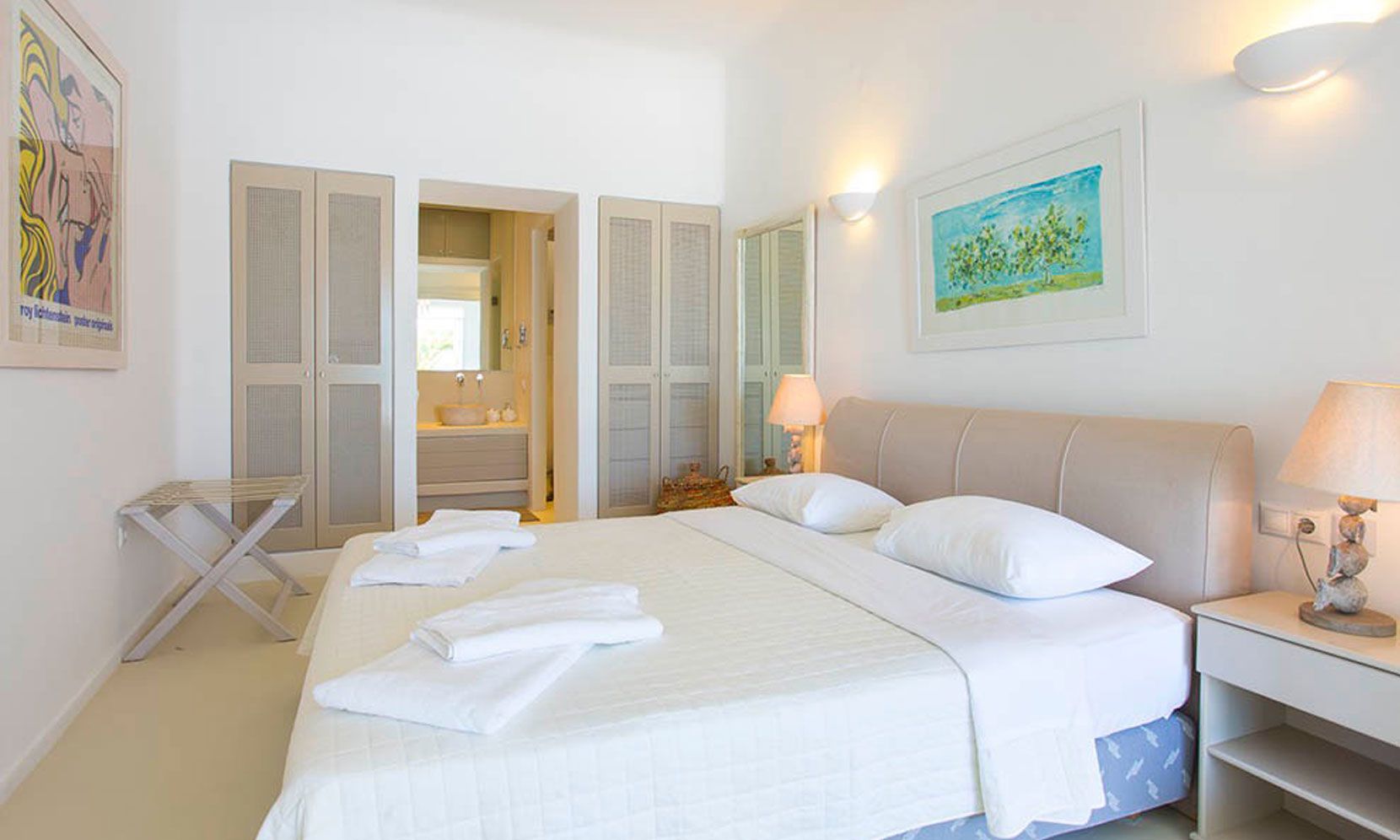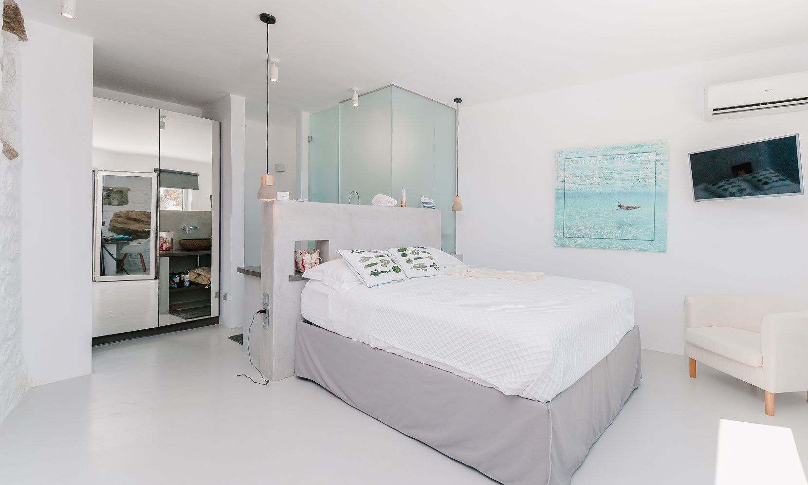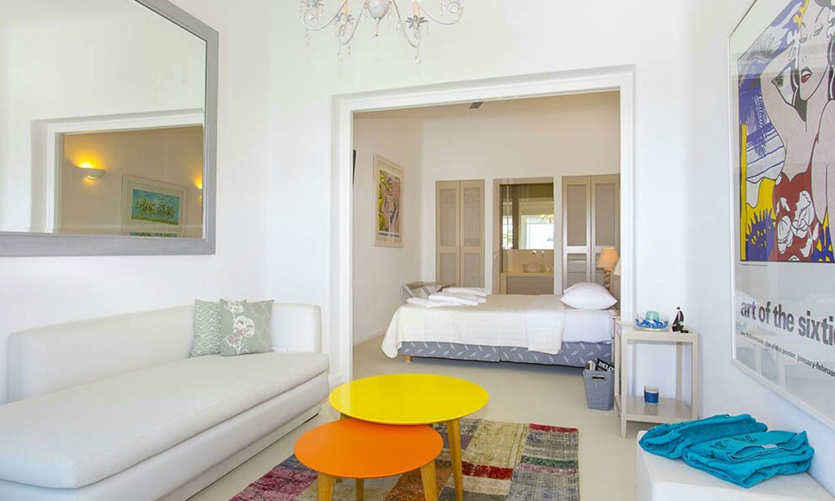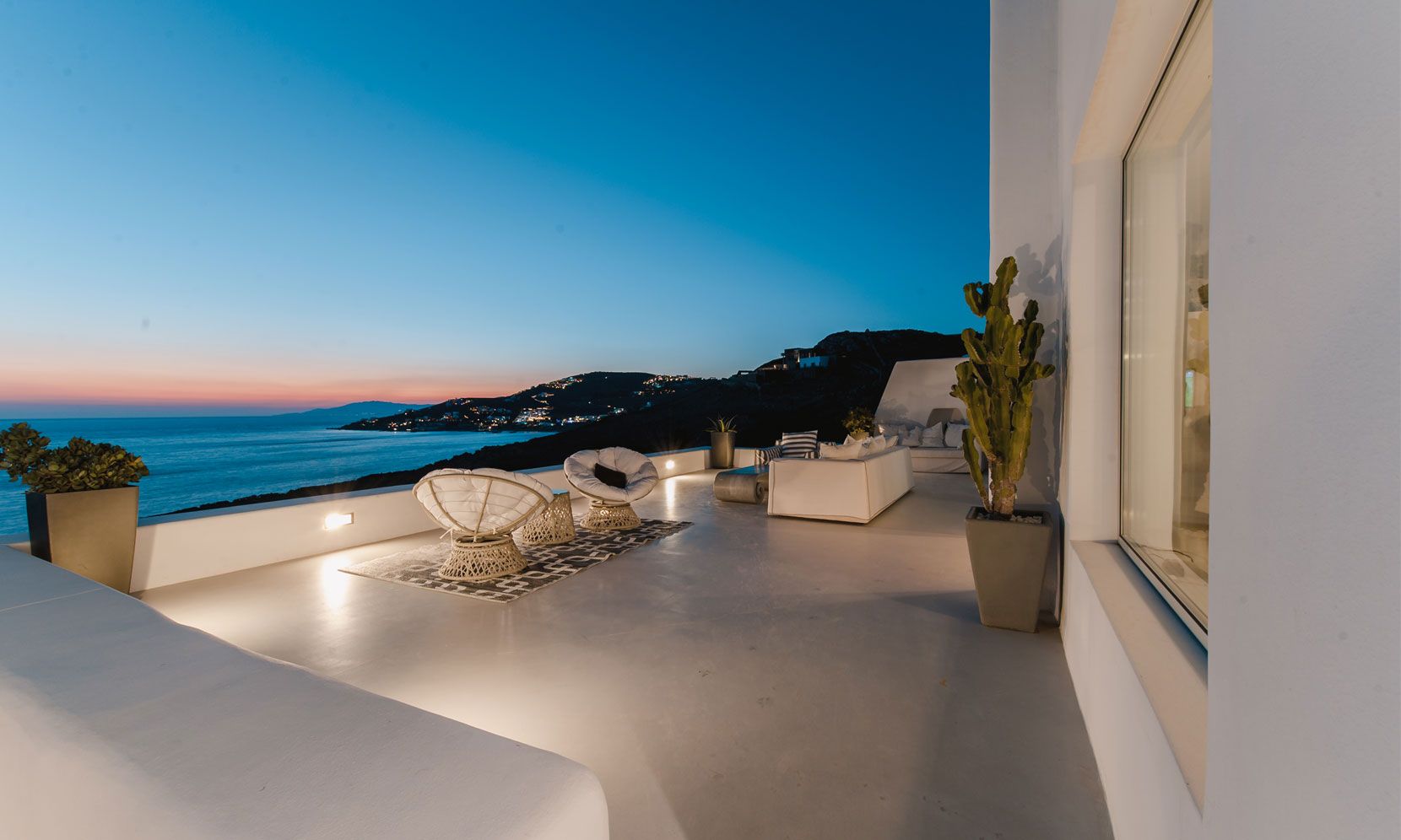 The interior villa, dressed in white and combining contemporary design with art and lux, is a cross-section of traditional and modern Cycladic architecture. All its indoor areas, overlooking the pool and the sea, are decorated in highest of standards with elegant furniture.