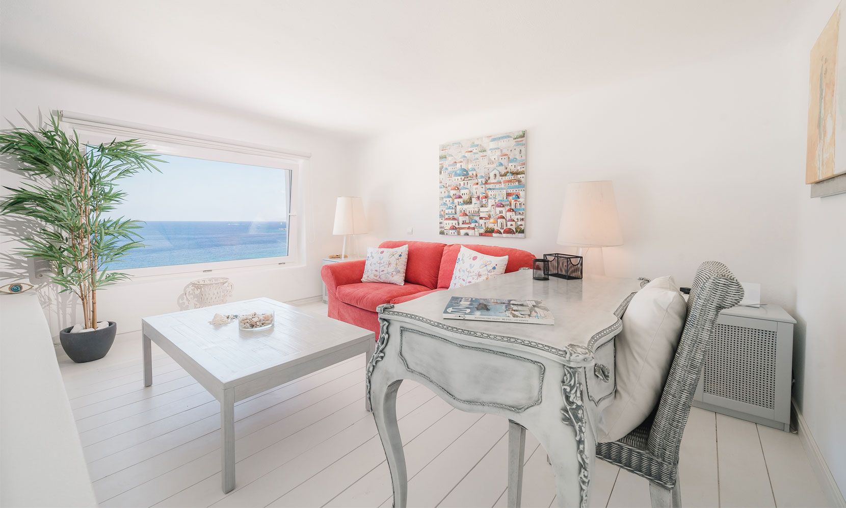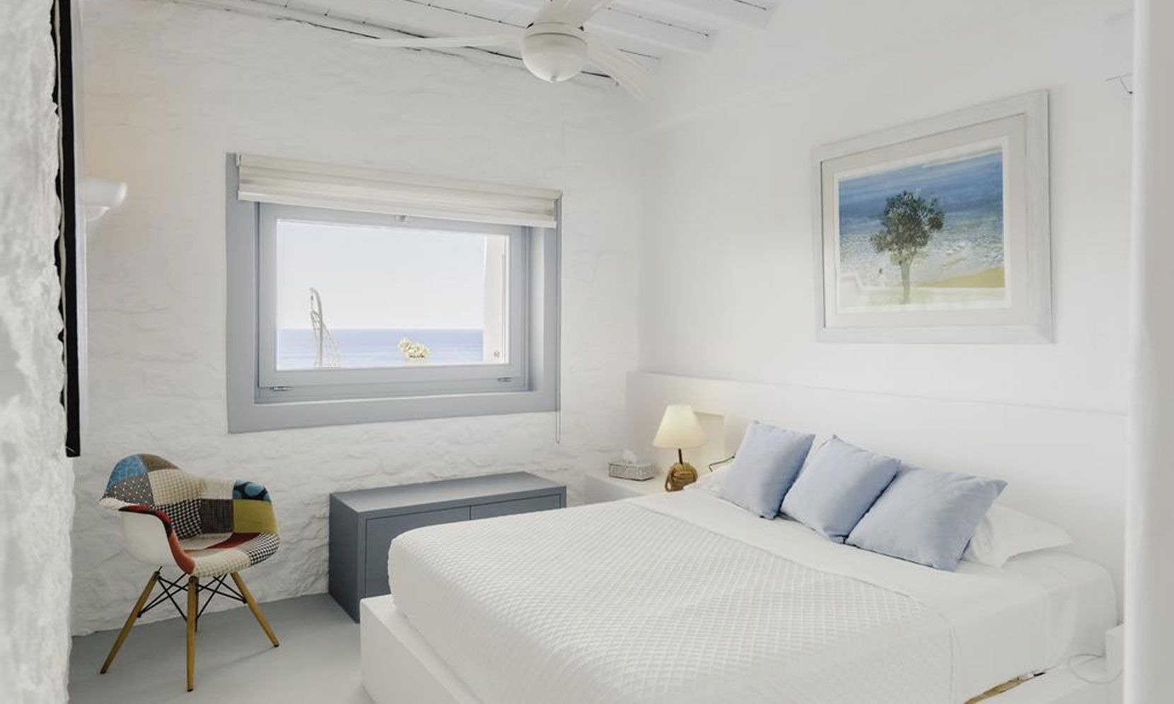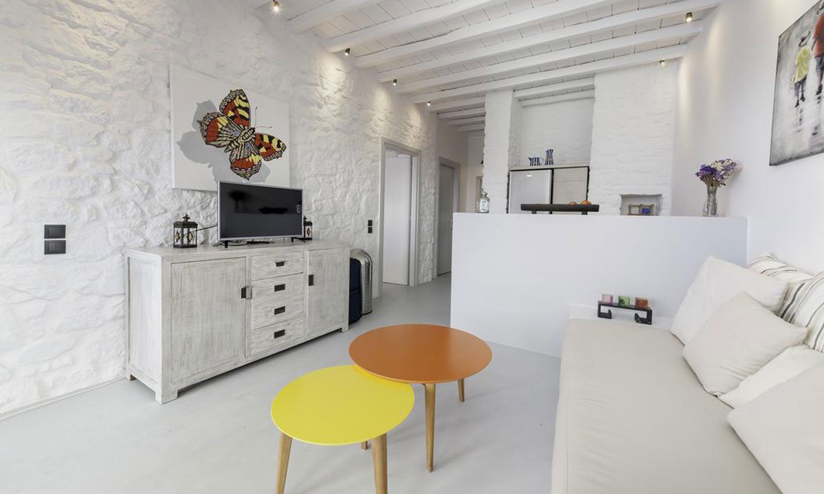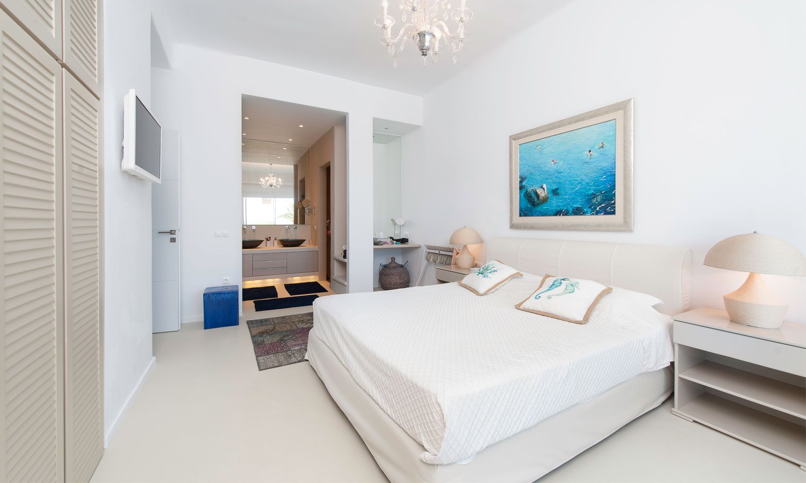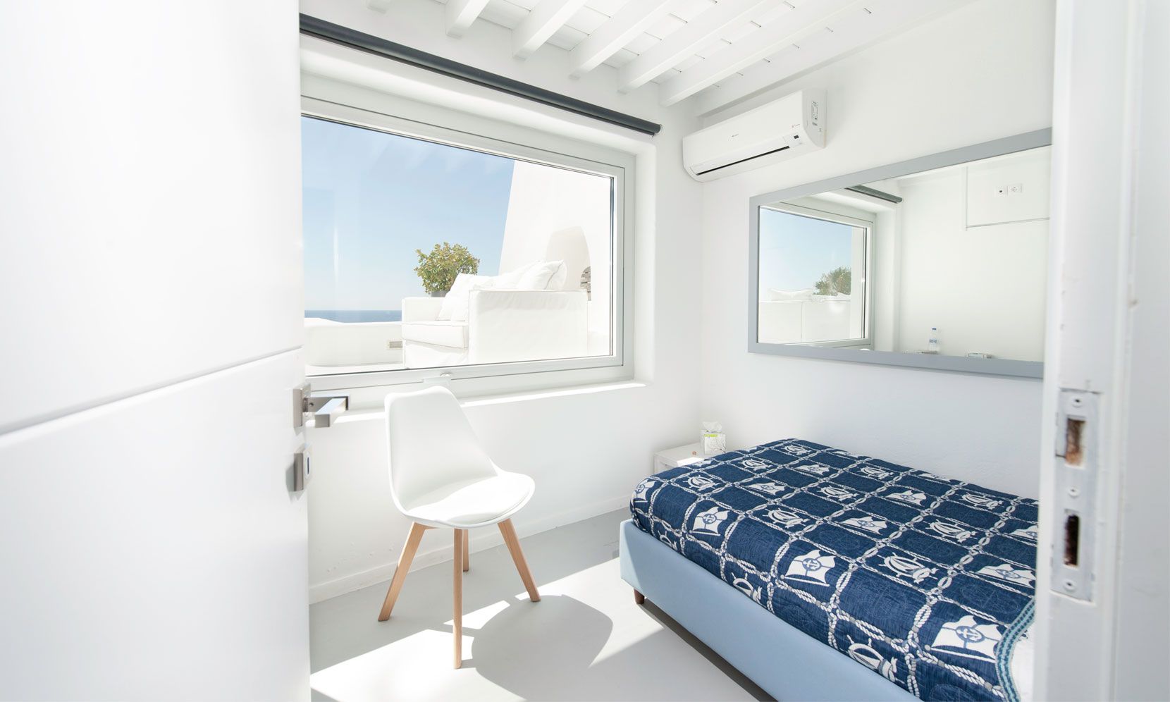 The interior villa, dressed in white and combining contemporary design with art and lux, is a cross-section of traditional and modern Cycladic architecture. All its indoor areas, overlooking the pool and the sea, are decorated in highest of standards with elegant furniture.