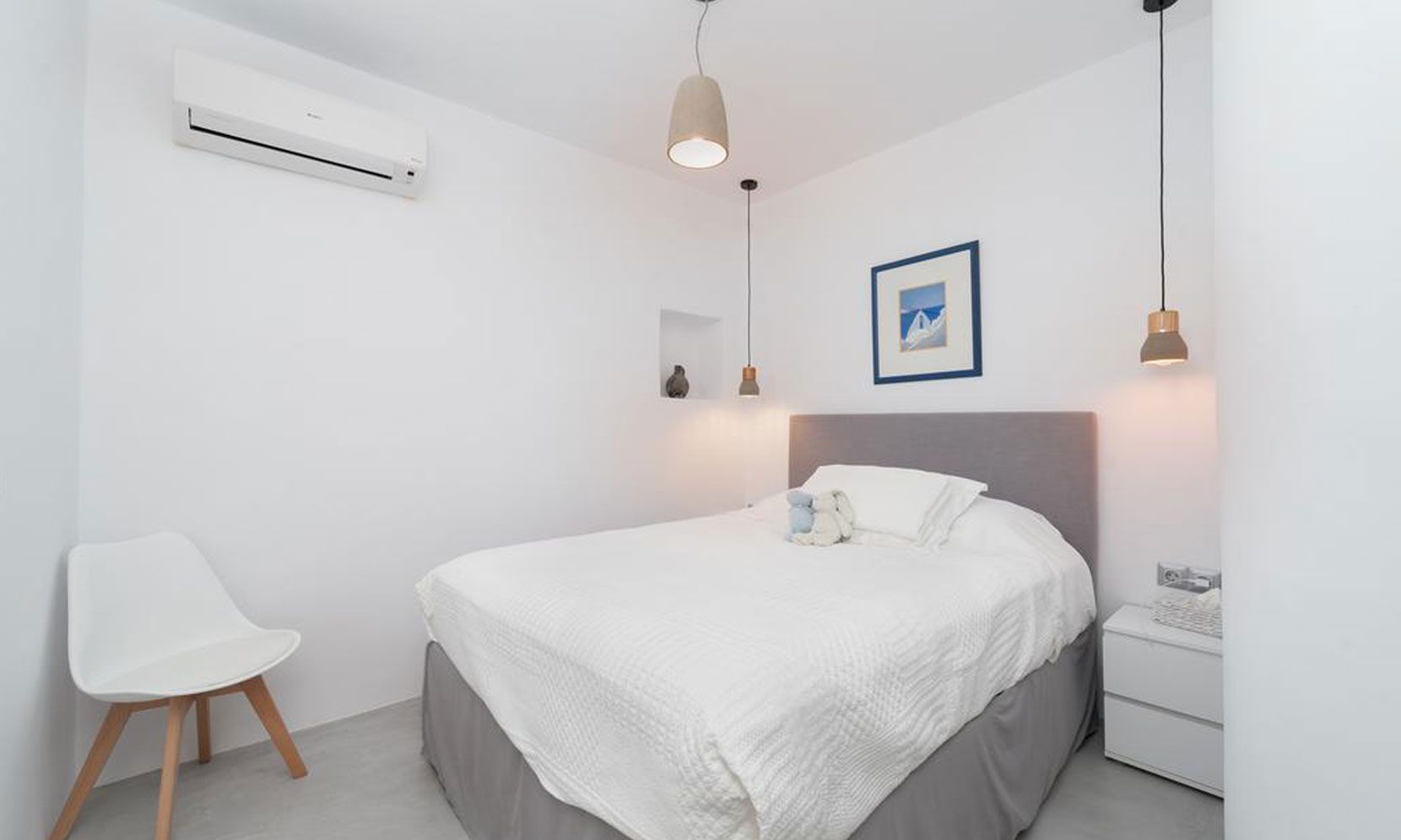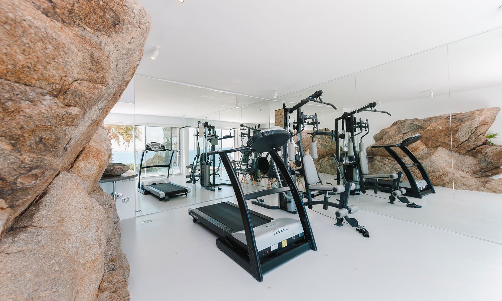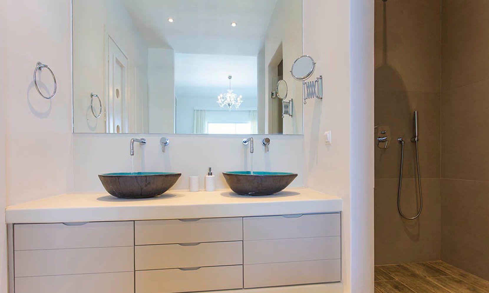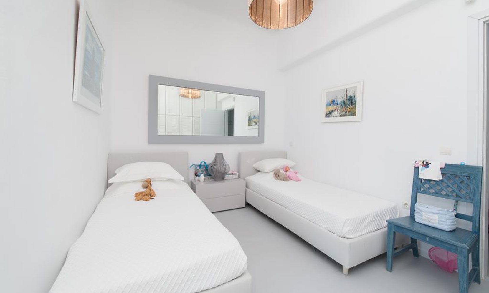 The interior villa, dressed in white and combining contemporary design with art and lux, is a cross-section of traditional and modern Cycladic architecture. All its indoor areas, overlooking the pool and the sea, are decorated in highest of standards with elegant furniture.