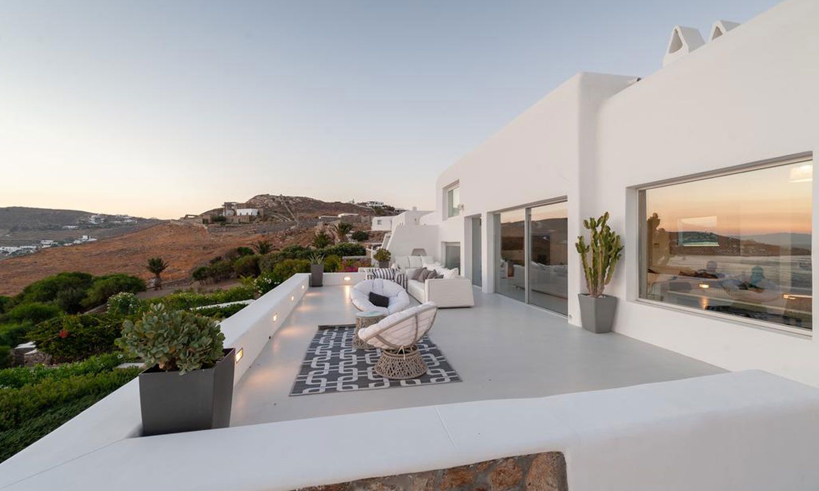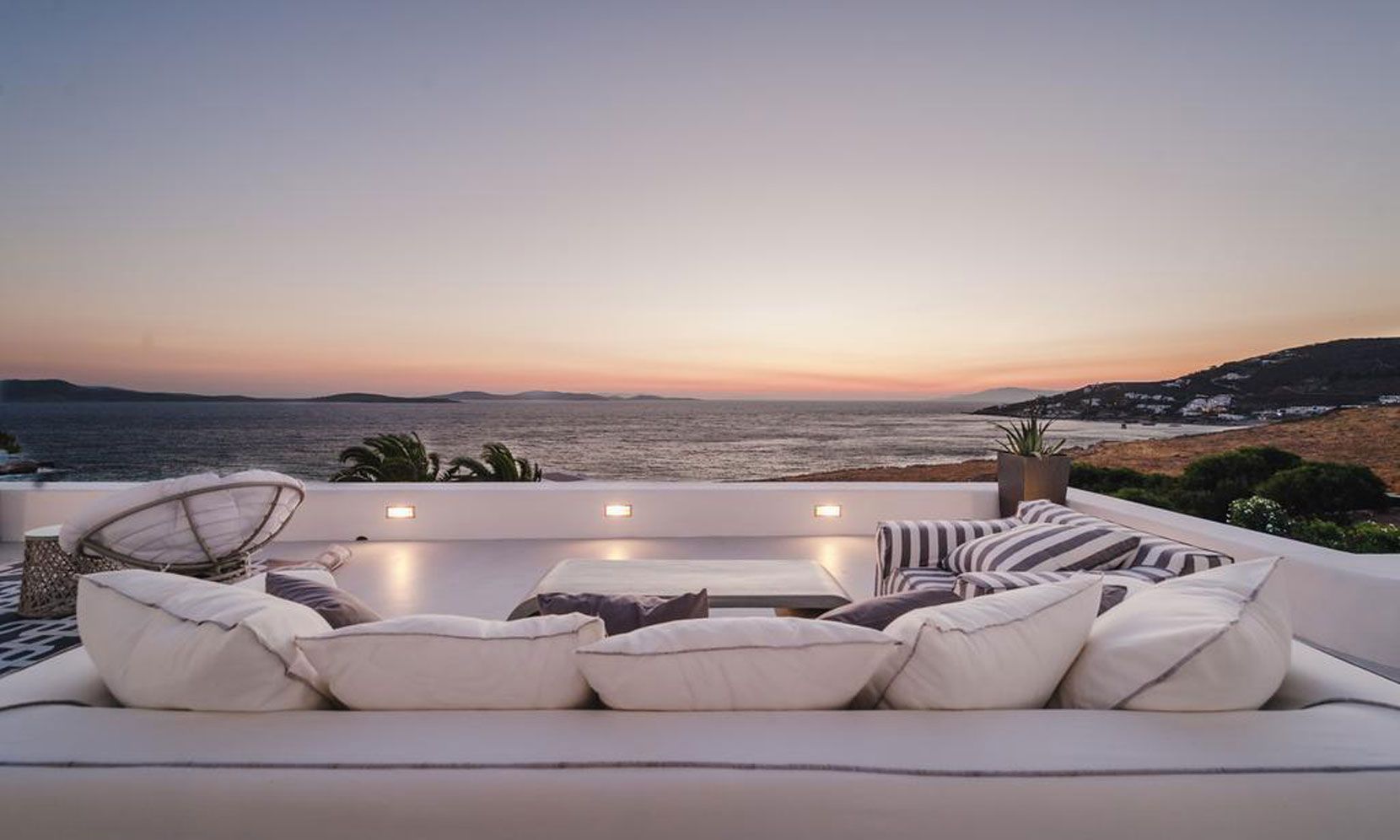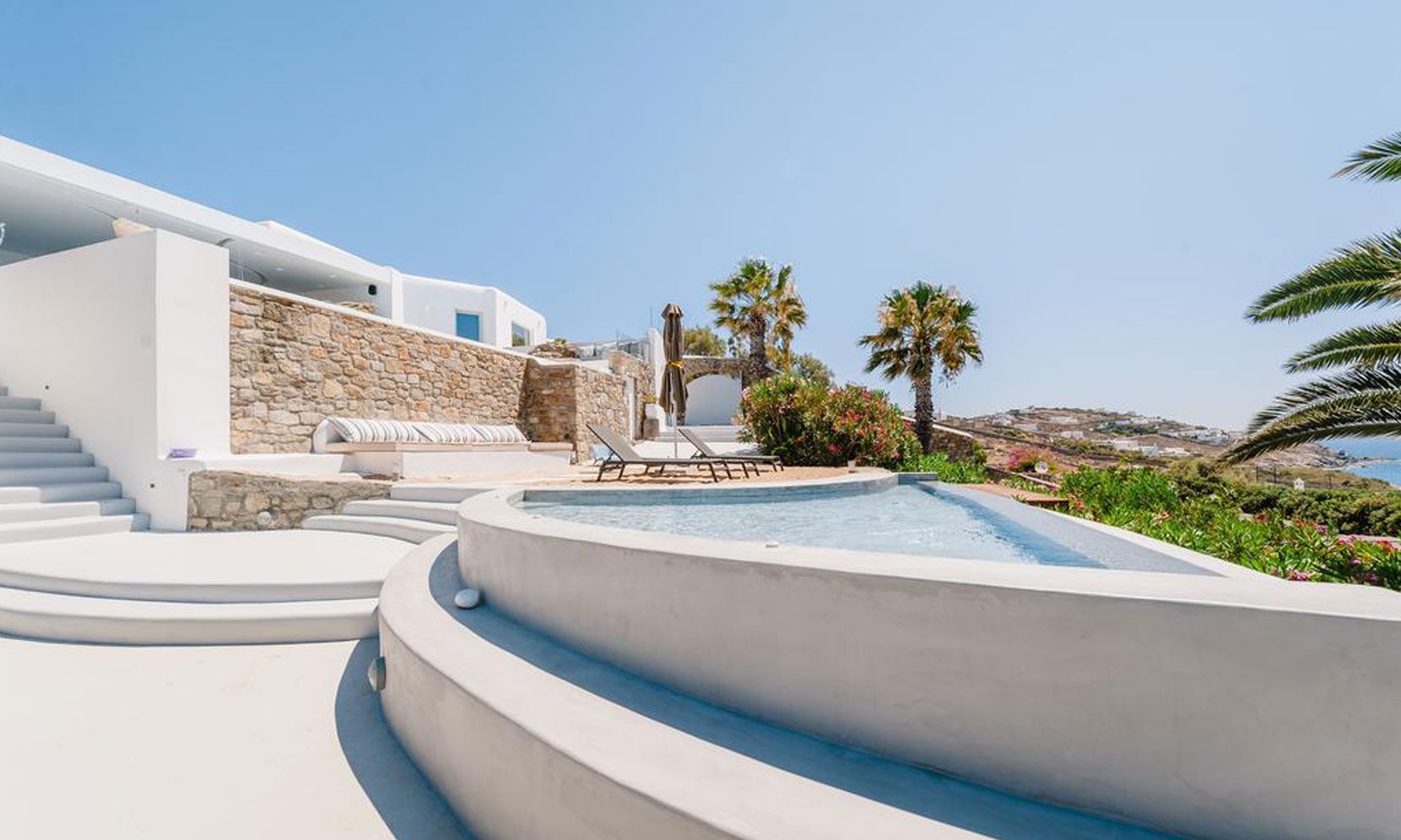This magnificent villa, offering its guests a breathtaking sea view, is located opposite to the ancient island of Dilos and is sheltered almost by all Mykonian winds. It consists of spacious living areas, terraces and an infinity swimming pool with relaxing sunbeds. Its’ residents and visitors will experience the most astonishing sunsets of their life and feel like “Heaven is on Earth”.