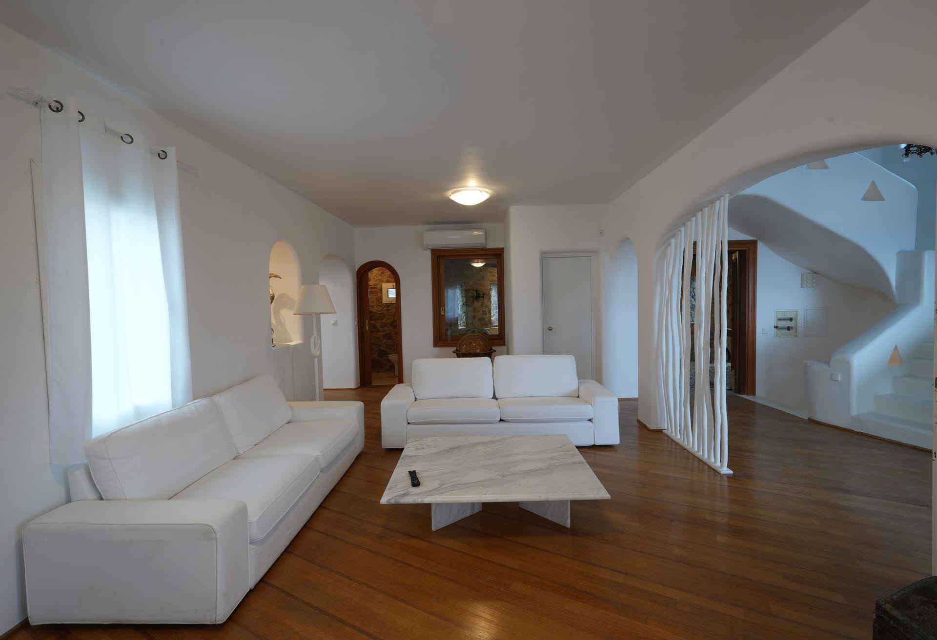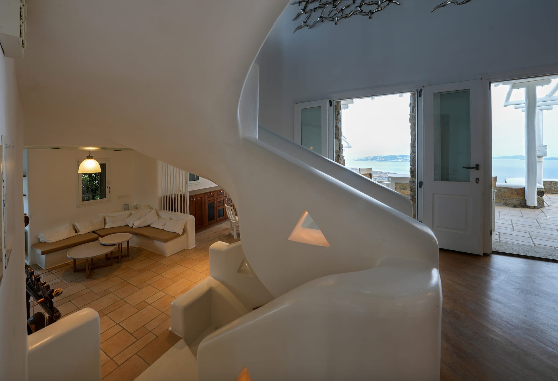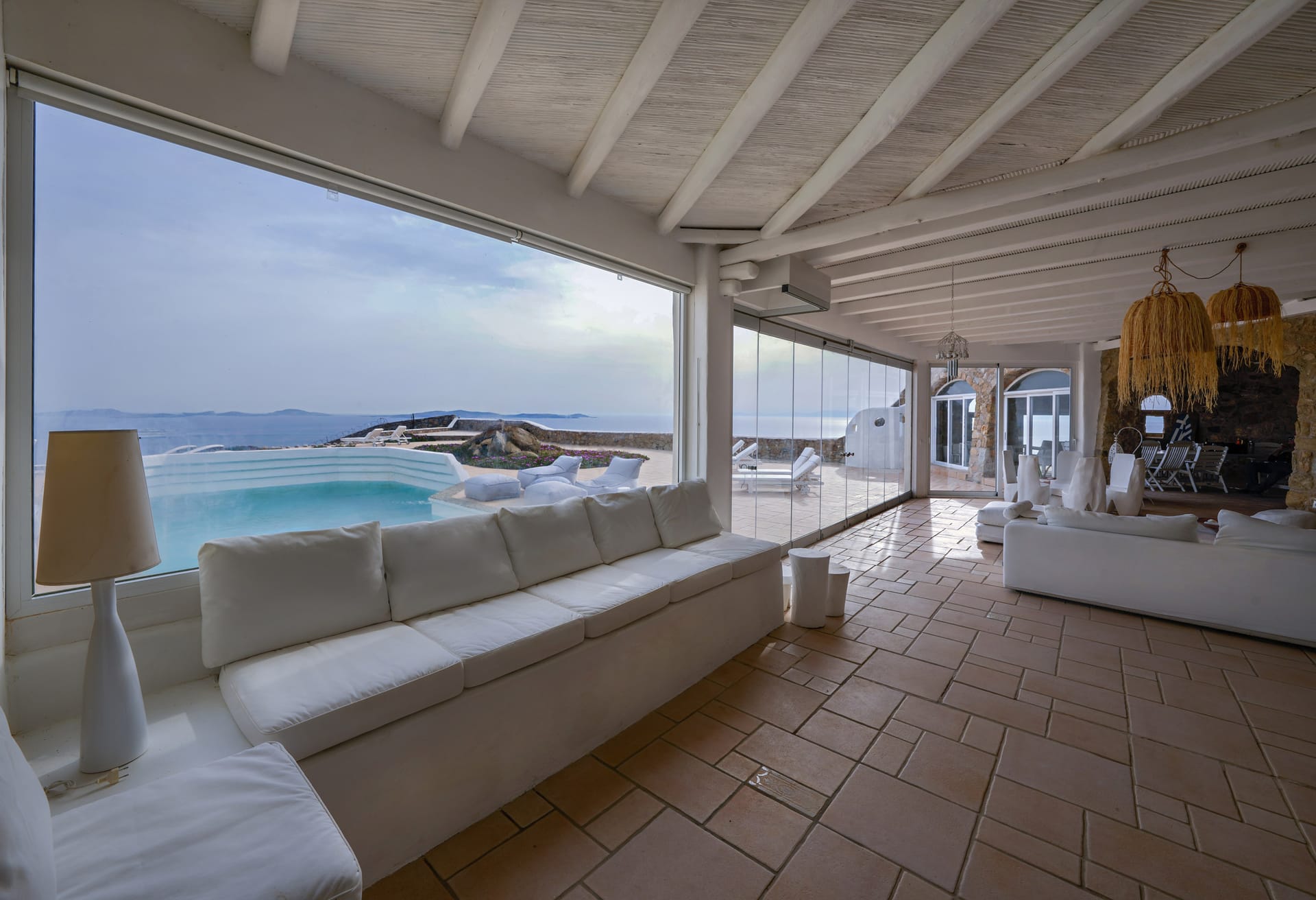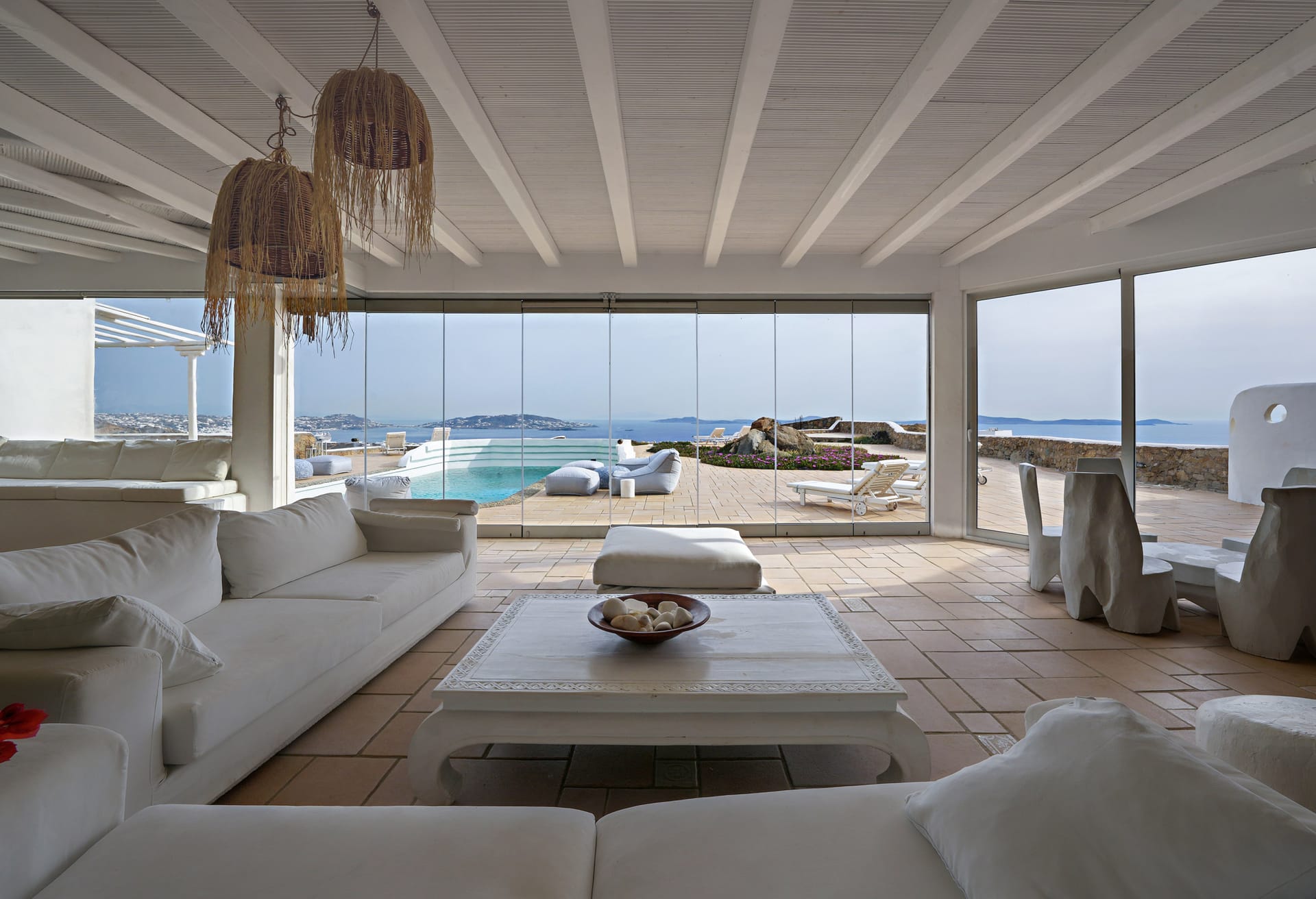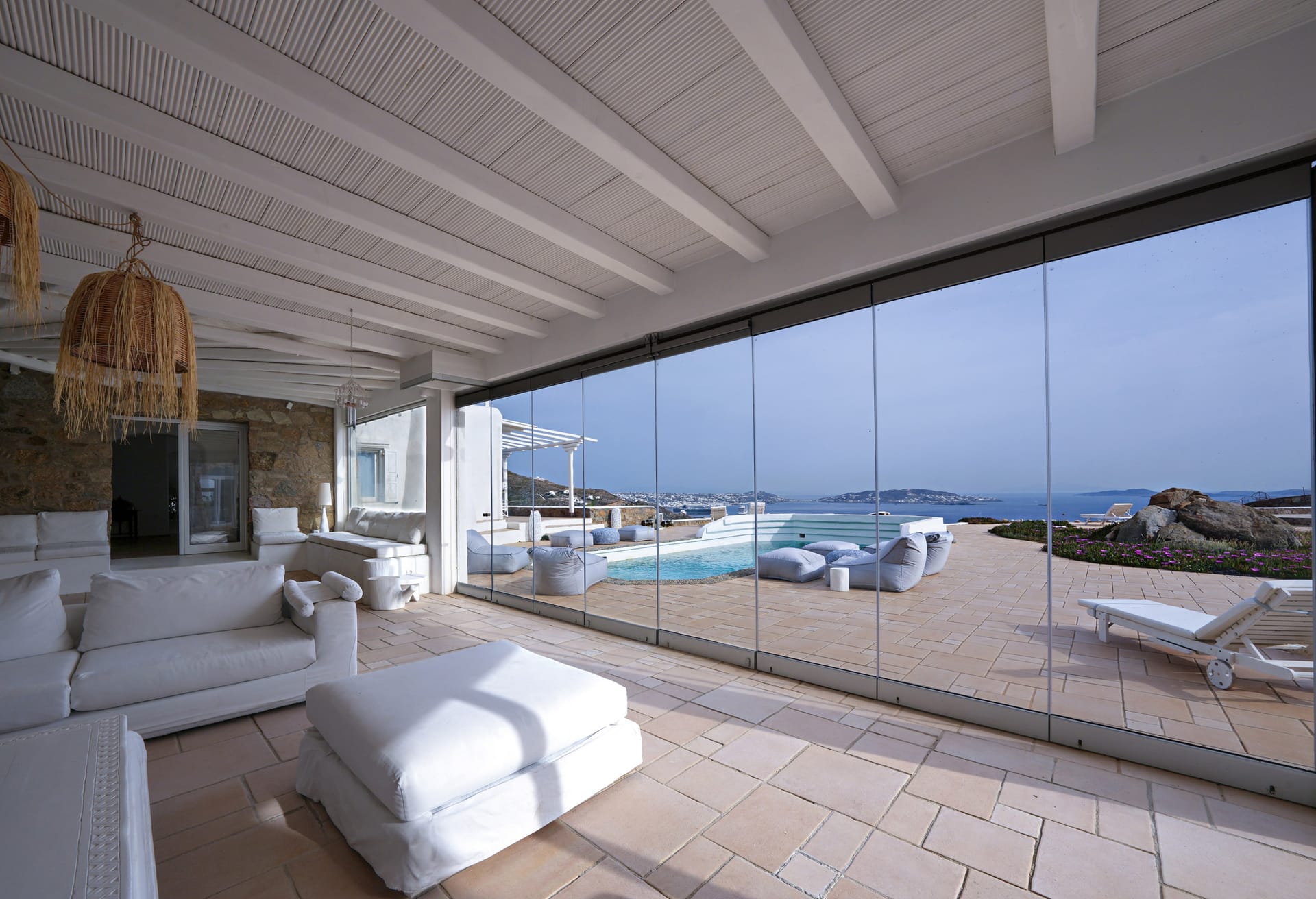 Mykonos Villa Helios interiors reflect the aura of Mykonos island and are spread in three levels which combine tradition, high aesthetics and large common spaces.